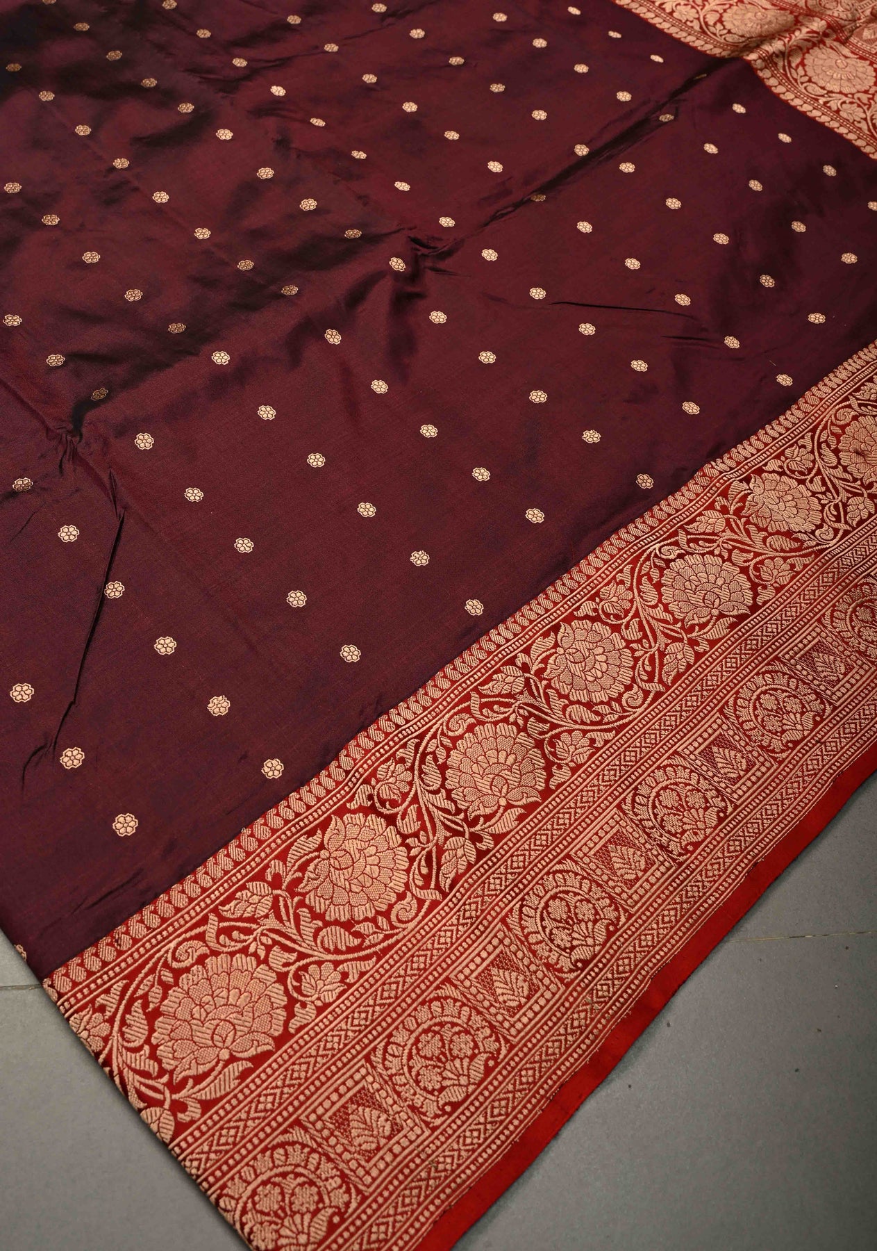 Embrace classic elegance with this Maroon Katan Silk Handloom Saree, beautifully adorned with traditional Chunri buttis that bring a rhythmic charm to its surface. Woven from Katan silk, the saree exudes a natural sheen and fluid drape that speaks of fine handloom craftsmanship. The maroon hue is enhanced by a striking contrast zari border, adding a regal finish and timeless appeal.
