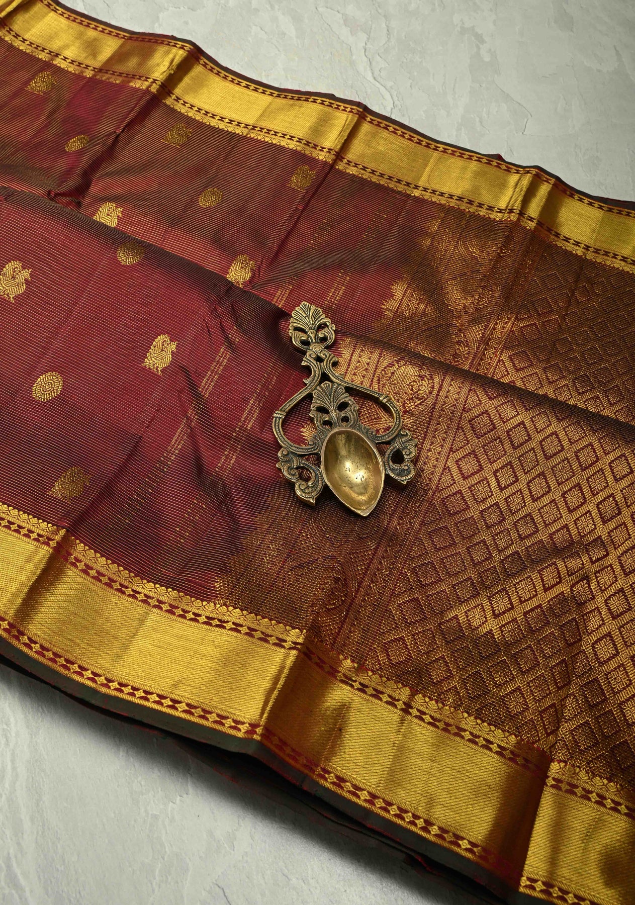 The Maroon Vairaoosi Zari Stripes on Kanjivaram Pure Silk Handloom Saree is a stunning fusion of heritage and luxury. Crafted with the Kanjivaram silk, this saree features elegant Vairaoosi zari stripes that run across the fabric, creating a striking pattern of understated glamour. The intricate zari buttas scattered across the body of the saree enhance its regal charm, while the rich zari border adds an extra layer of opulence. The maroon color adds warmth and richness, making this saree perfect for weddings, festive occasions, or grand celebrations, where you want to make a lasting impression with classic beauty and intricate craftsmanship.