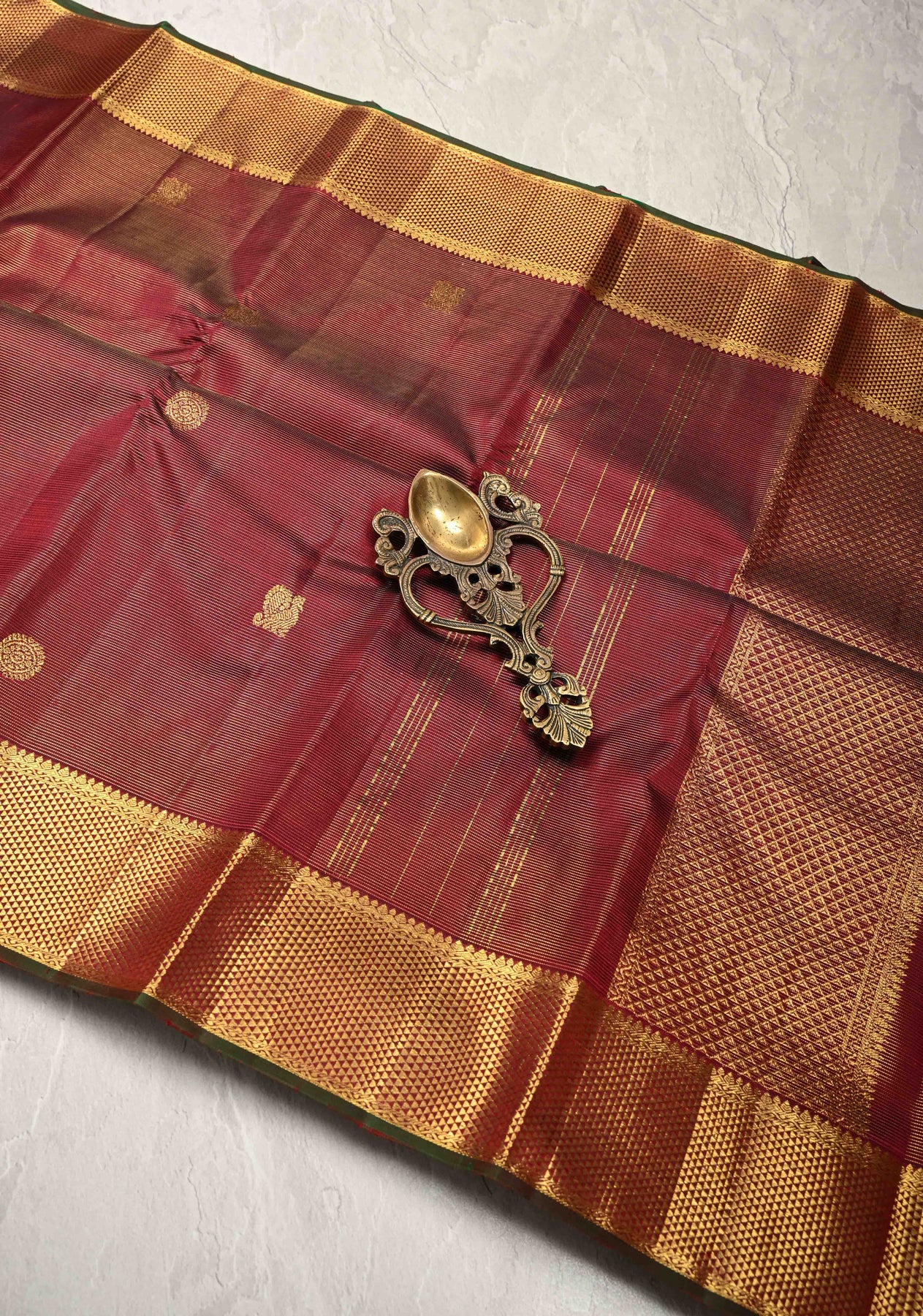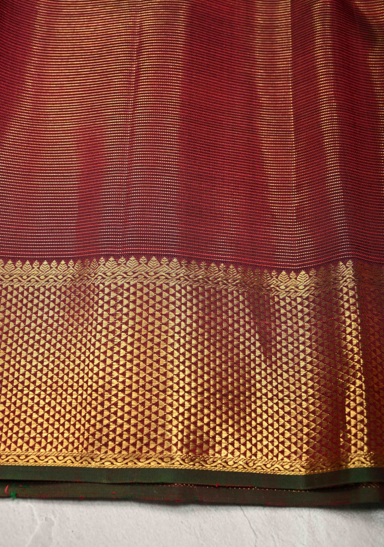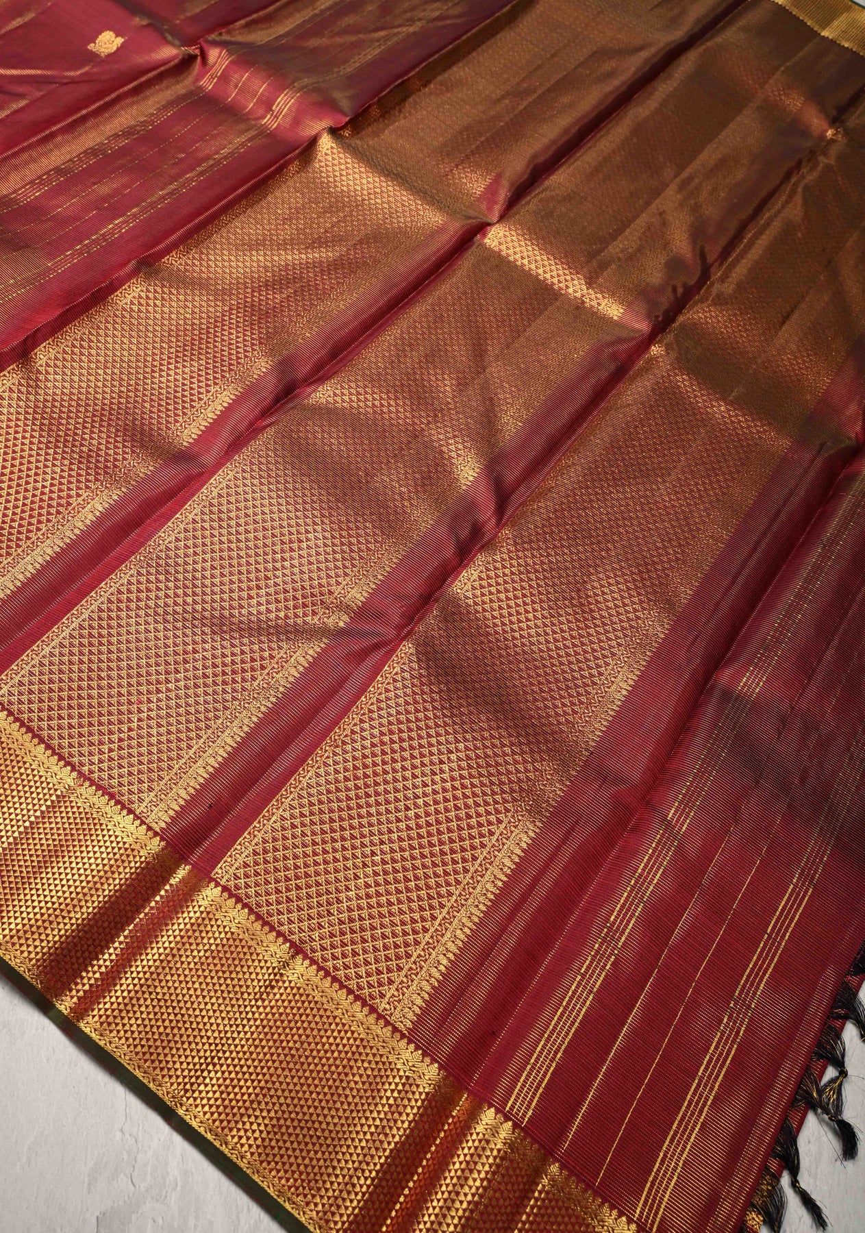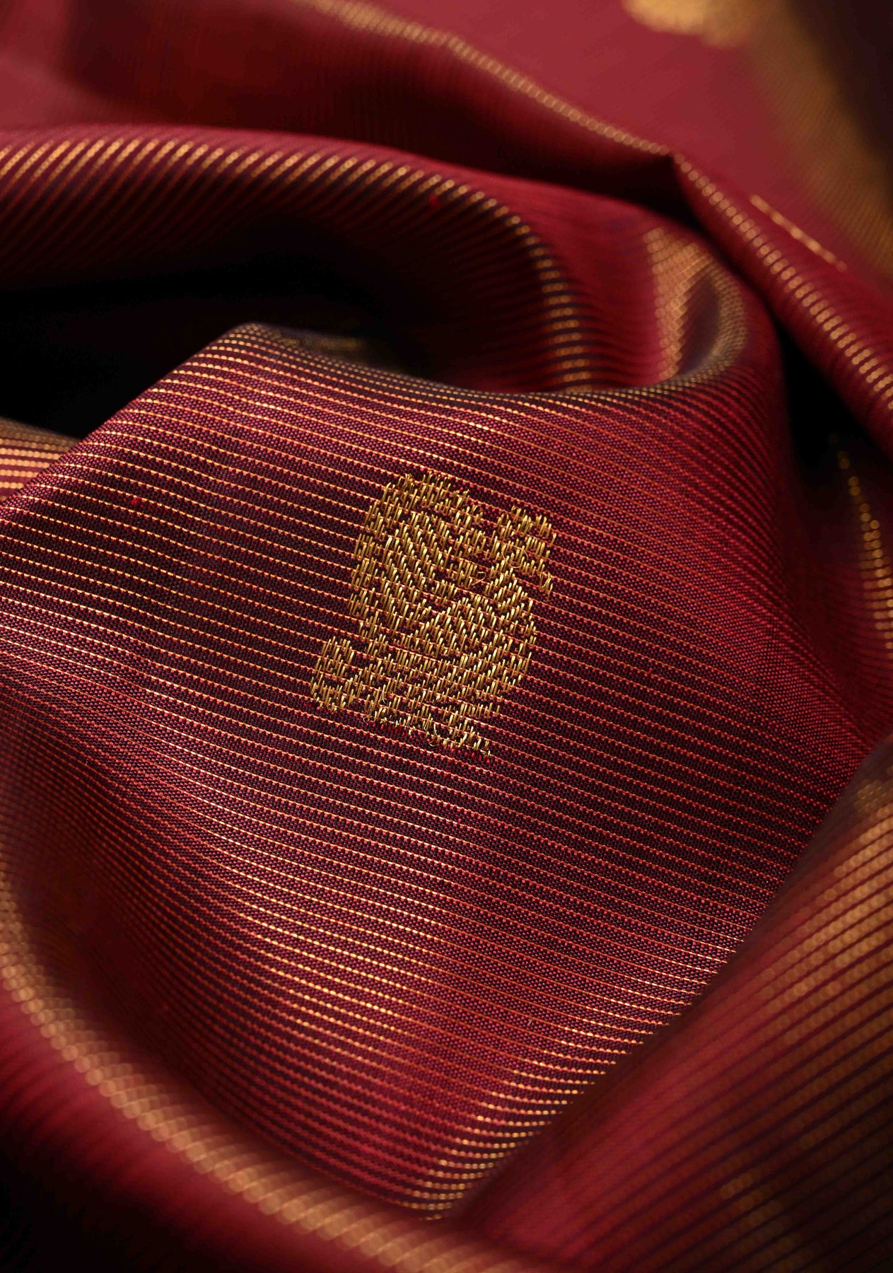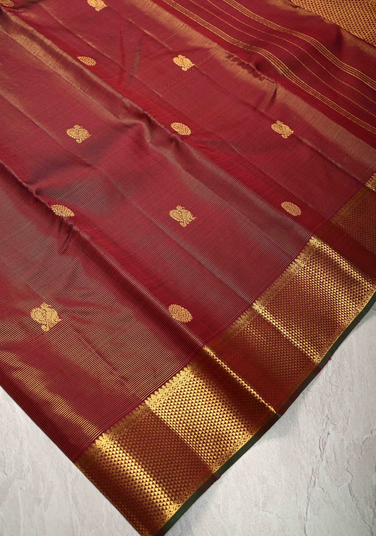 Deep Maroon Vairaoosi Zari Stripes on Kanjivaram Pure Silk Saree with Zari Buttas and Biscuit Zari Border | SILK MARK CERTIFIED