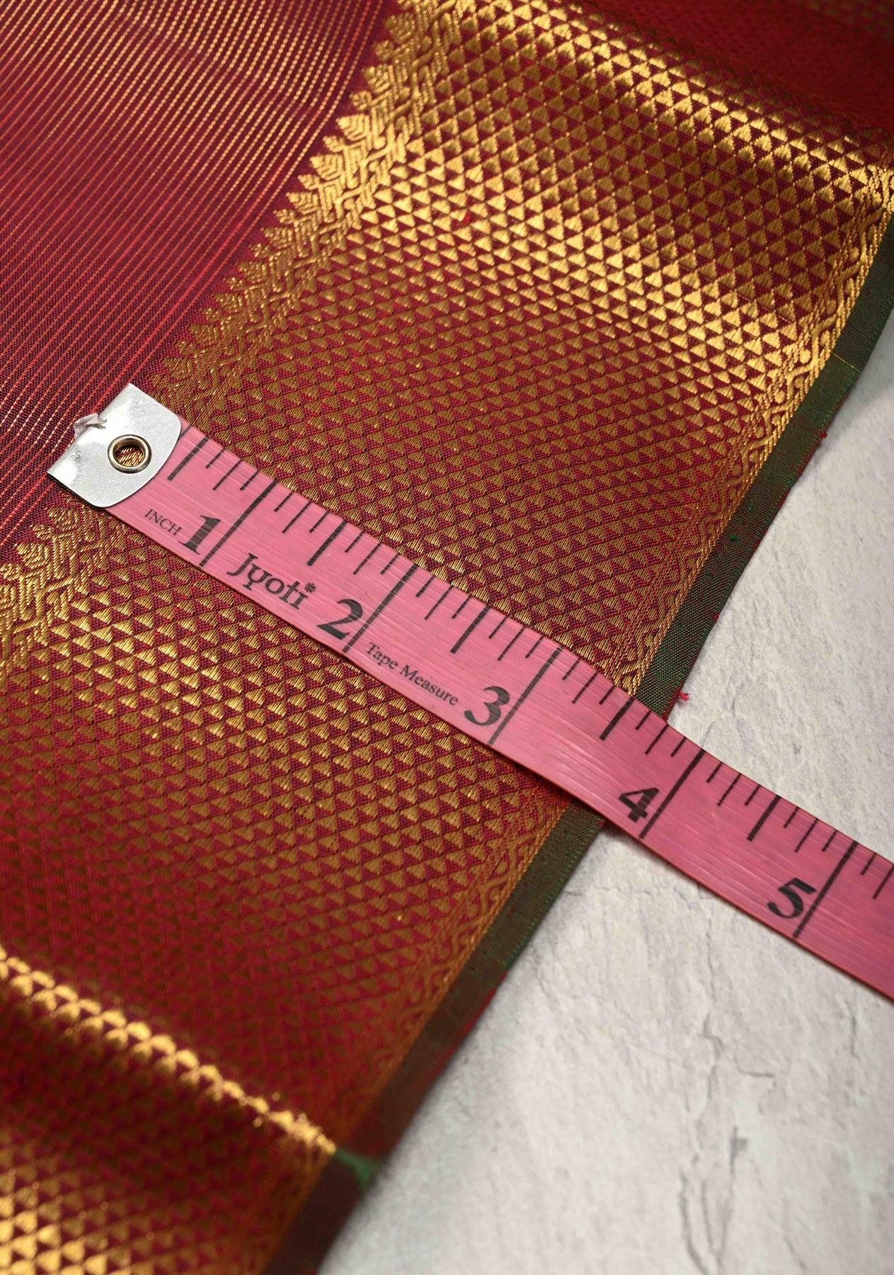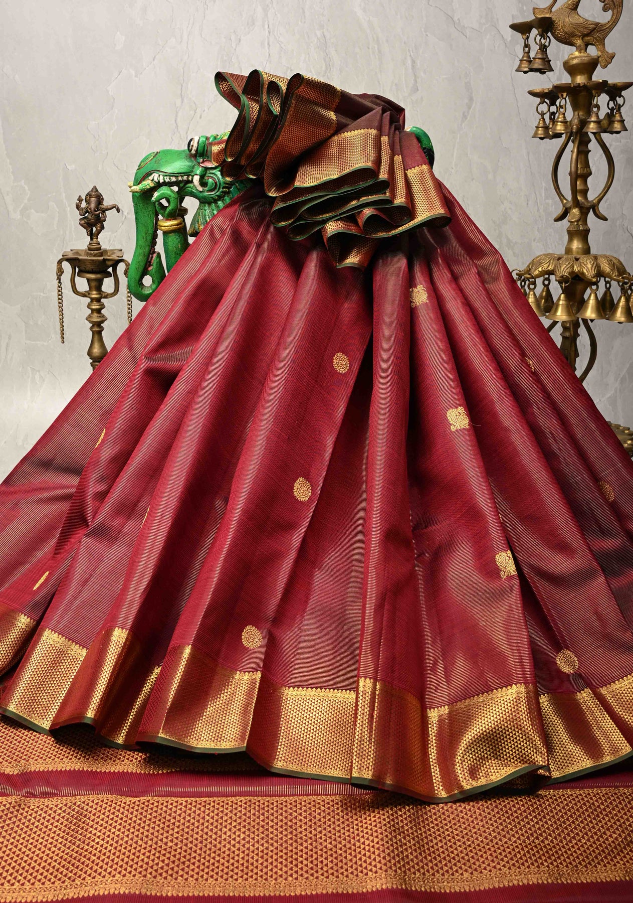 The saree’s broad zari border is meticulously crafted with traditional patterns, adding a majestic frame that perfectly complements the body. This border features intricate floral and geometric designs in gold zari, which contrast elegantly against the maroon silk, creating a striking visual appeal. The rich texture of the pure silk combined with the finesse of the zari work makes this saree an exquisite choice for weddings, festivals, and other special occasions where tradition meets sophistication