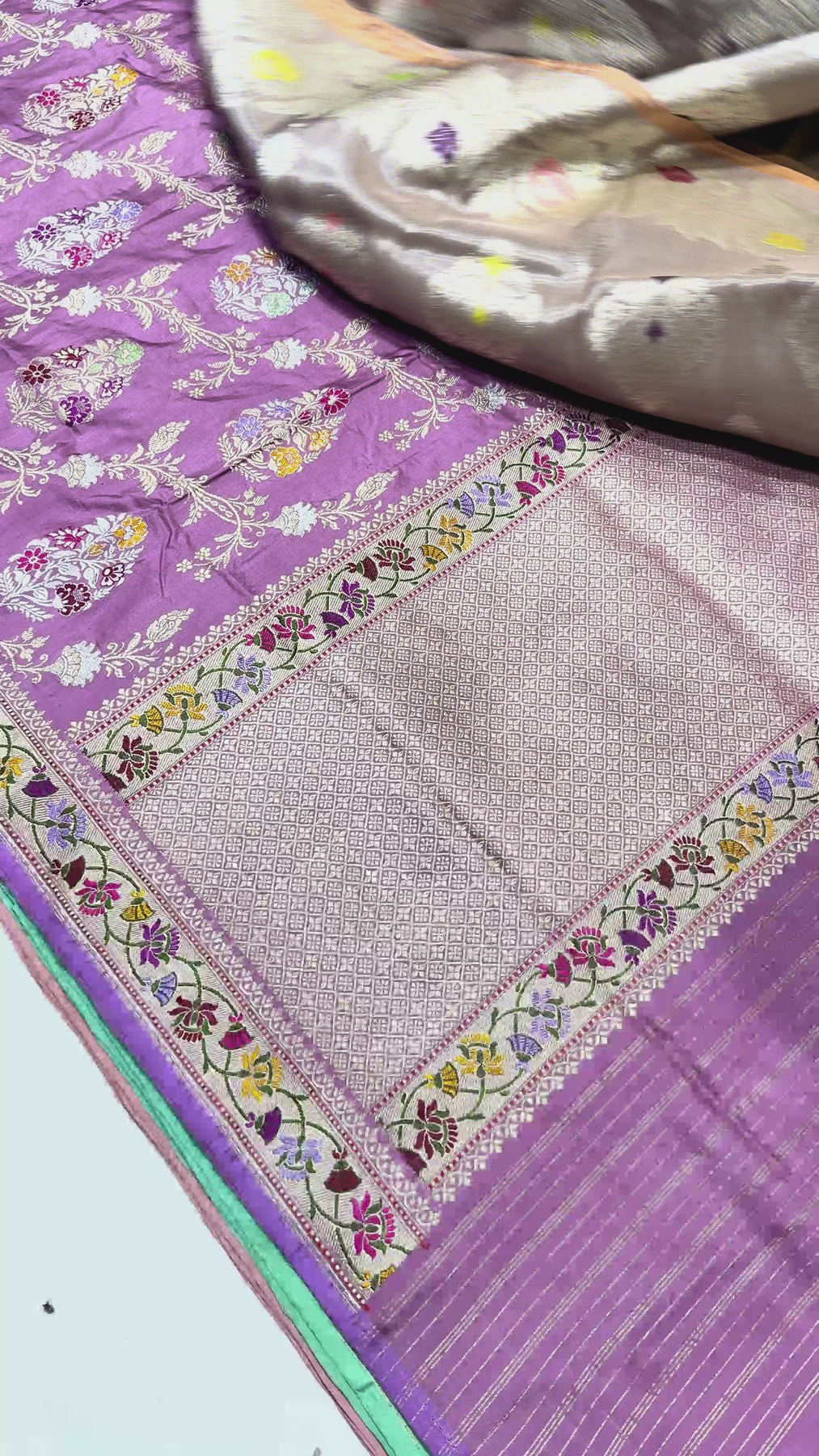Drape yourself in timeless elegance with this Mauve Banarasi Tissue Silk Saree, a masterpiece of intricate craftsmanship. The saree features a luxurious Kadhuwa Sona Rupa Jungla—a dense gold and silver floral jaal—elevated by delicate Meenakari buttas that add vibrant color accents. Woven on a luminous, feather-light tissue silk base, it offers both grace and grandeur. The look is exquisitely framed with a Paithani-inspired border, blending the richness of two heritage weaves. Perfect for weddings, festive occasions, or heirloom collections, this saree is a rare fusion of Banarasi tradition and artistic finesse.