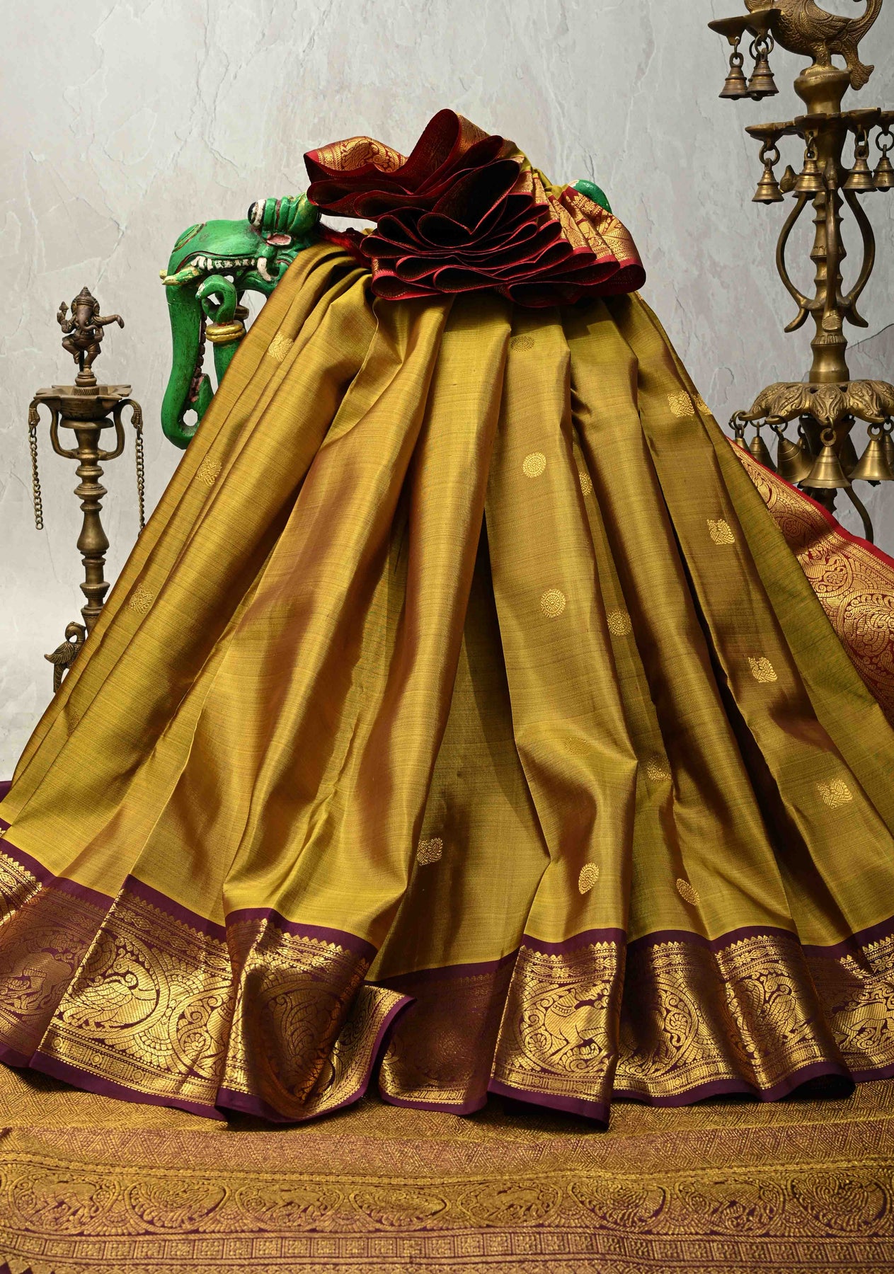 The soothing methi green body is adorned with delicate golden zari buttas, adding subtle shimmer and sophistication. Enhancing its grandeur is a contrasting Ganga Jamuna border, intricately woven to provide a vibrant and regal finish. This saree is a perfect choice for those who appreciate traditional artistry paired with a striking color combination.