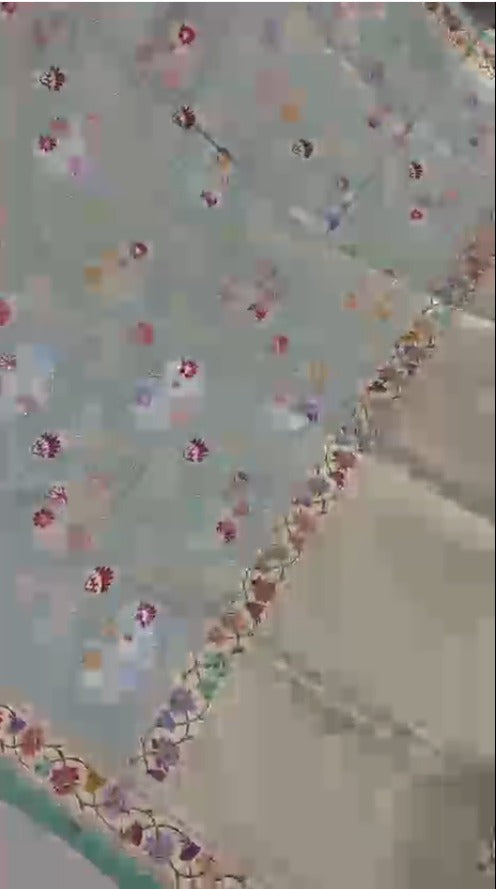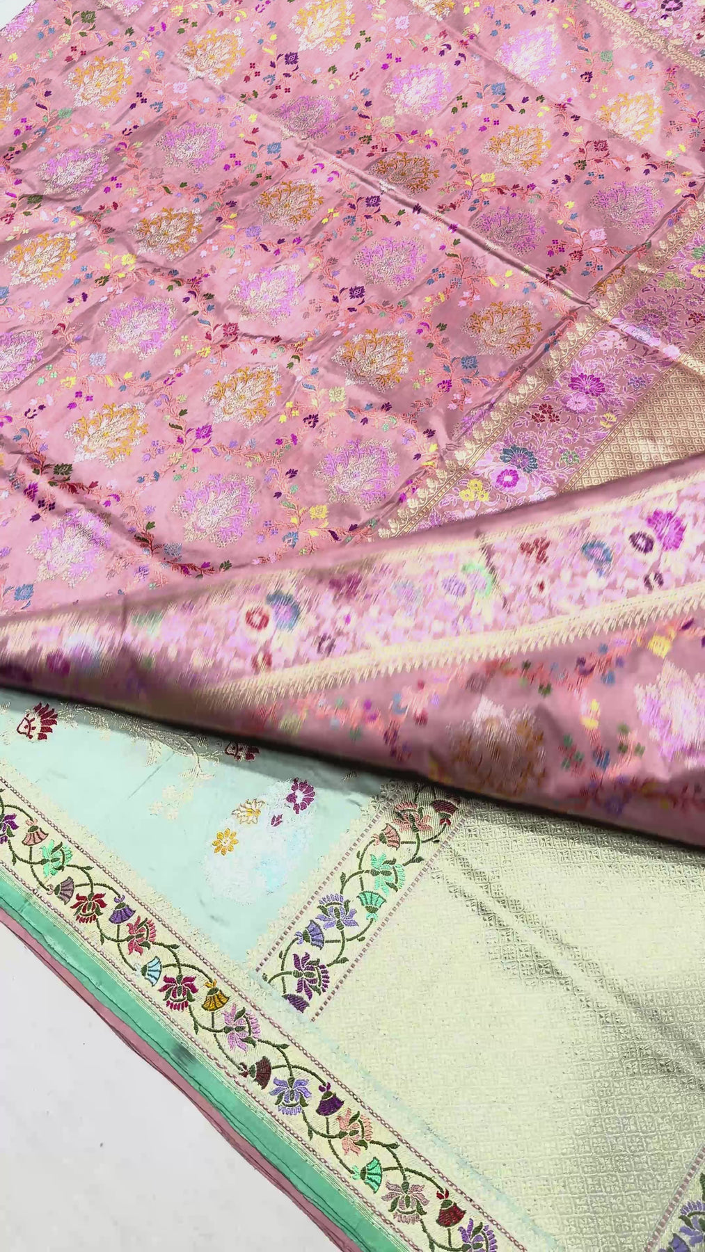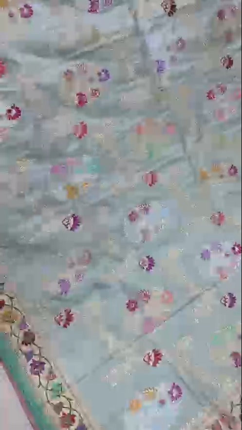 Ethereal and elegant, this Mint Green Banarasi Silk Saree is a timeless piece of handwoven luxury. Crafted using the intricate Kadhuwa technique, the saree features a resplendent Sona Rupa Jungla weave, where gold and silver threads form an opulent floral jaal across the body. Accentuated with delicate Meenakari buttas, the design adds vibrant touches of color, making it perfect for celebratory occasions. Woven on a lustrous, feather-light tissue silk base, the saree drapes with effortless grace. A finely framed border completes the look, adding structure and sophistication to this stunning blend of tradition and modern refinement.