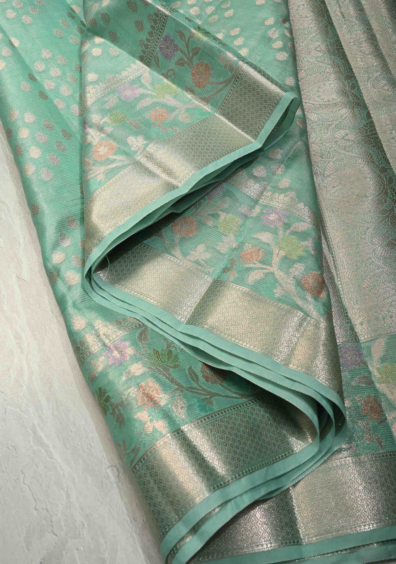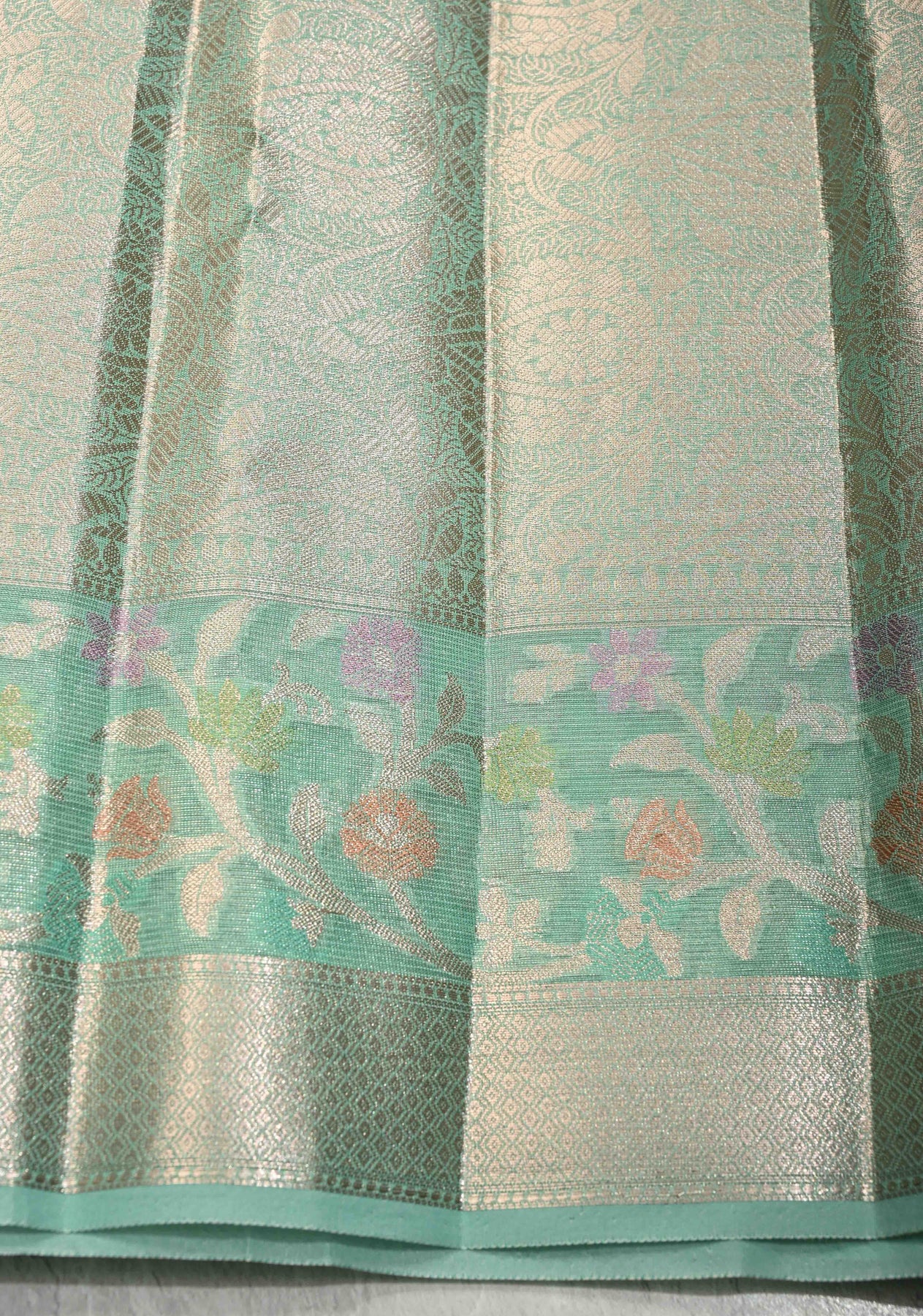 Shop our Mint Green Tissue Kanjivaram Semi Silk Saree, featuring a luminous metallic sheen and delicate leaf buttas. This elegant drape is elevated by a unique pastel meenakari vine border, blending traditional zari with soft floral accents. Lightweight and sophisticated, it is the perfect choice for morning weddings and festive celebrations. Experience effortless grace and shimmer. Buy this exquisite mint green masterpiece today.