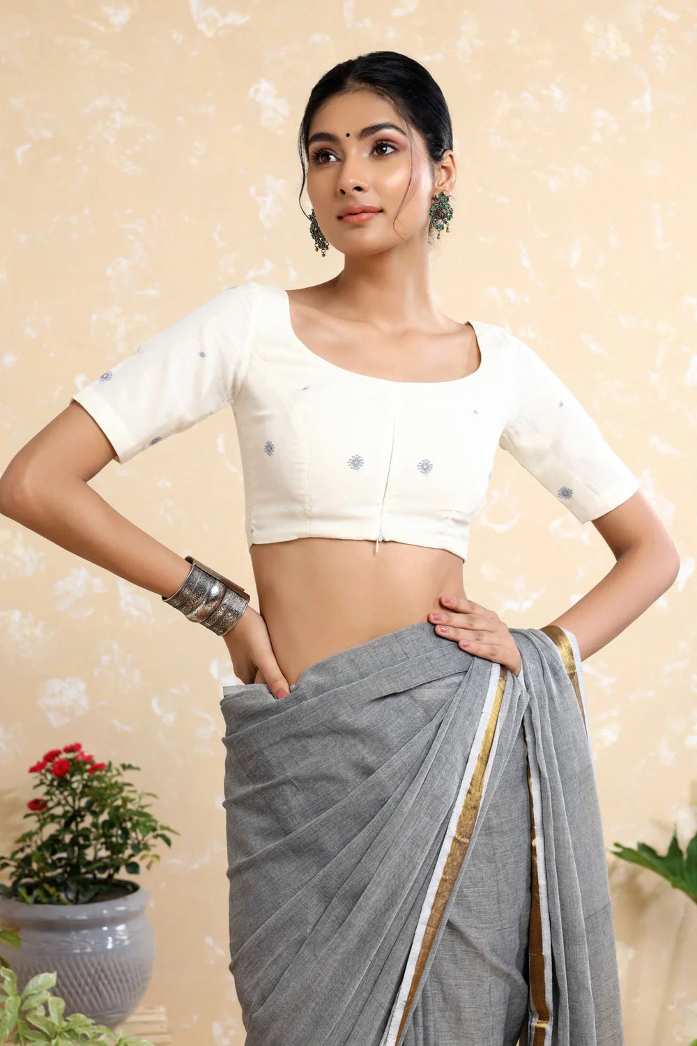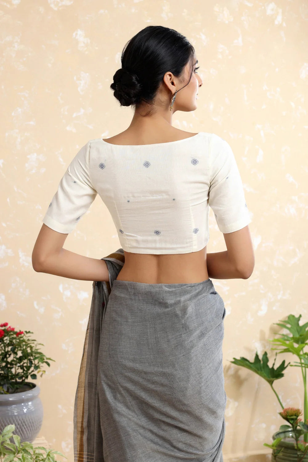 Elevate your style with our Off-white Handloom Cotton Jamdani Blouse, adorned with intricate Grey motifs woven into the fabric. Featuring a convenient front zip closure, half sleeves, a classic round neck, and comfortable lining, this blouse effortlessly blends traditional craftsmanship with contemporary elegance. Perfect for both casual outings and special occasions, it adds a touch of artisanal charm and sophistication to your wardrobe.