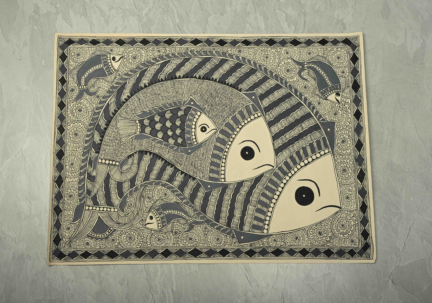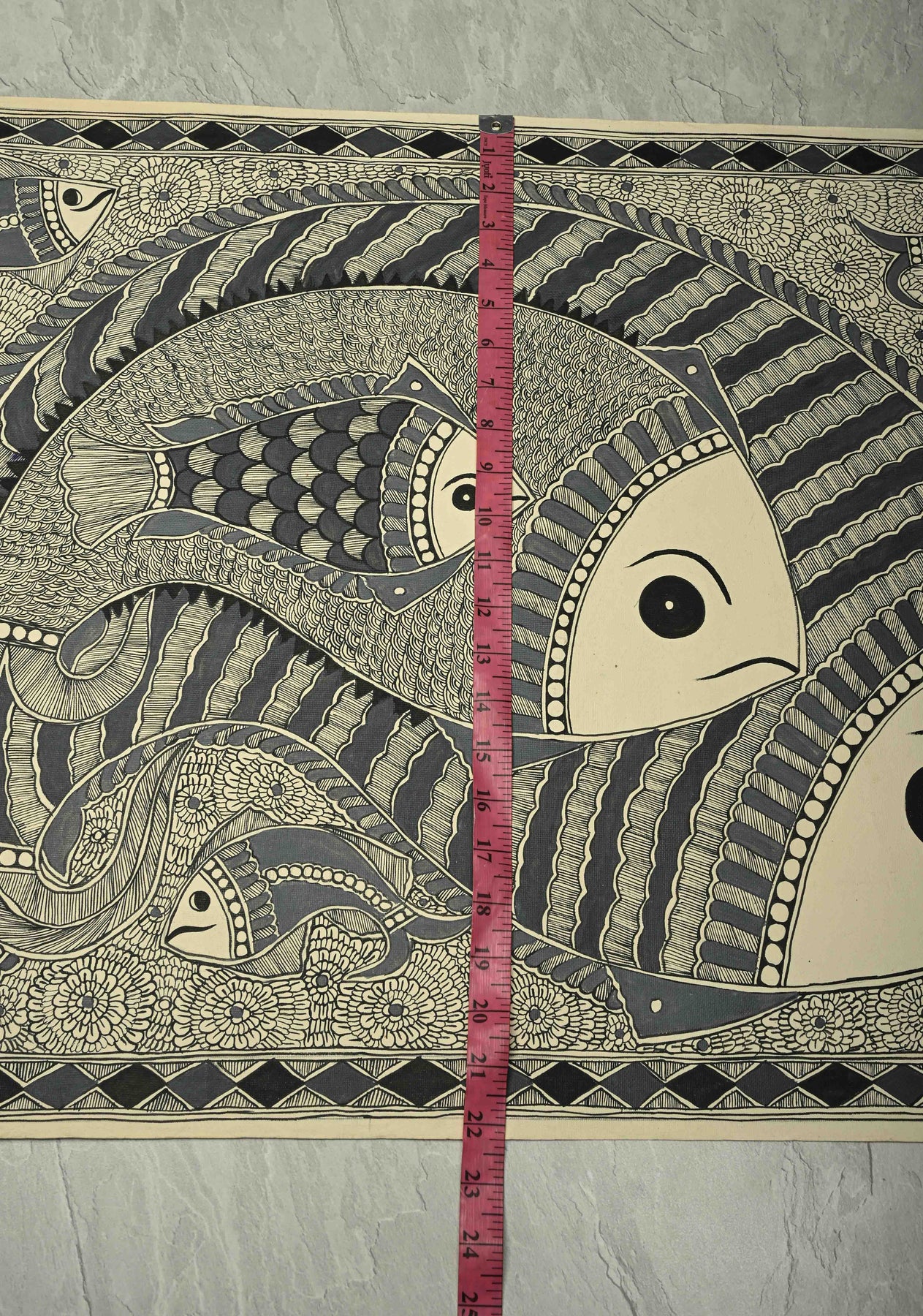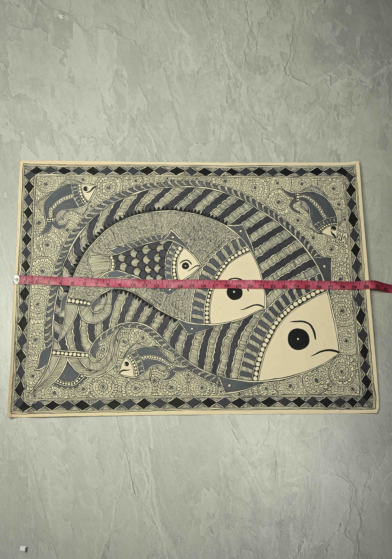 This exquisite Monotone Machhli Madhubani wall painting captures the traditional charm of Indian folk art with a contemporary minimalistic twist. Rendered entirely in a single color, the artwork depicts a stylized fish, a symbol of prosperity and good fortune, in intricate Madhubani patterns that reflect meticulous craftsmanship. The unframed piece, measuring 30 x 22 inches, allows the artwork to stand out on its own, offering flexibility for framing or direct display. Its clean, monochromatic design makes it a versatile addition to any interior, seamlessly blending traditional motifs with modern aesthetics. Perfect for those who appreciate the delicate artistry of Madhubani while embracing a subtle, elegant decor statement.