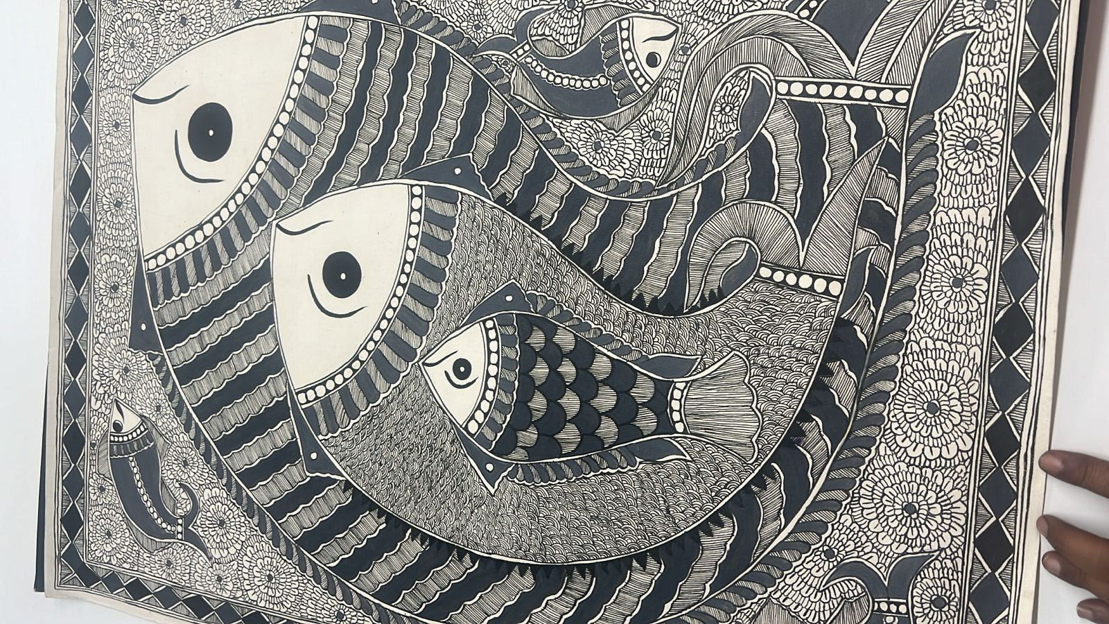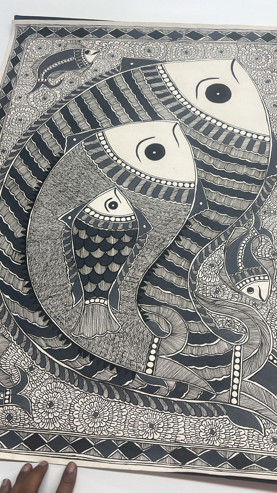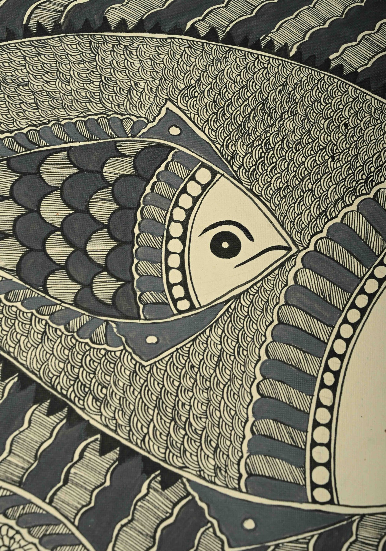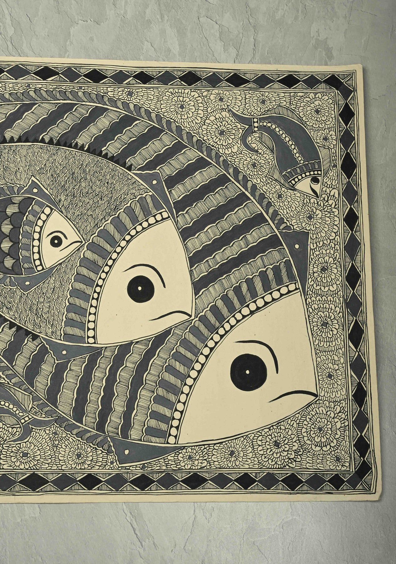 This exquisite Monotone Machhli Madhubani wall painting captures the traditional charm of Indian folk art with a contemporary minimalistic twist. Rendered entirely in a single color, the artwork depicts a stylized fish, a symbol of prosperity and good fortune, in intricate Madhubani patterns that reflect meticulous craftsmanship. The unframed piece, measuring 30 x 22 inches, allows the artwork to stand out on its own, offering flexibility for framing or direct display. Its clean, monochromatic design makes it a versatile addition to any interior, seamlessly blending traditional motifs with modern aesthetics. Perfect for those who appreciate the delicate artistry of Madhubani while embracing a subtle, elegant decor statement.