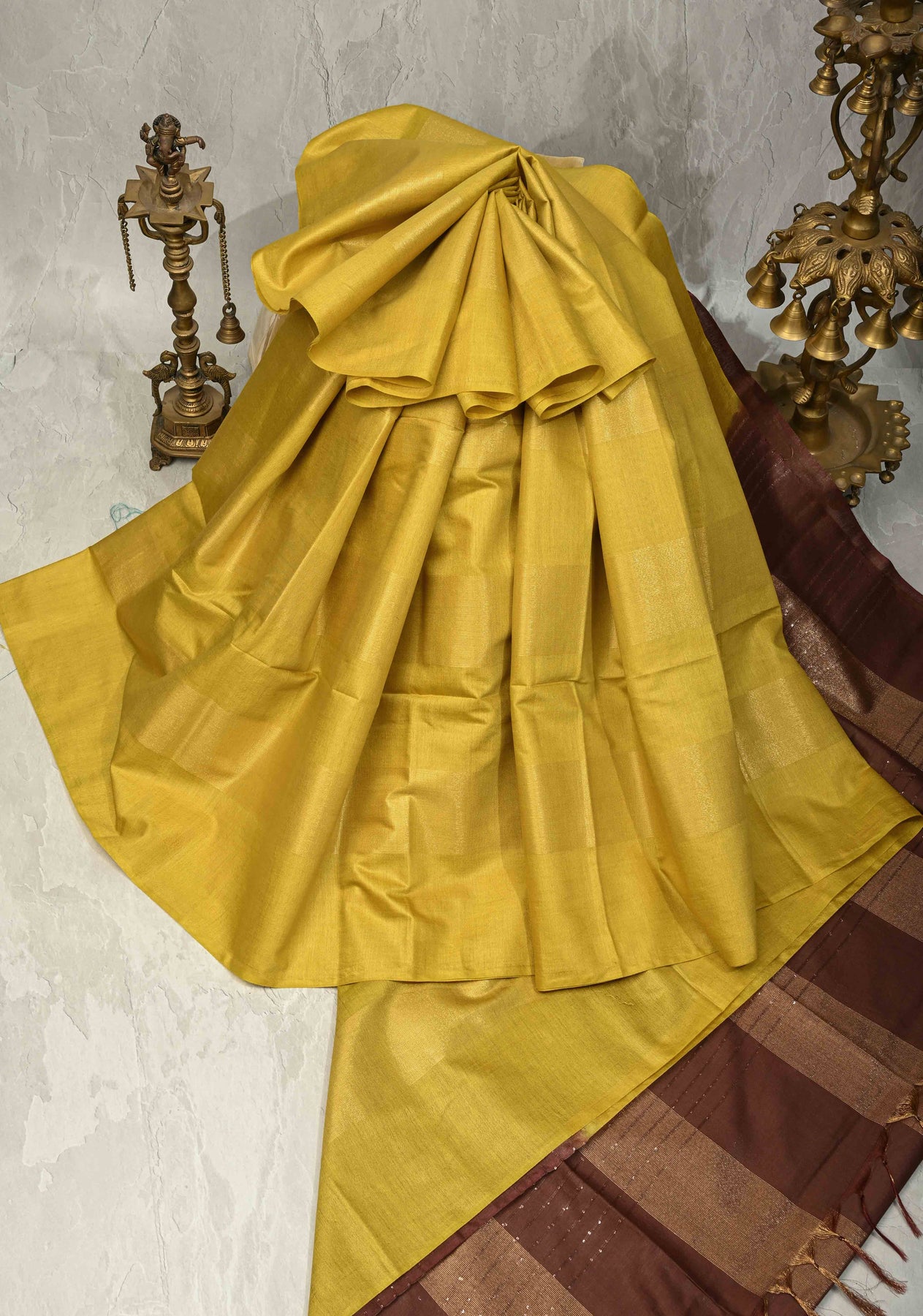 This Moss Green Borderless Semi Tussar Saree exudes understated elegance with its soothing earthy tone and refined craftsmanship. The semi tussar fabric offers a natural texture and comfortable drape, perfect for long wear. A beautifully crafted muted tissue panel adds a subtle sheen, enhancing the saree’s contemporary charm. The contrast sequins pallu introduces a gentle sparkle, creating a striking yet balanced visual appeal. Designed without borders, it maintains a clean, modern silhouette. Ideal for festive gatherings, cultural events, and elegant day occasions.