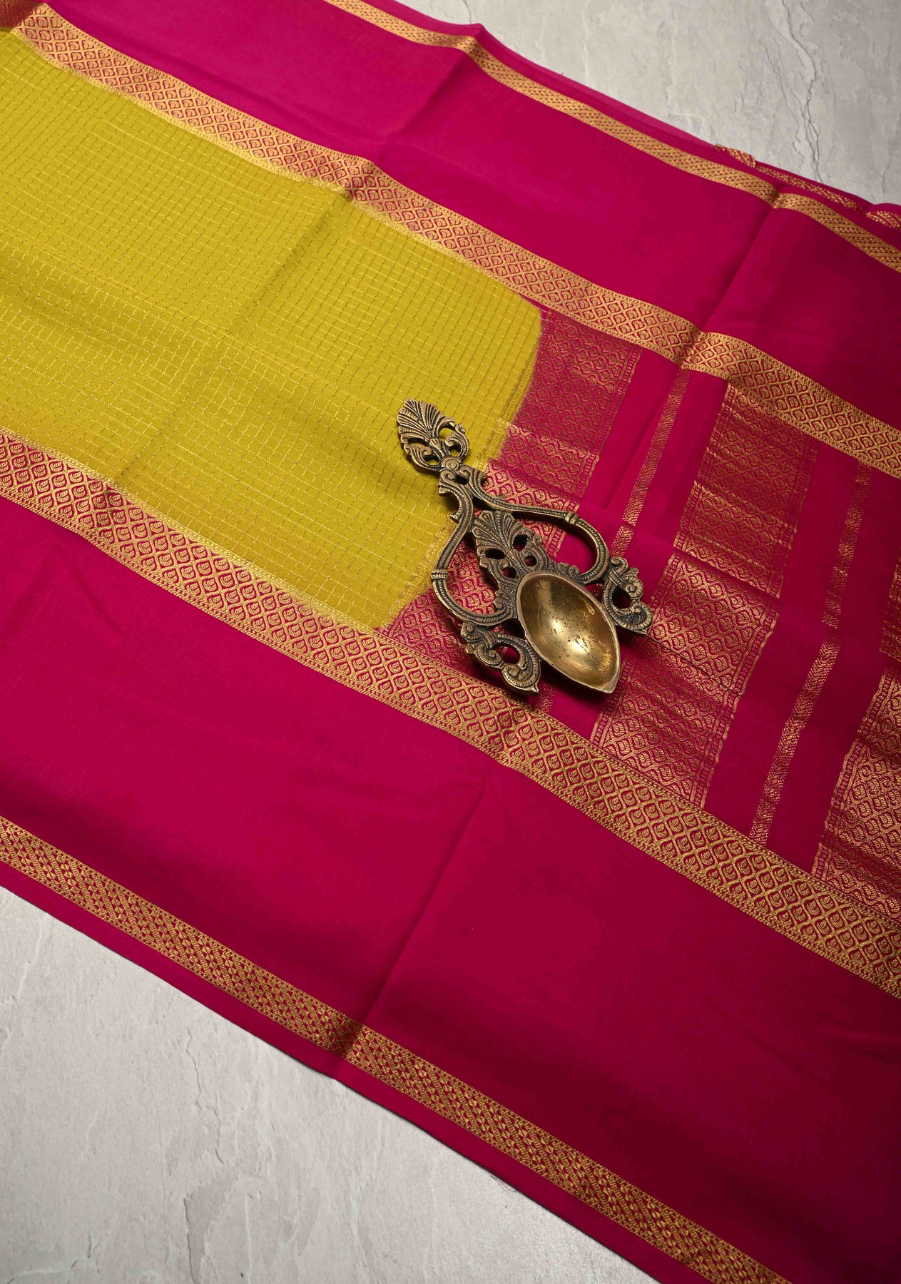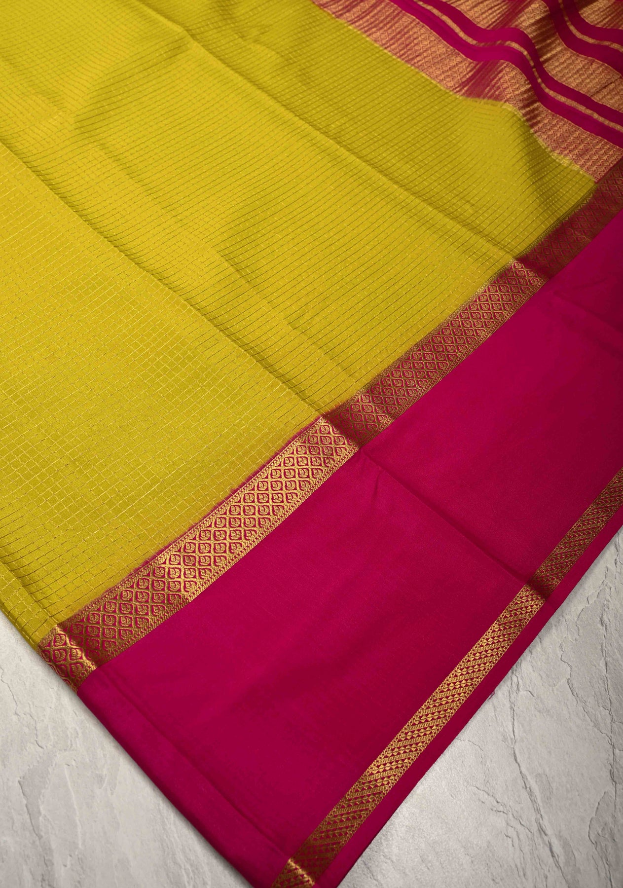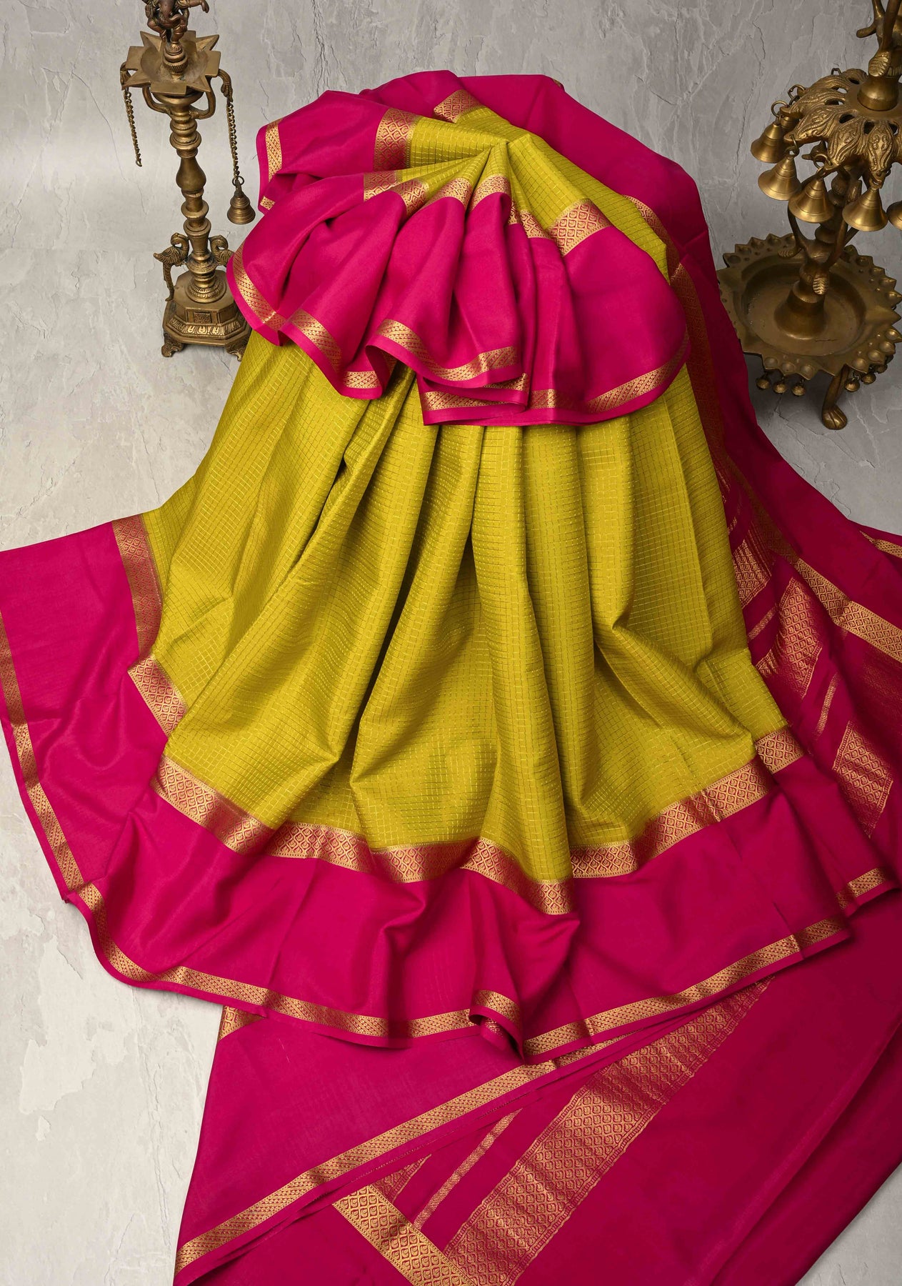 Moss Green Pure Mysore Silk Saree with Podi-Kattam Zari Checks and Contrast Zari Border in KSIC Grade Thickness | SILK MARK CERTIFIED