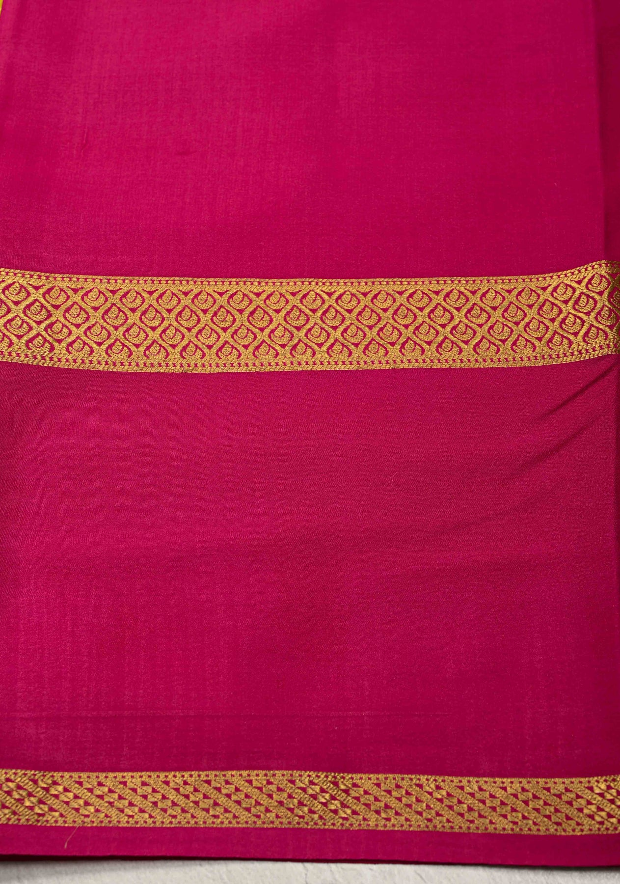 This Moss Green Pure Mysore Silk Saree is a graceful blend of subtle elegance and traditional craftsmanship. The soothing moss green body is embellished with Podi-Kattam zari checks, creating a delicate geometric texture that enhances its refined appeal. Woven from pure Mysore silk, the saree offers a soft, lustrous finish and a lightweight, flowing drape. The contrast zari border adds a striking accent, infusing the saree with a touch of richness and regal charm. Perfect for festive occasions, weddings, and cultural celebrations, this saree exudes timeless sophistication.