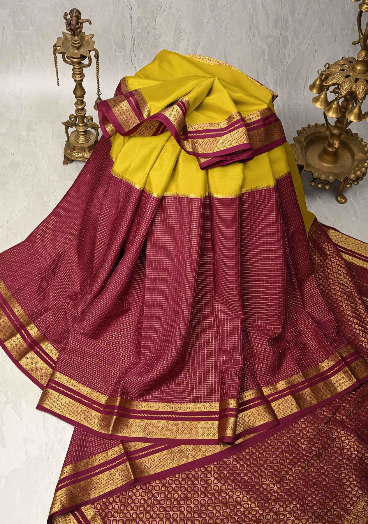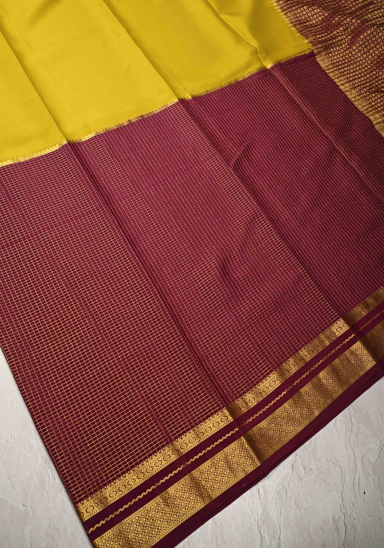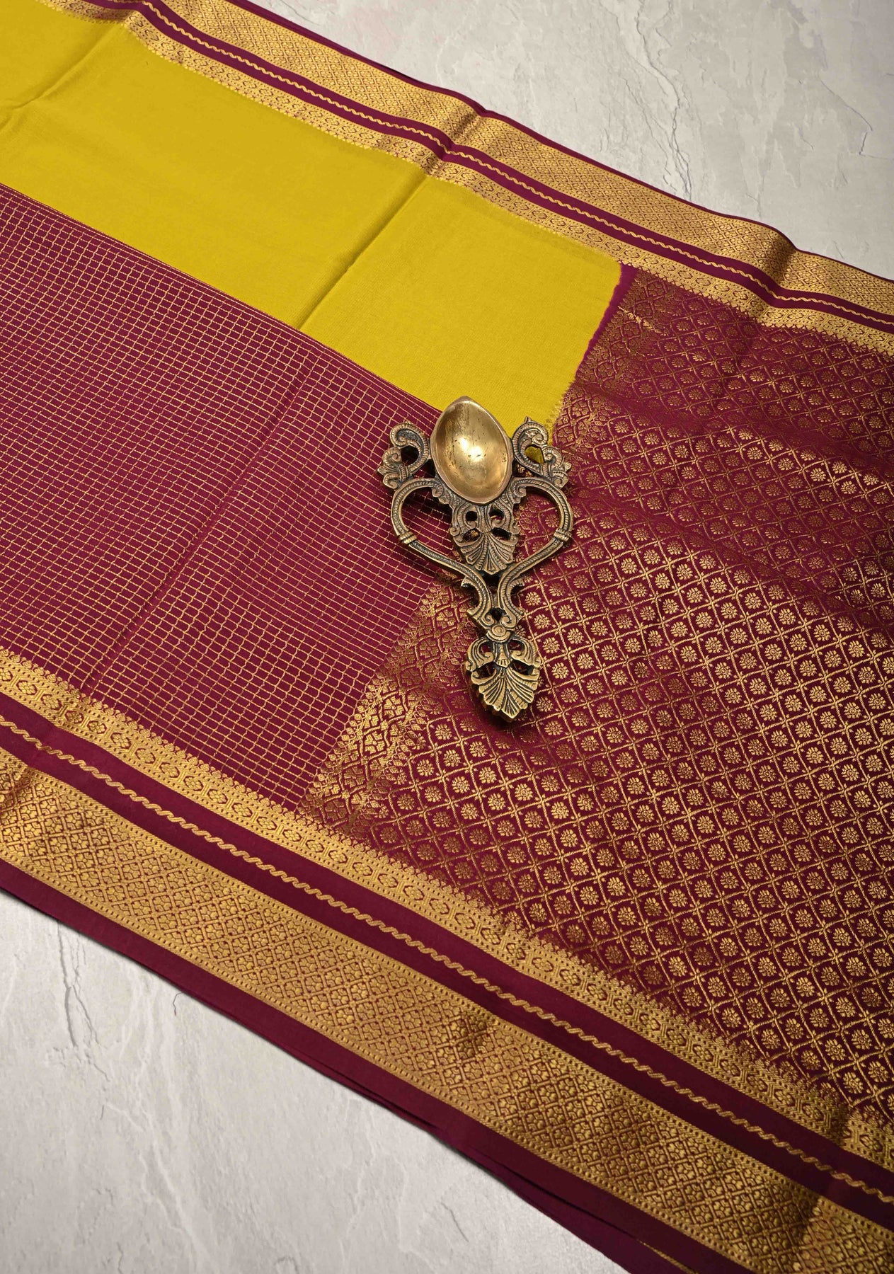 This Moss Yellow Pure Mysore Silk Saree is a perfect blend of subtle vibrance and traditional artistry. The moss yellow body is beautifully enhanced by Podi-Kattam zari checks woven on a plum base, creating a striking yet elegant color contrast. Crafted from pure Mysore silk, the saree offers a smooth, lightweight feel and graceful drape. The intricate zari border adds a regal touch, making this saree ideal for weddings, festive celebrations, and cultural occasions where understated elegance meets classic craftsmanship.