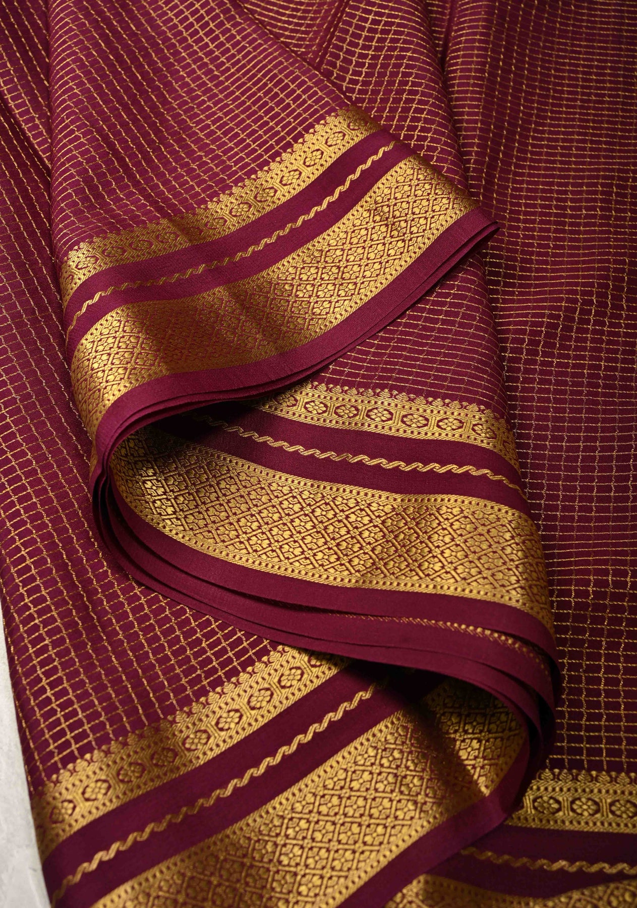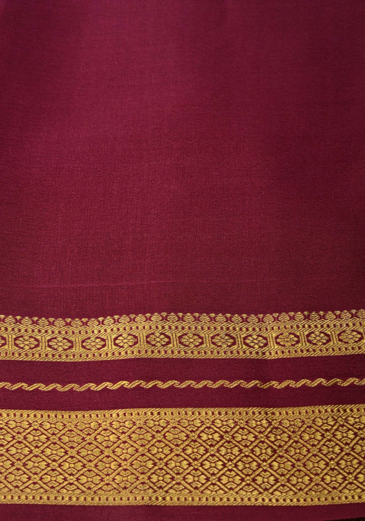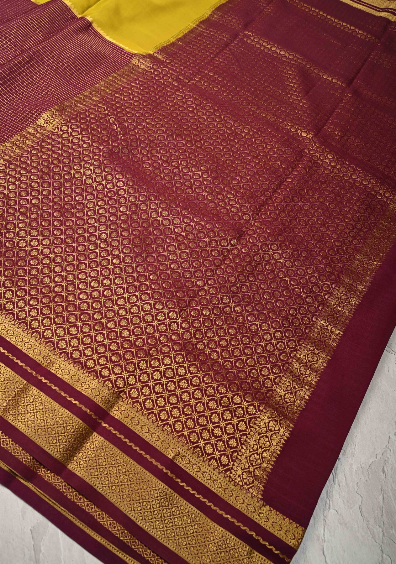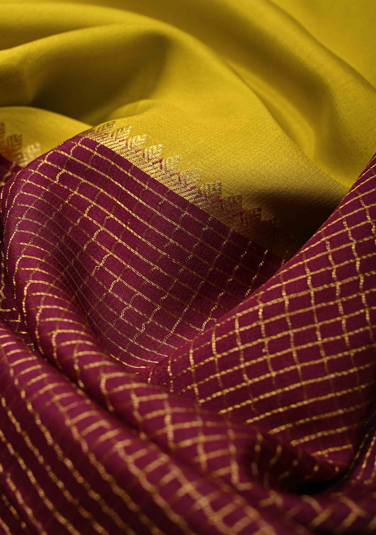 This Moss Yellow Pure Mysore Silk Saree is a perfect blend of subtle vibrance and traditional artistry. The moss yellow body is beautifully enhanced by Podi-Kattam zari checks woven on a plum base, creating a striking yet elegant color contrast. Crafted from pure Mysore silk, the saree offers a smooth, lightweight feel and graceful drape. The intricate zari border adds a regal touch, making this saree ideal for weddings, festive celebrations, and cultural occasions where understated elegance meets classic craftsmanship.
