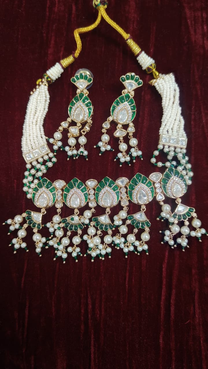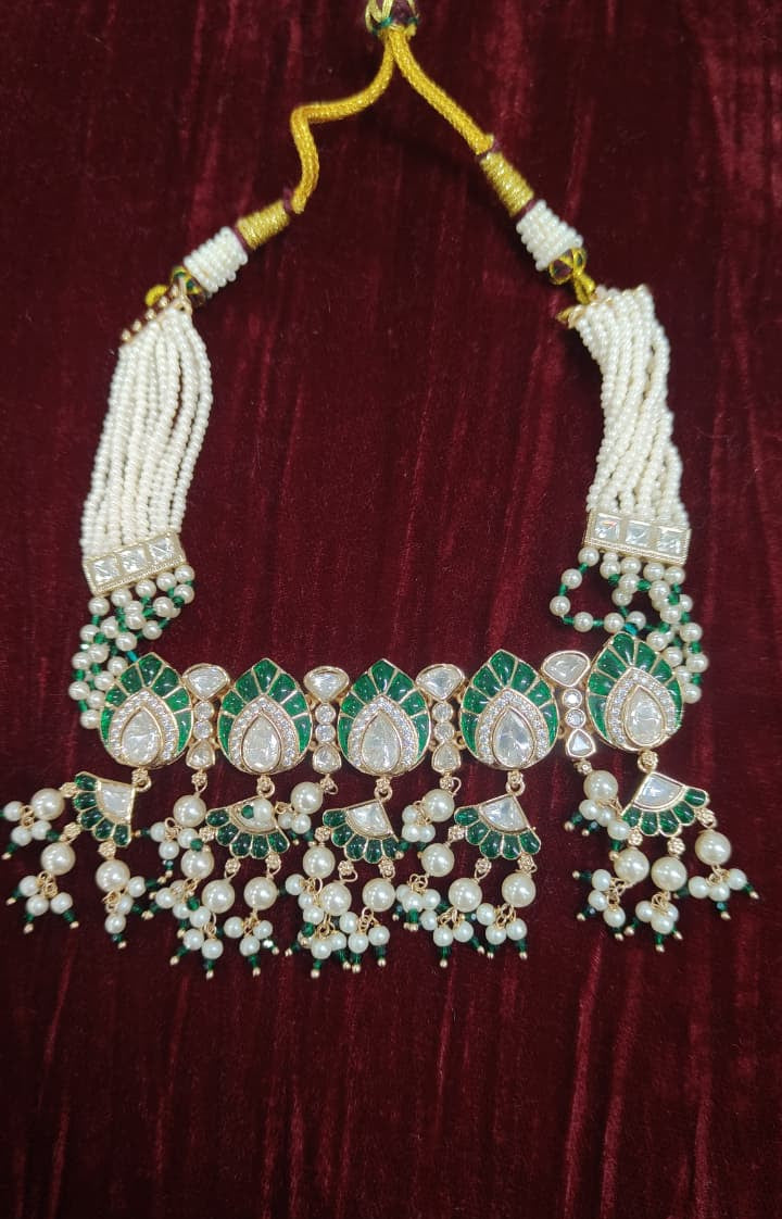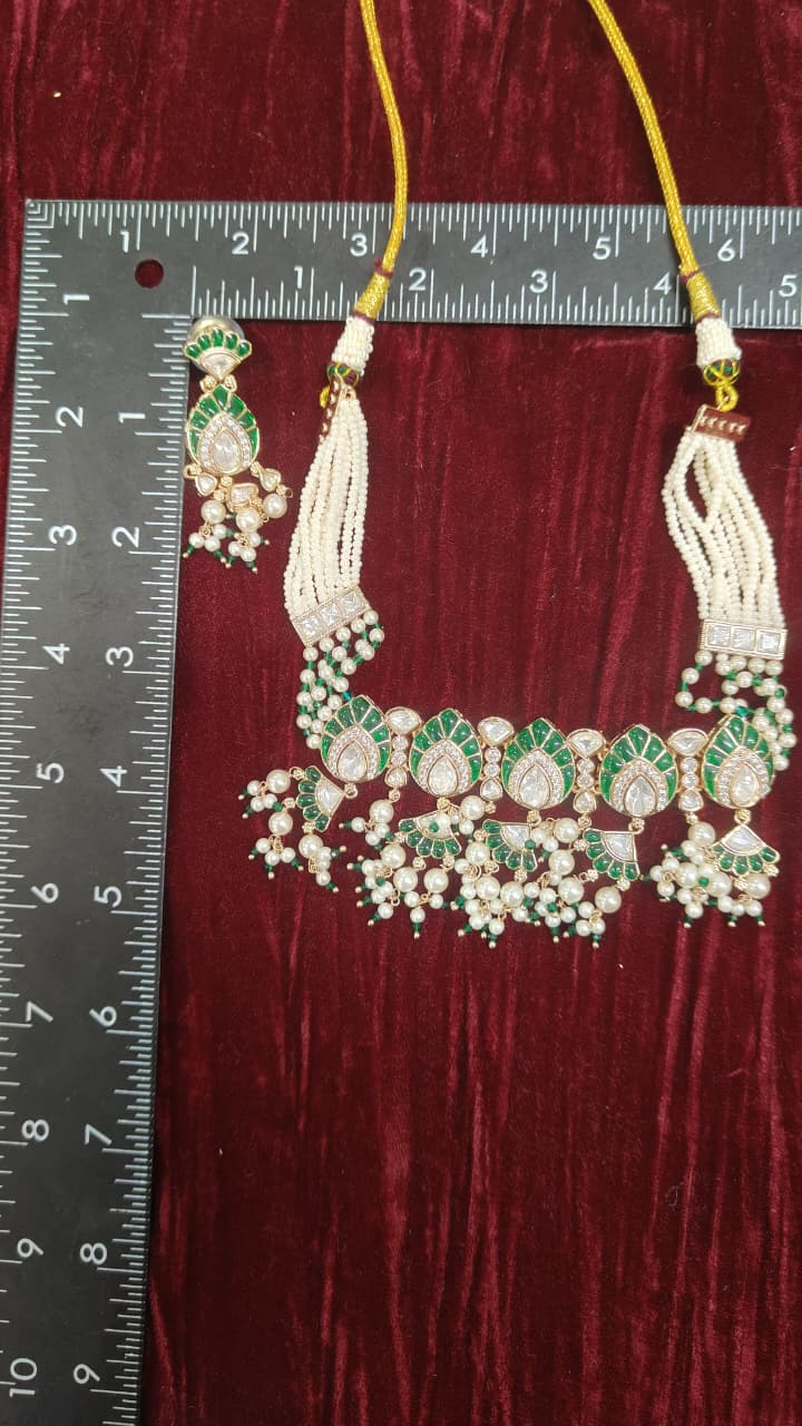 Elevate your traditional look with this exquisite Multi-Strand Pearl and Meenakari Polki Necklace Set, a perfect blend of heritage artistry and timeless elegance. Designed with multiple layers of lustrous pearls, the necklace is beautifully highlighted with intricately set polki stones that exude royal charm. The detailed meenakari work adds vibrant enamel accents, enhancing its rich and graceful appeal. Paired with matching earrings, this stunning set is ideal for weddings, festive celebrations, and grand occasions, making it a treasured addition to your jewelry collection.