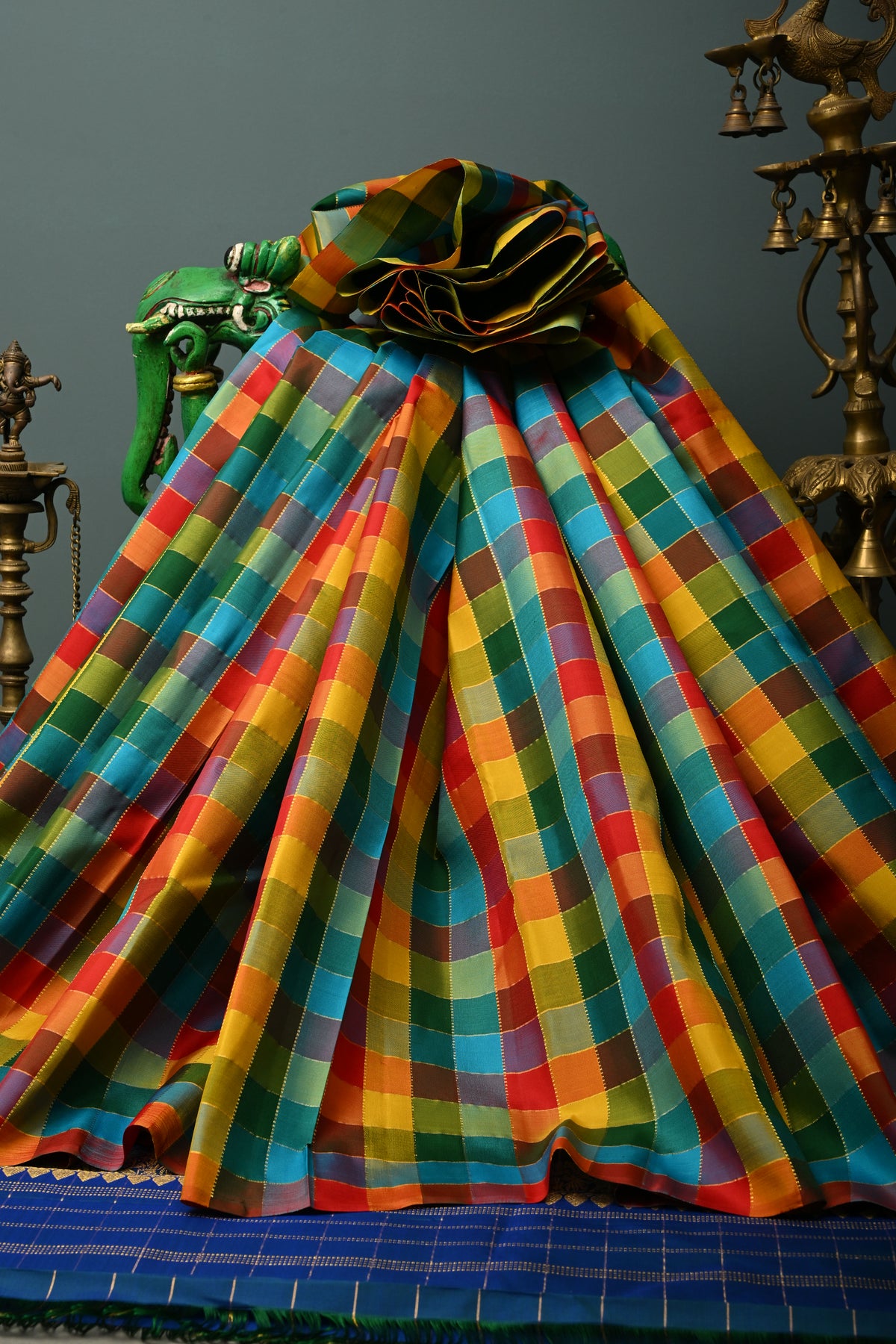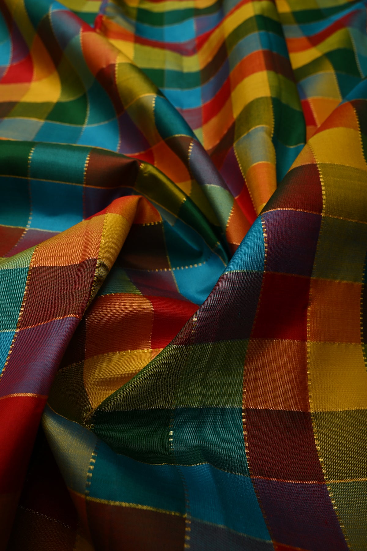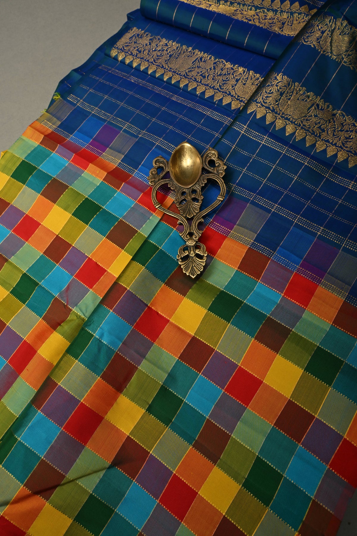 Multicolor Borderless Kanjivaram Pure Silk Saree with Pallum Pazhamum Zari Checks and Peacock Blue Dual Tone Pallu| SILK MARK CERTIFIED