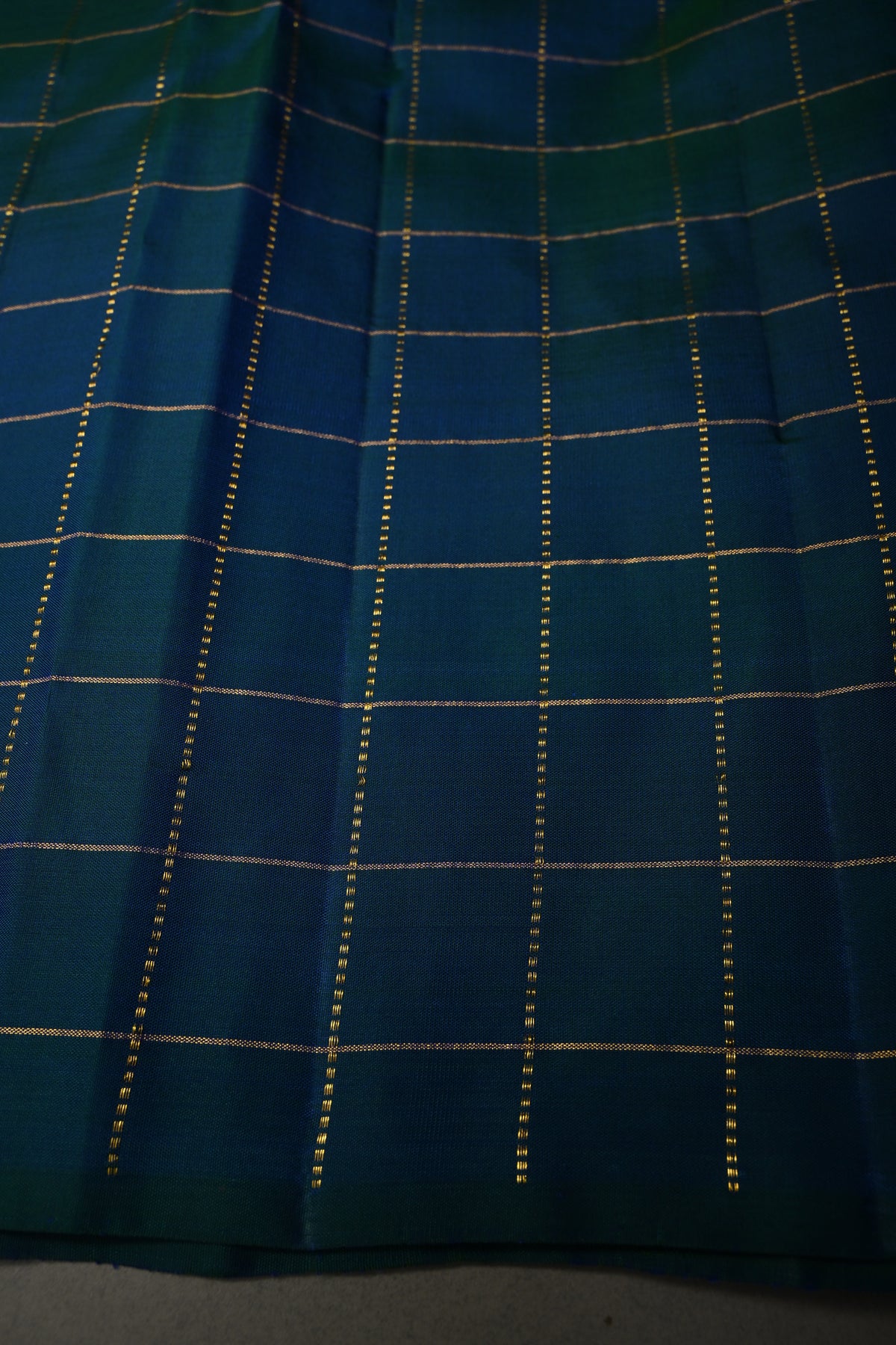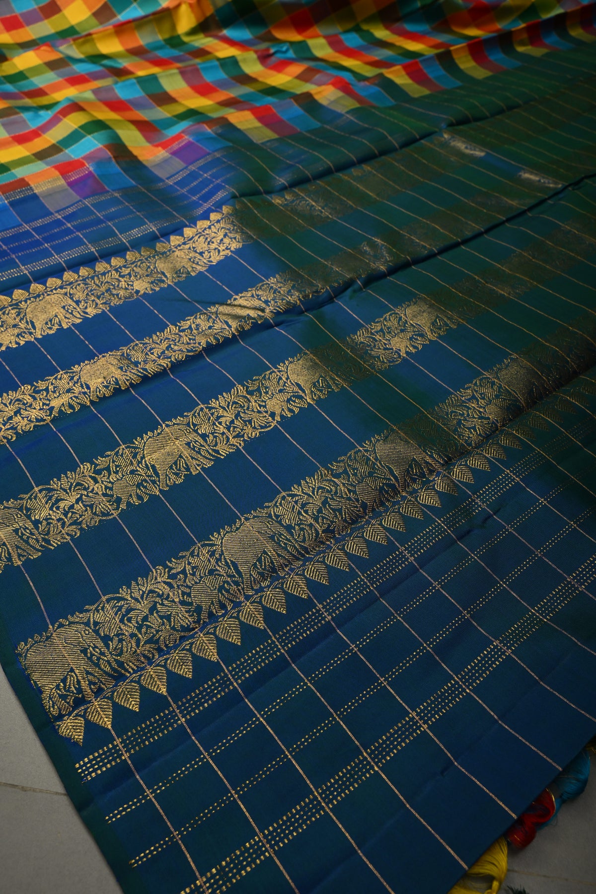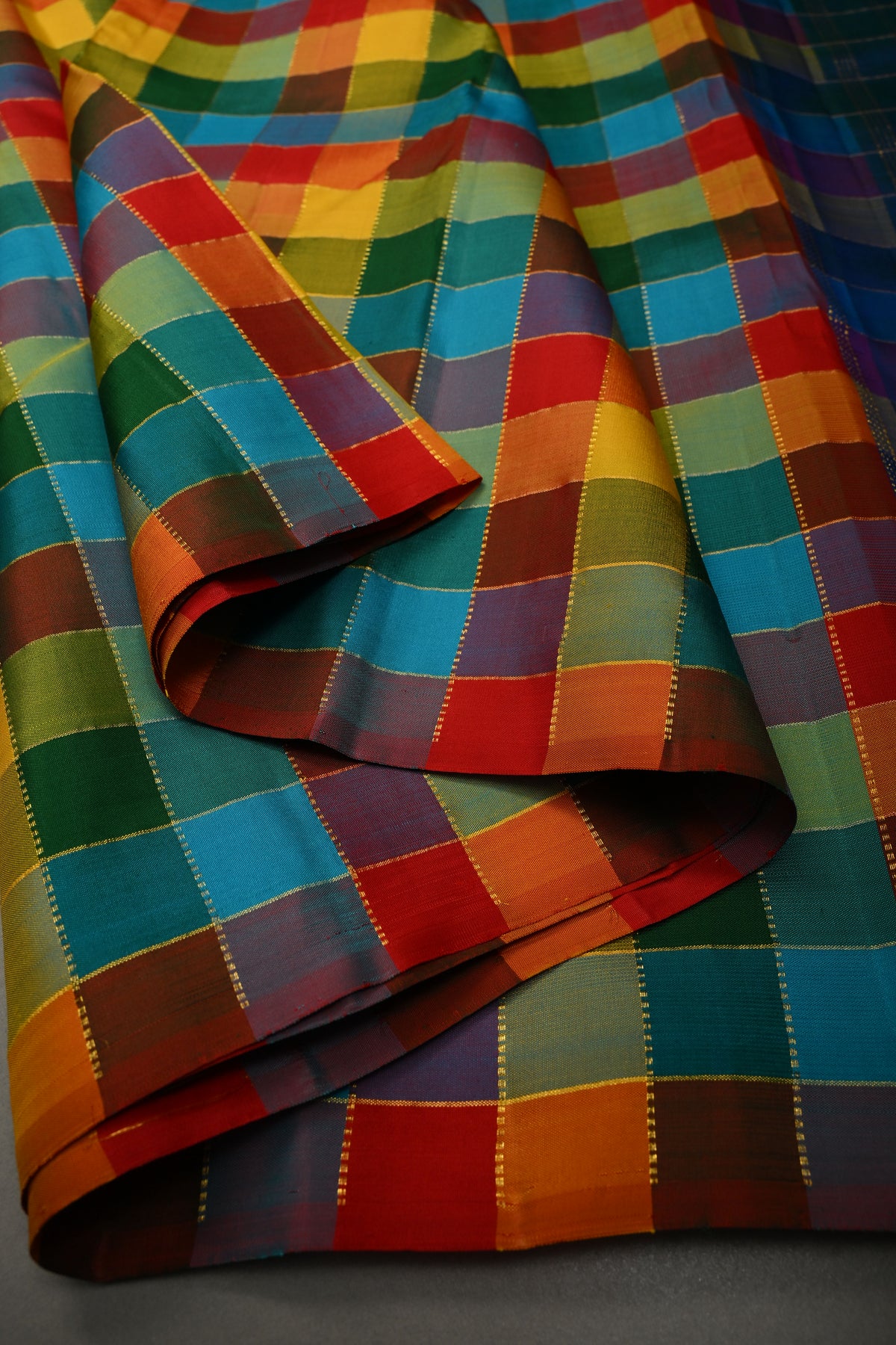 Multicolor Borderless Kanjivaram Pure Silk Saree with Pallum Pazhamum Zari Checks and Peacock Blue Dual Tone Pallu| SILK MARK CERTIFIED