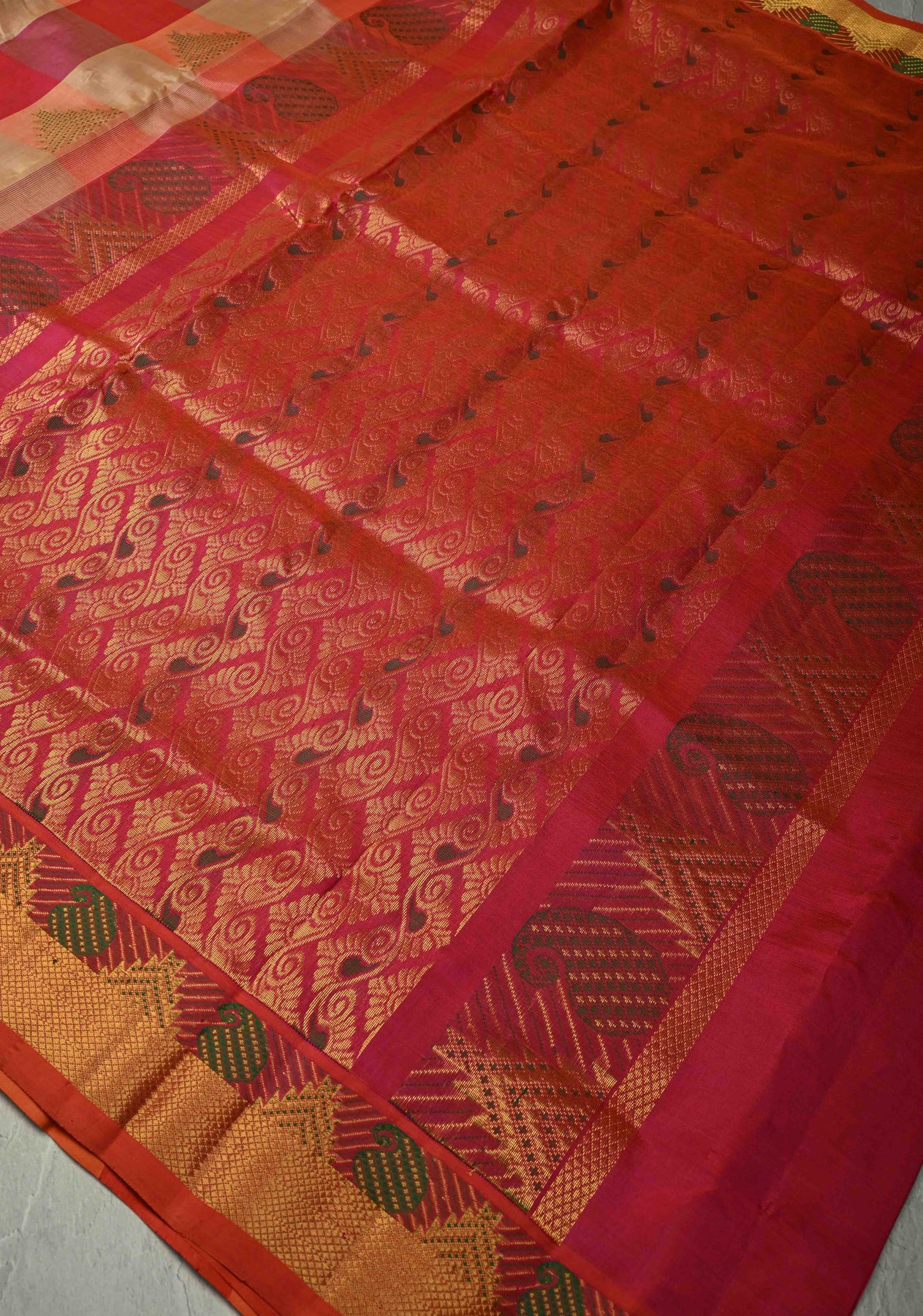 Celebrate traditional elegance with this Multicolor Palum Pazhamum Kanchi Silk Cotton Saree, handwoven with the classic Palum Pazhamum design. Made from 100% silk cotton, it offers a soft, lightweight drape with a luxurious feel.