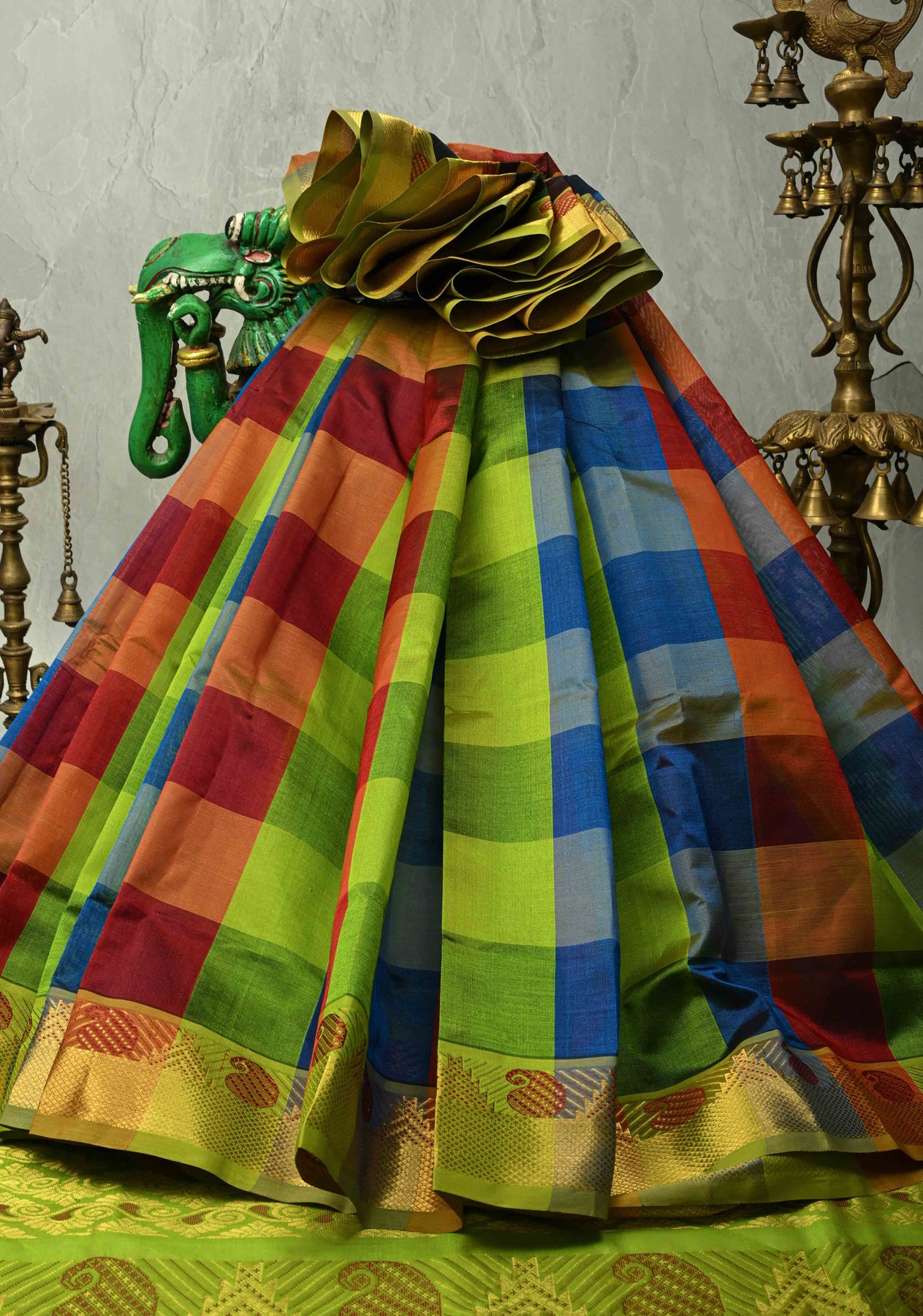 Celebrate traditional elegance with this Multicolor Palum Pazhamum Kanchi Silk Cotton Saree, handwoven with the classic Palum Pazhamum design. Made from 100% silk cotton, it offers a soft, lightweight drape with a feel.