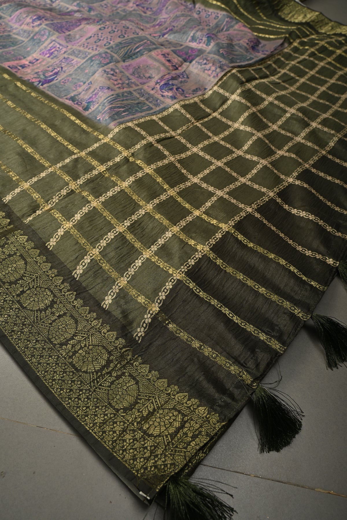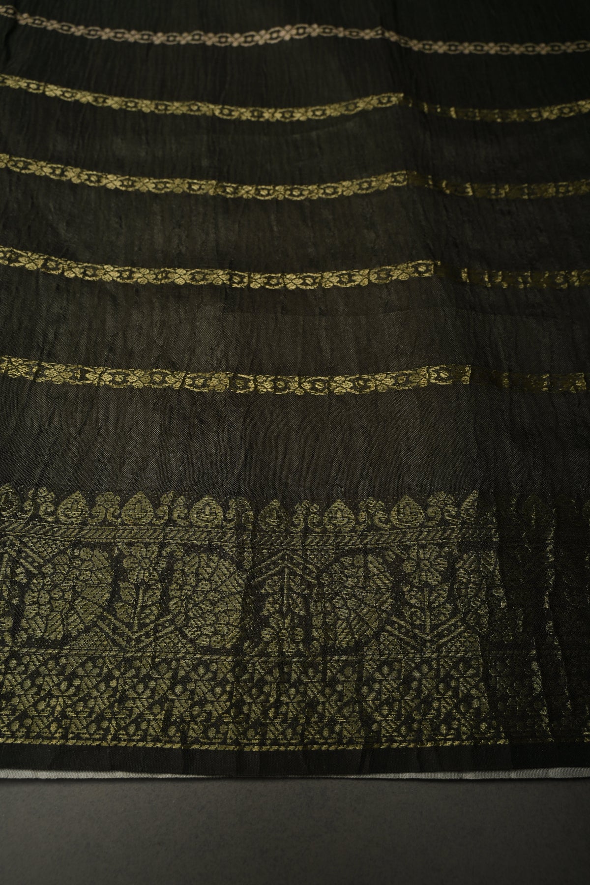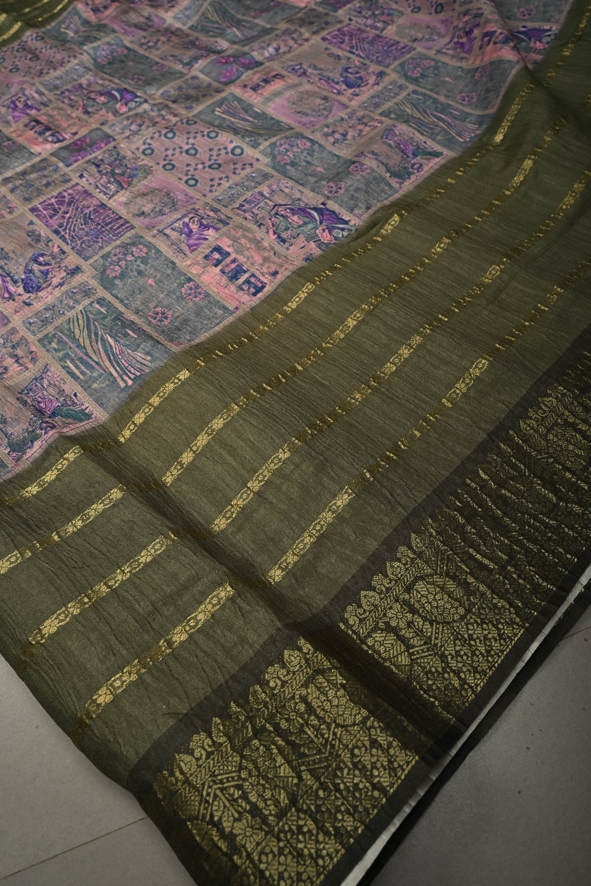 This saree is ready to wear with falls and pico done. An unstitched blouse fabric is included.
