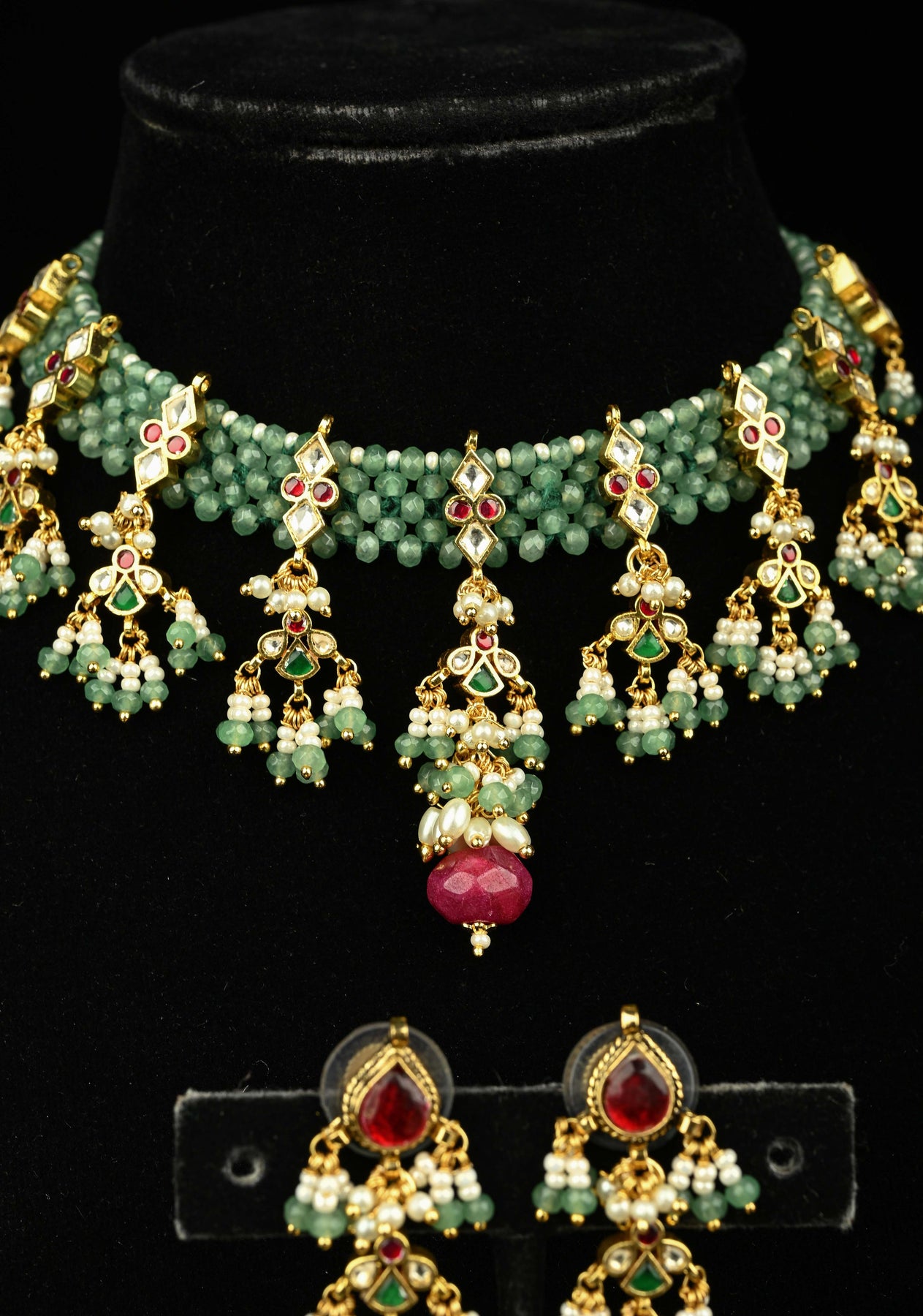 Make a royal style statement with this Multistrand Green Beaded Choker Necklace Set, beautifully adorned with shimmering Kundan accents and elegant dangling beads. The layered green beads create a rich, festive look, while the Kundan work adds a traditional touch of luxury and brilliance.