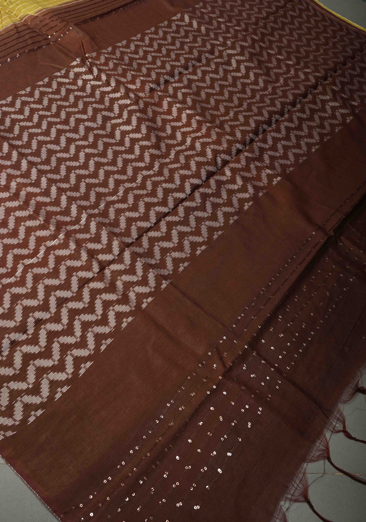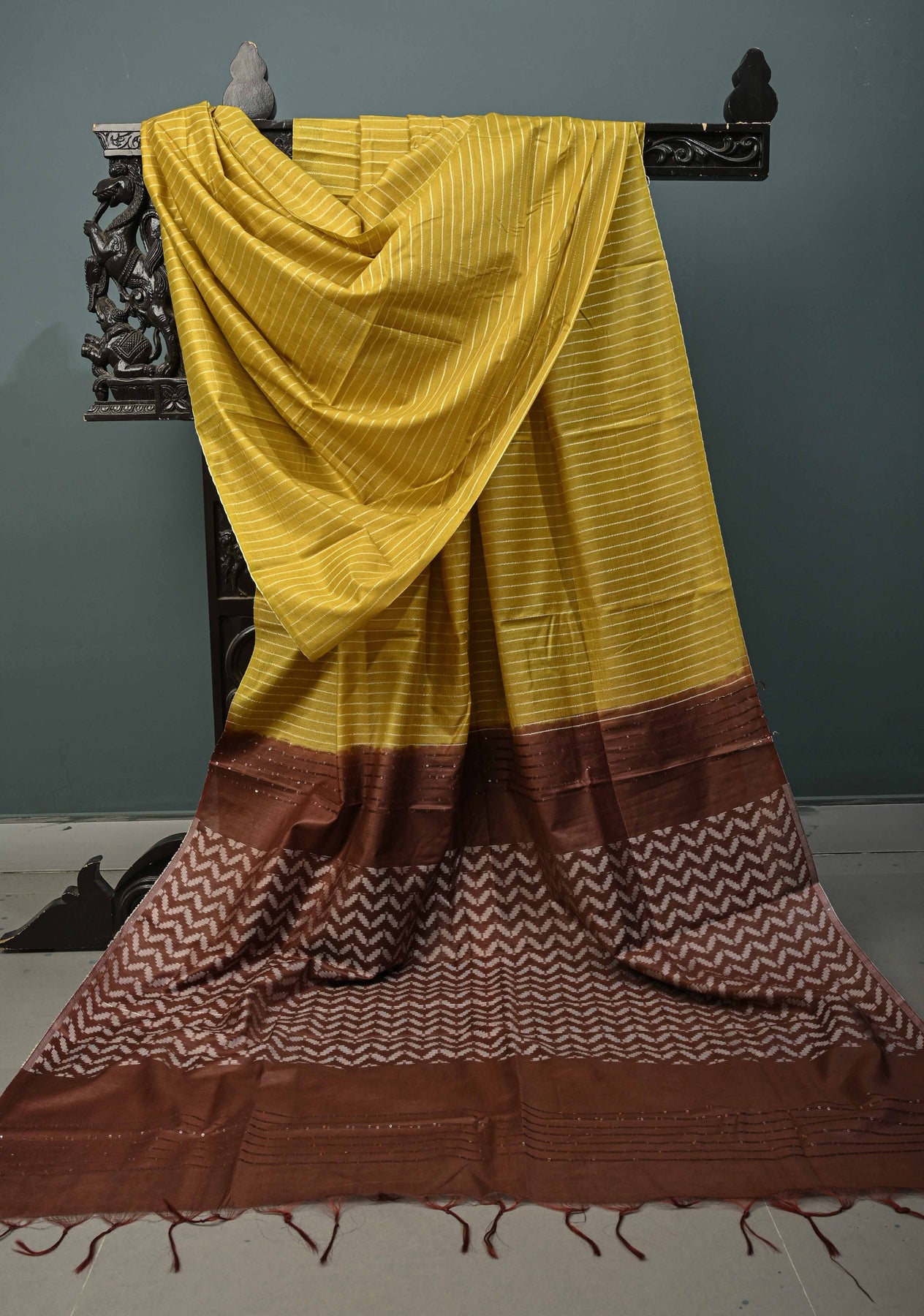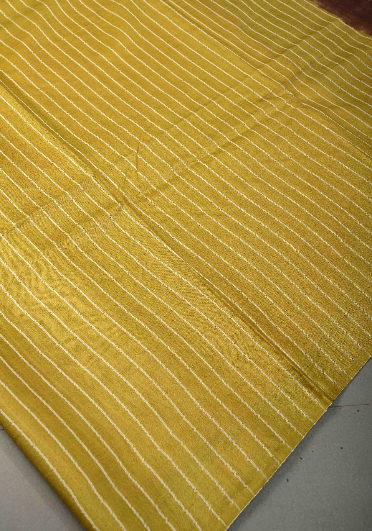 Warm, elegant, and effortlessly stylish, this Mustard Yellow Borderless Semi Tussar Saree is a beautiful blend of simplicity and contemporary charm. Crafted from soft semi tussar fabric, the saree offers a natural texture, lightweight comfort, and a graceful drape.