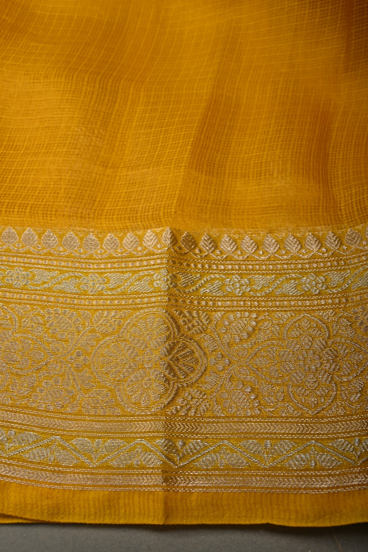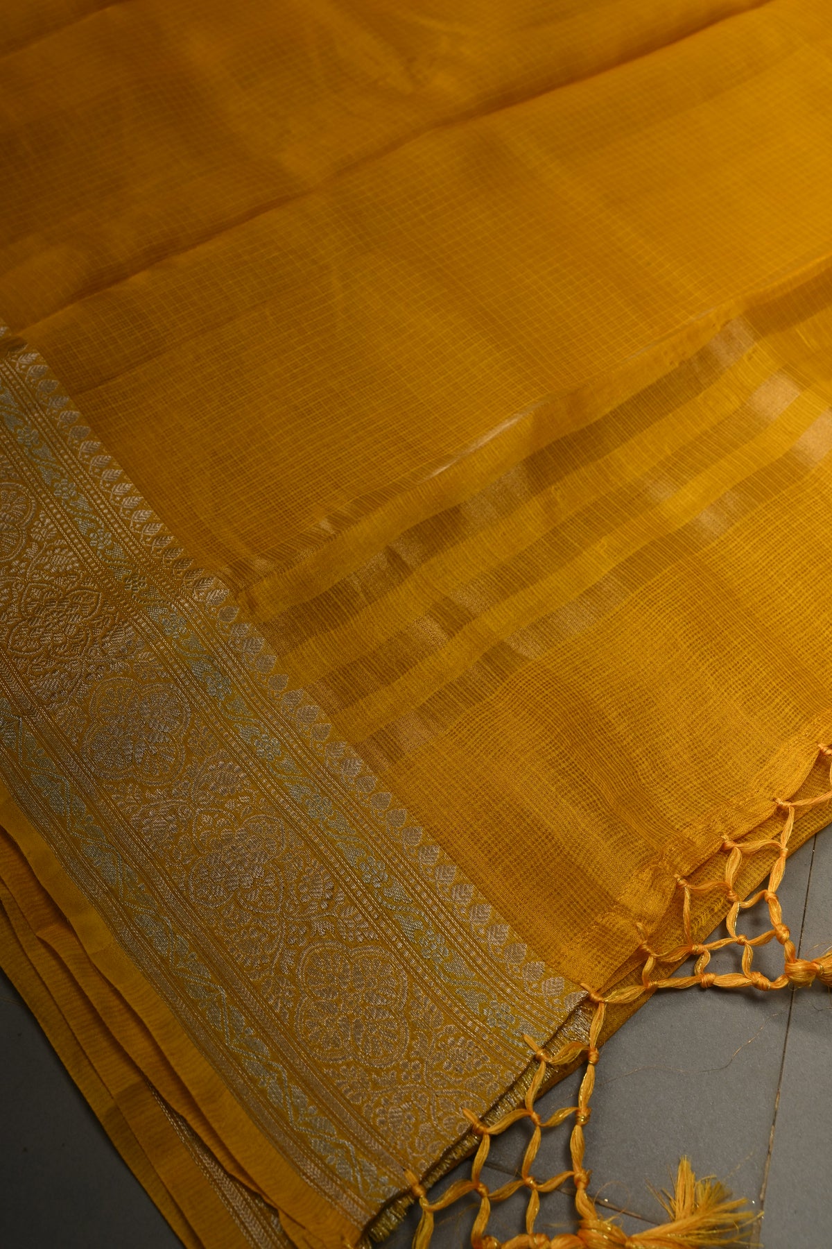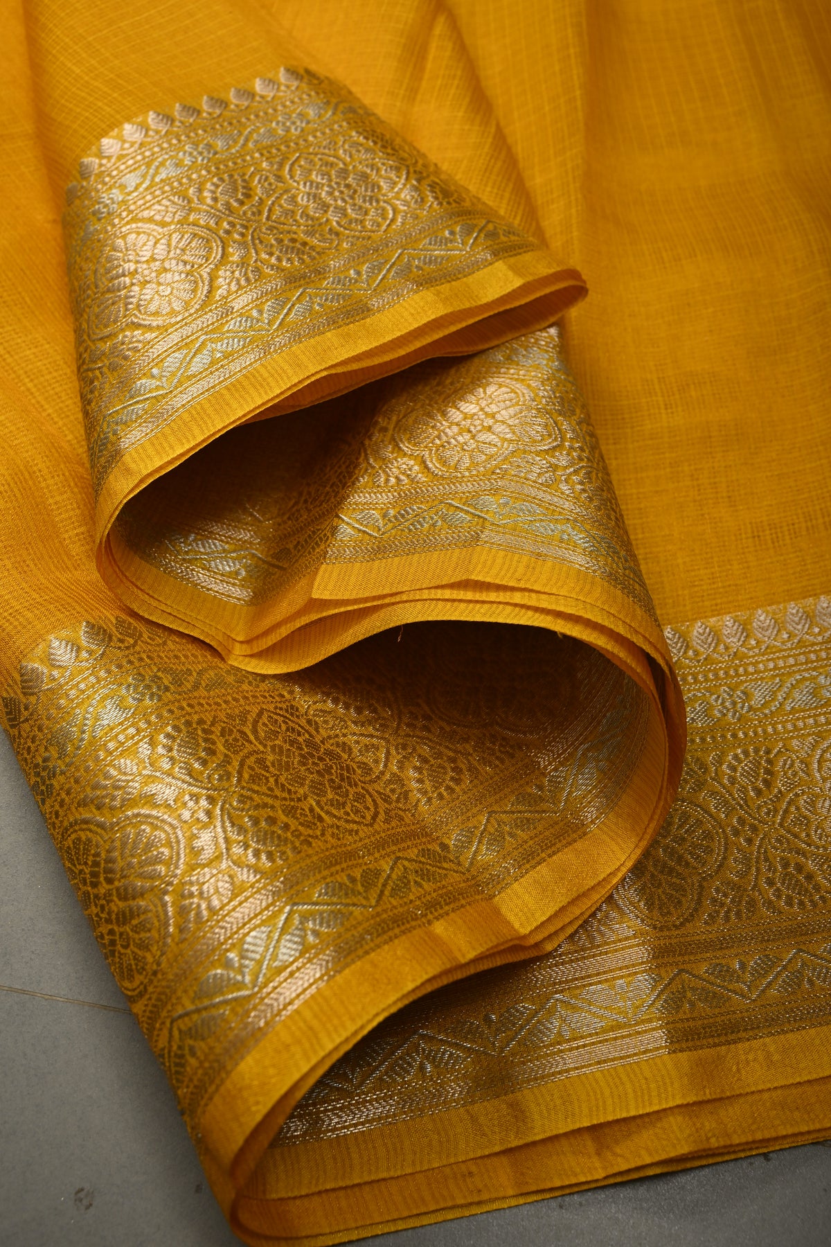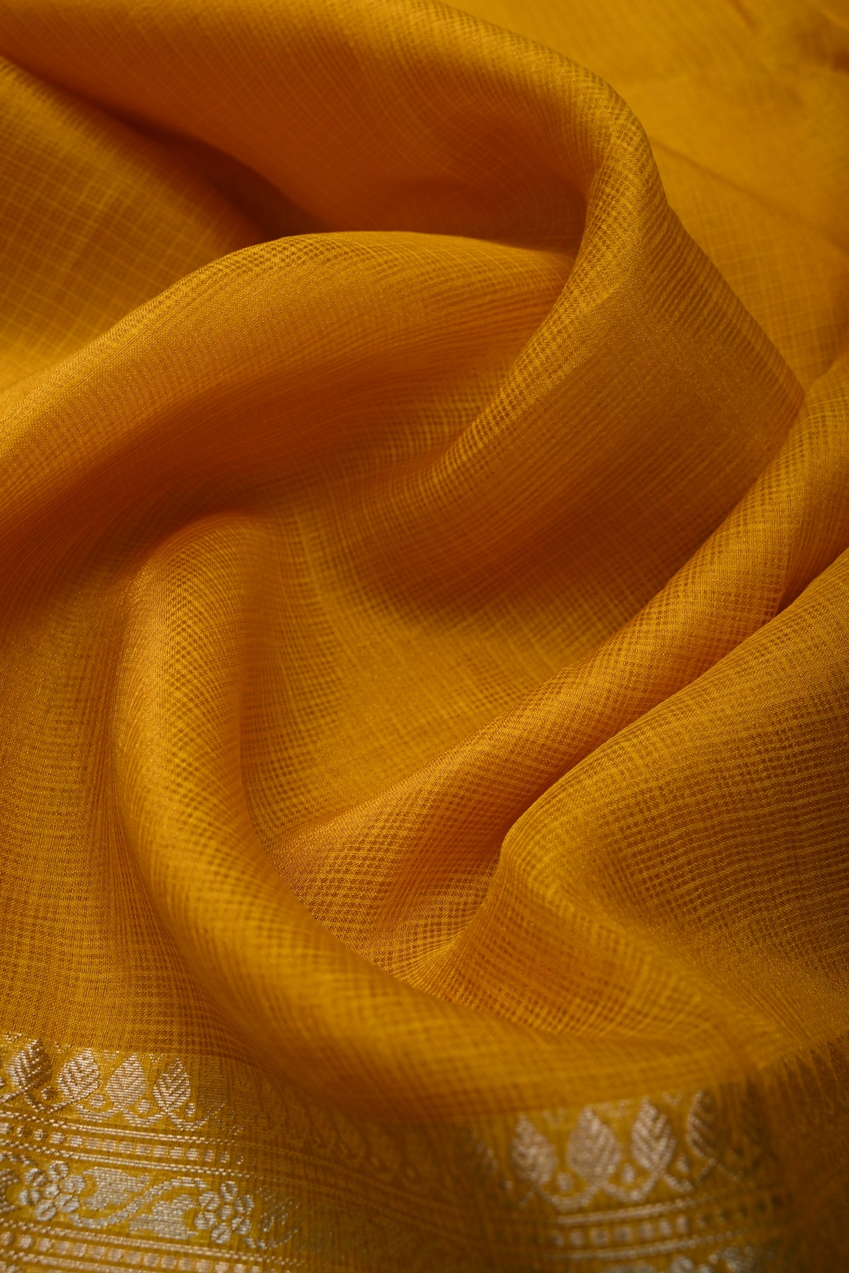 The Mustard Yellow Kota Doria Tissue Cotton Saree is a vibrant and elegant piece that beautifully combines tradition and modernity. The lightweight kota doria weave gives the saree a breathable, airy feel, while the mustard yellow color adds warmth and radiance. Its tissue cotton fabric offers a delicate sheen, enhancing the saree's sophisticated charm. The stunning Sona Rupa zari border, with its gold and silver zari work, adds an exquisite touch of luxury, making this saree a perfect choice for festive occasions, weddings, or special gatherings.