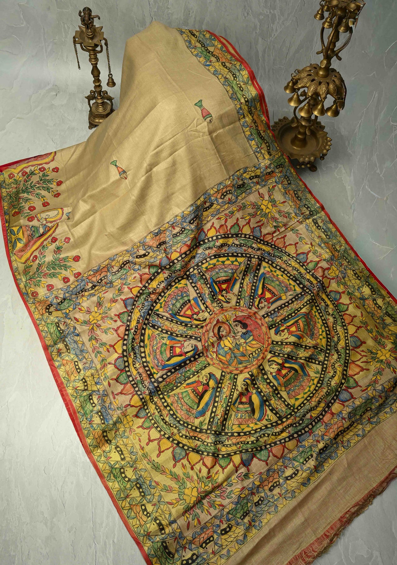 The Natural Color Linen by Linen Saree with Madhubani Hand-Painted detailing is a beautiful blend of earthy elegance and traditional artistry. Crafted from pure linen, the saree features a soft, breathable texture that drapes effortlessly, making it perfect for everyday wear as well as special cultural events. Its natural, understated shade highlights the intricate Madhubani hand-painted artwork, showcasing motifs inspired by folklore, nature, and heritage. Each brushstroke reflects skilled craftsmanship, adding a unique and artistic charm to the saree. Lightweight, elegant, and timeless, this saree is an ideal choice for art lovers and those who appreciate handcrafted textiles with cultural significance.