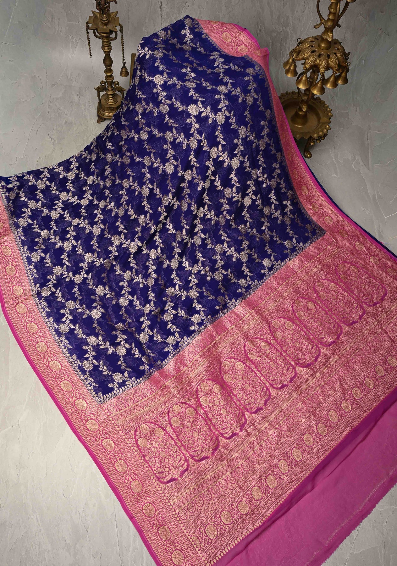 Elevate your ethnic wardrobe with this stunning Navy Blue Banarasi Georgette Silk Saree, a timeless blend of tradition and sophistication. Woven with georgette silk, the saree is adorned with an all-over floral jaal that reflects the rich heritage of Banarasi artistry.