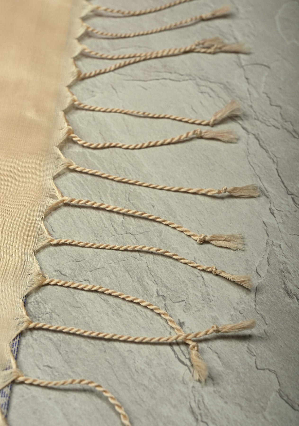 This saree is ready to wear with fall and pico done. Handmade silk tassels as seen in the pic adorn the pallu and add more grace to it. An unstitched blouse fabric is included.