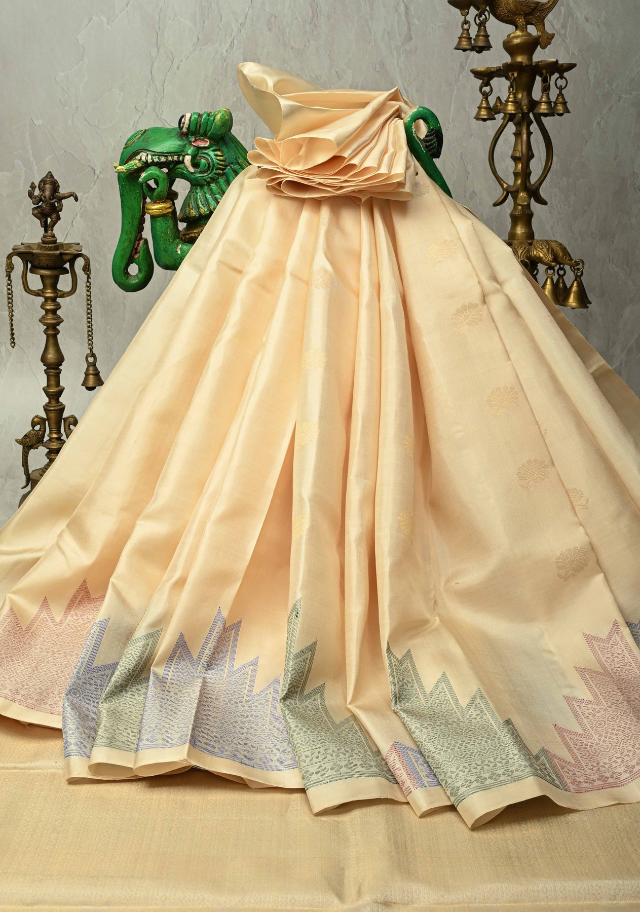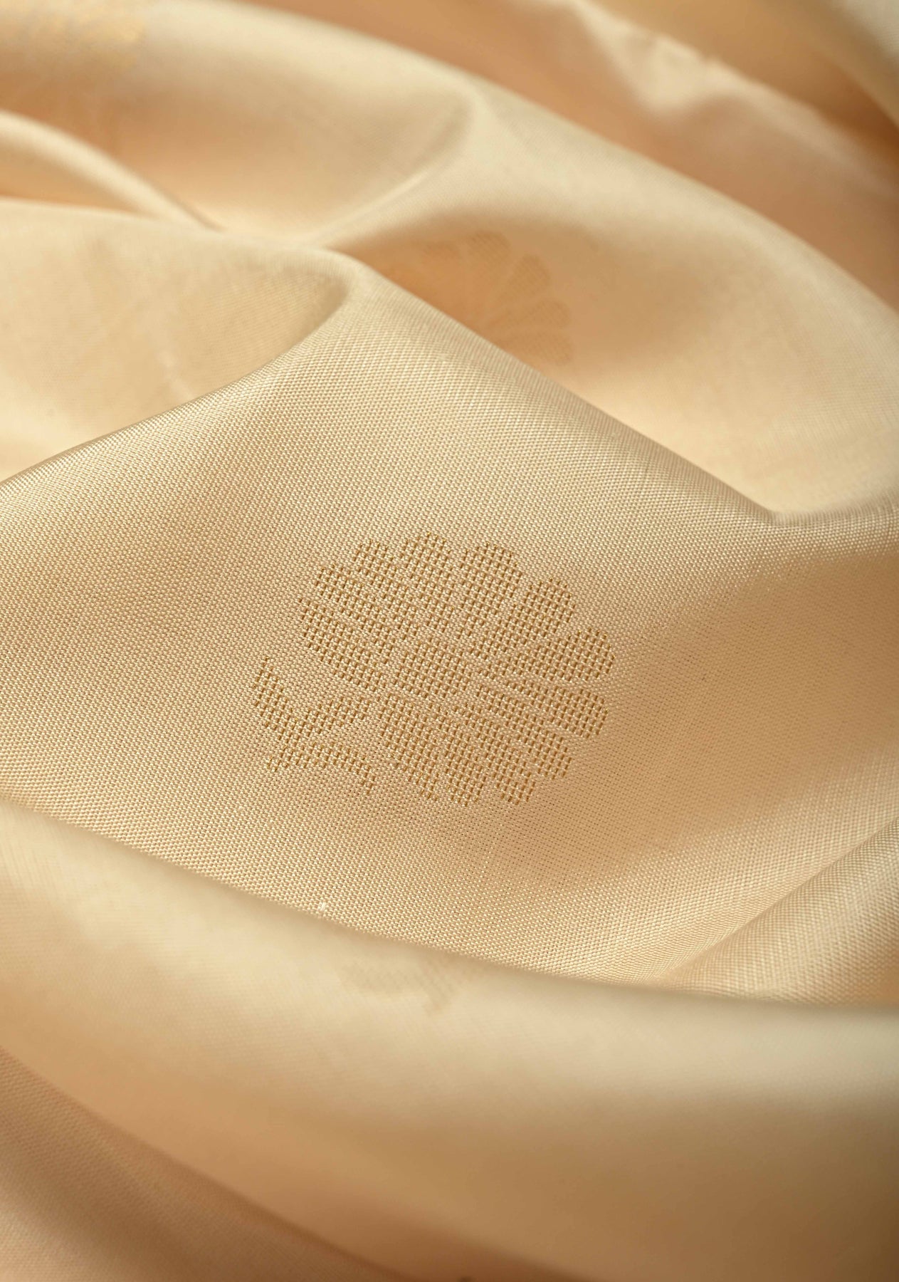 The Off White Kanjivaram Soft Silk Saree with Floral Zari Buttas and Meenakari Cross Stitch Temple Border is a perfect blend of elegance and intricate craftsmanship. Woven from soft Kanjivaram silk, it offers a smooth, luxurious drape that flatters every silhouette. The pristine off-white shade exudes sophistication, while the delicate floral zari buttas add subtle, artistic detailing. The Meenakari cross-stitch temple border provides a regal and colorful accent, making it ideal for weddings, festive occasions, and special celebrations. Pair it with a contrasting or matching blouse and statement jewelry for a timeless and graceful ethnic look.