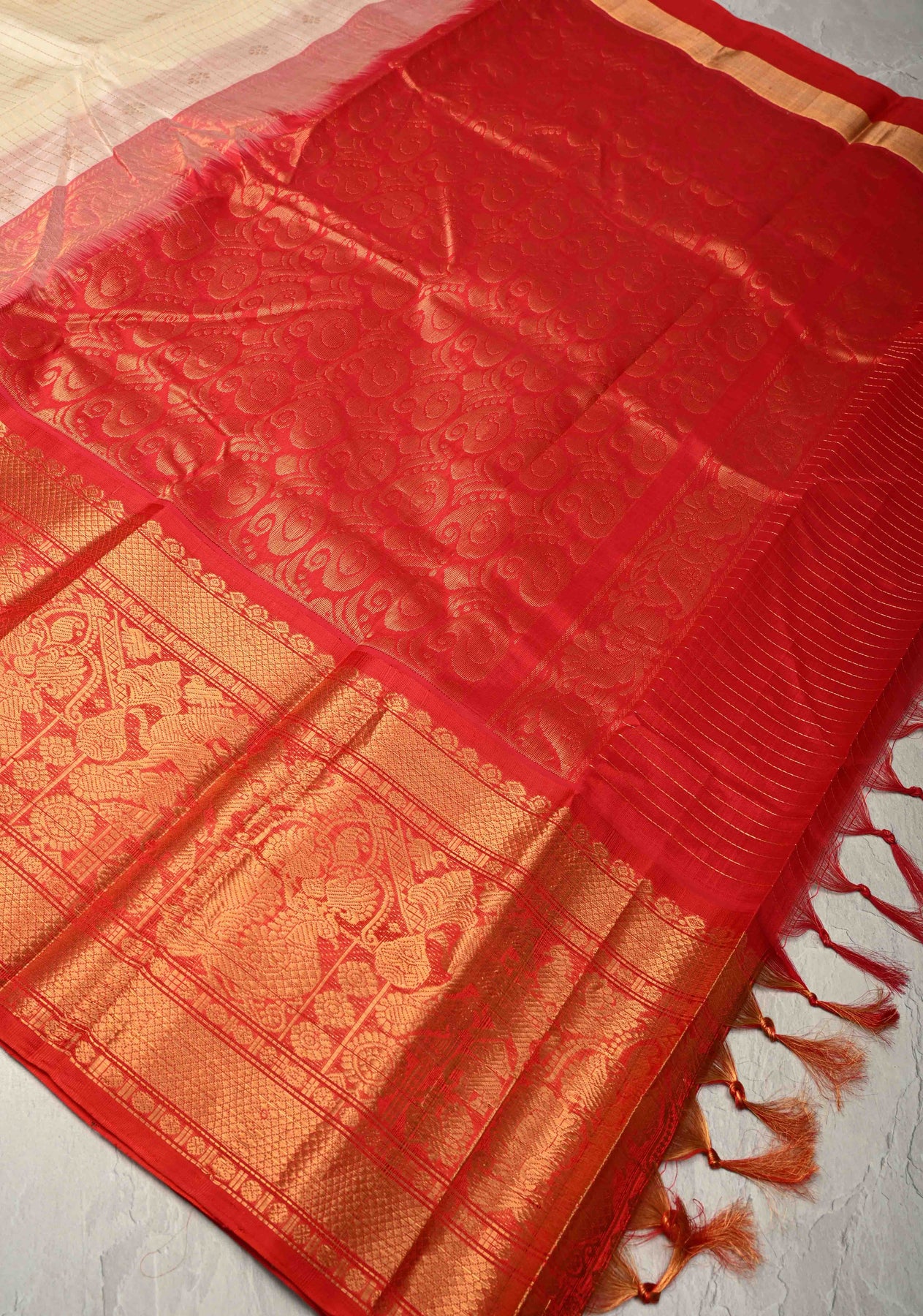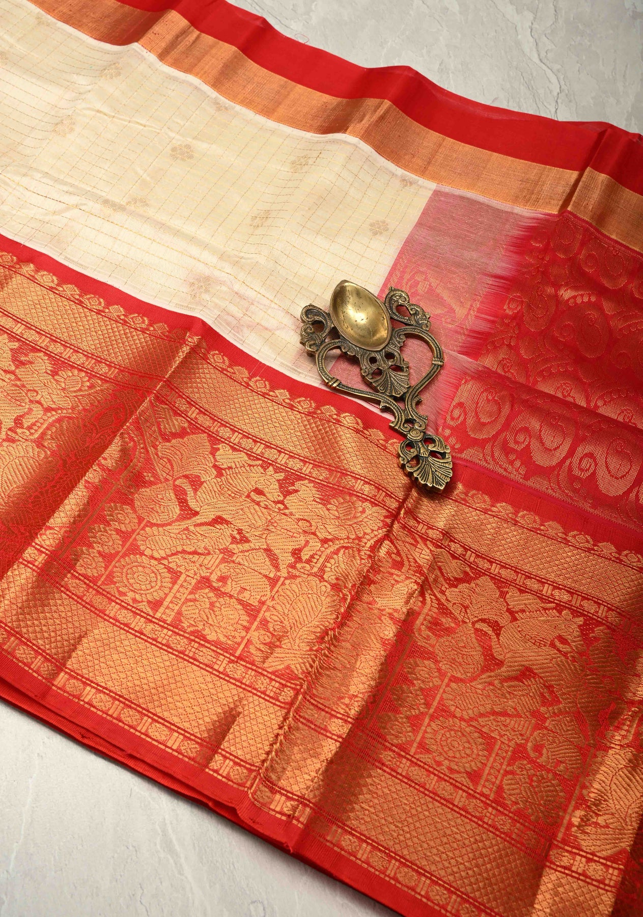 This elegant Off White Kanchi silk cotton saree features classic zari checks woven across the body, creating a timeless and refined look. Delicate zari buttas are intricately placed, adding a subtle shimmer and traditional charm. The saree is beautifully framed with a wide contrast vanasingaram zari border, showcasing rich motifs inspired by nature and heritage craftsmanship. Crafted in a comfortable silk cotton blend, it offers a graceful drape with breathable ease. Ideal for festive occasions, temple visits, and traditional gatherings, this saree exudes understated sophistication.
