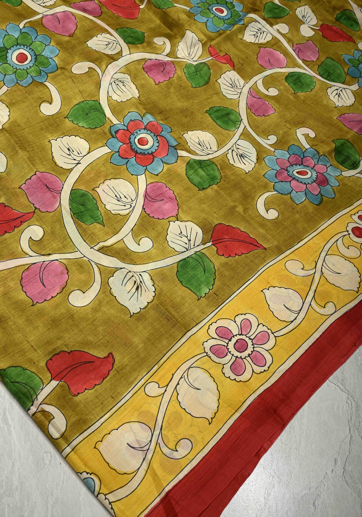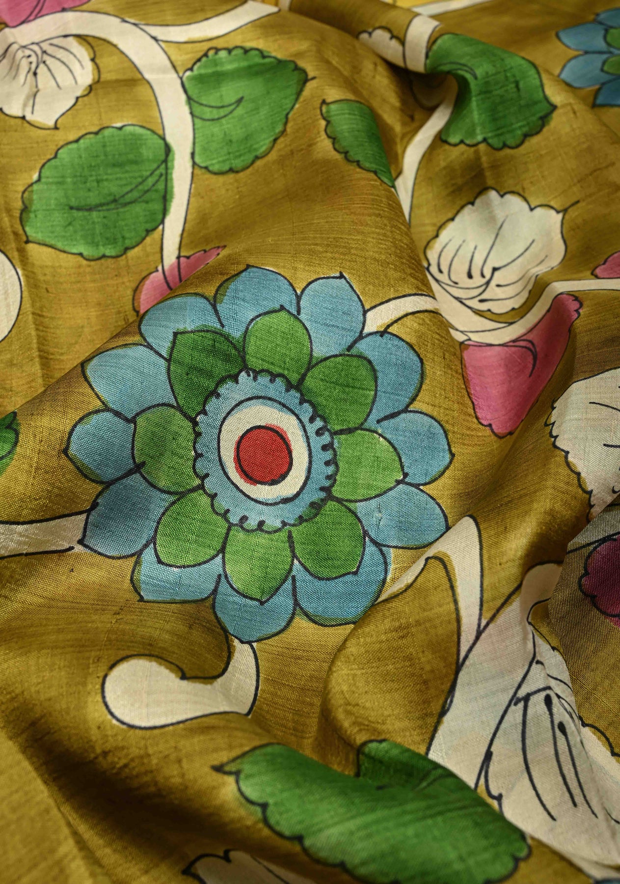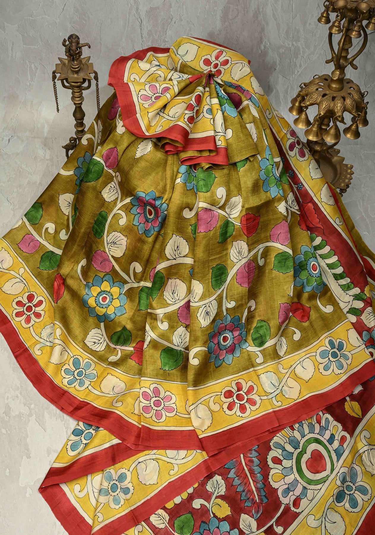 The serene olive green base provides the perfect backdrop for intricate Kalamkari hand paintings, showcasing heritage motifs inspired by nature and mythology. Each saree is a unique piece of wearable art, making it ideal for festive occasions, cultural events, and elegant gatherings. Style it with handcrafted or antique jewelry to complete the classic look.