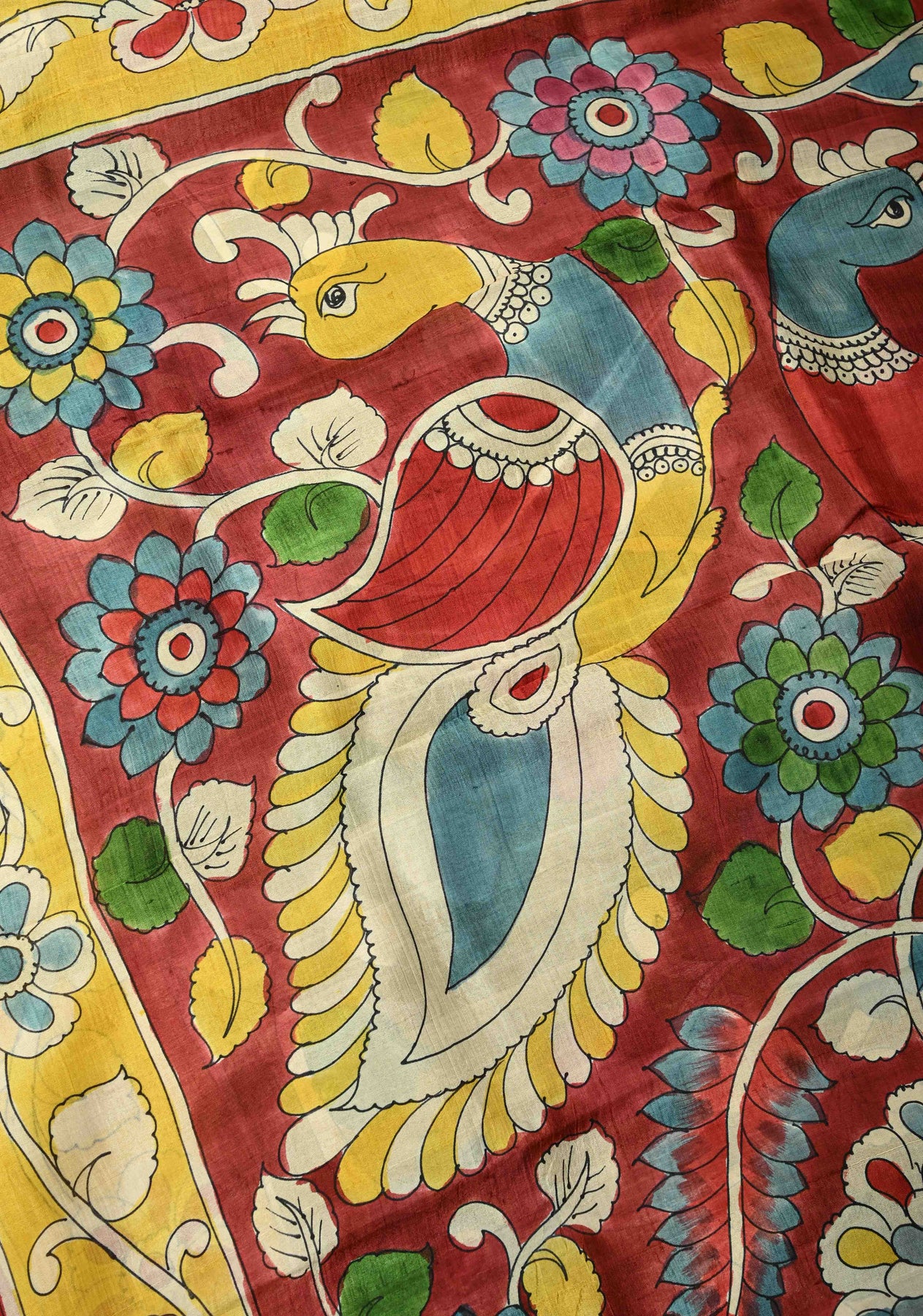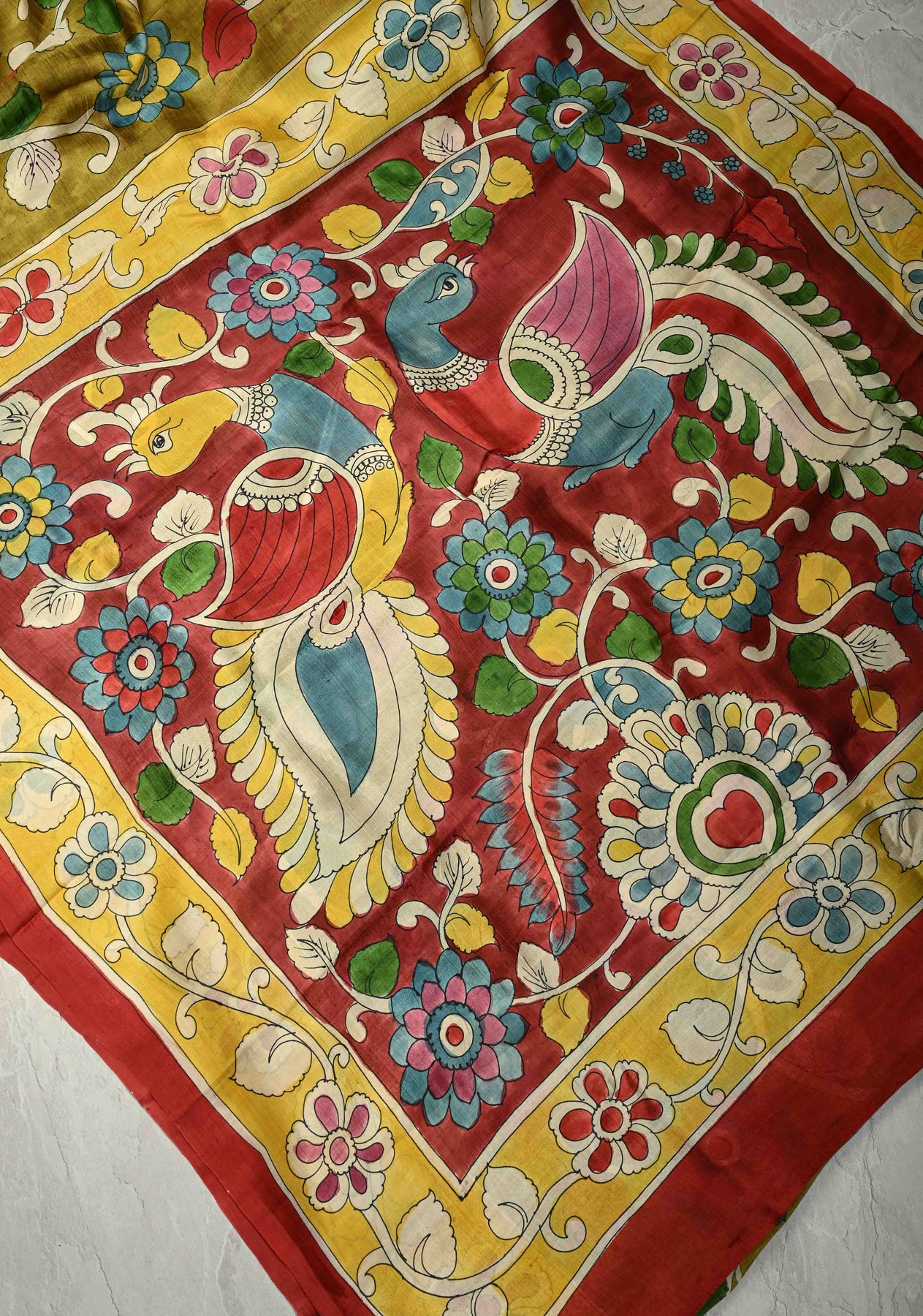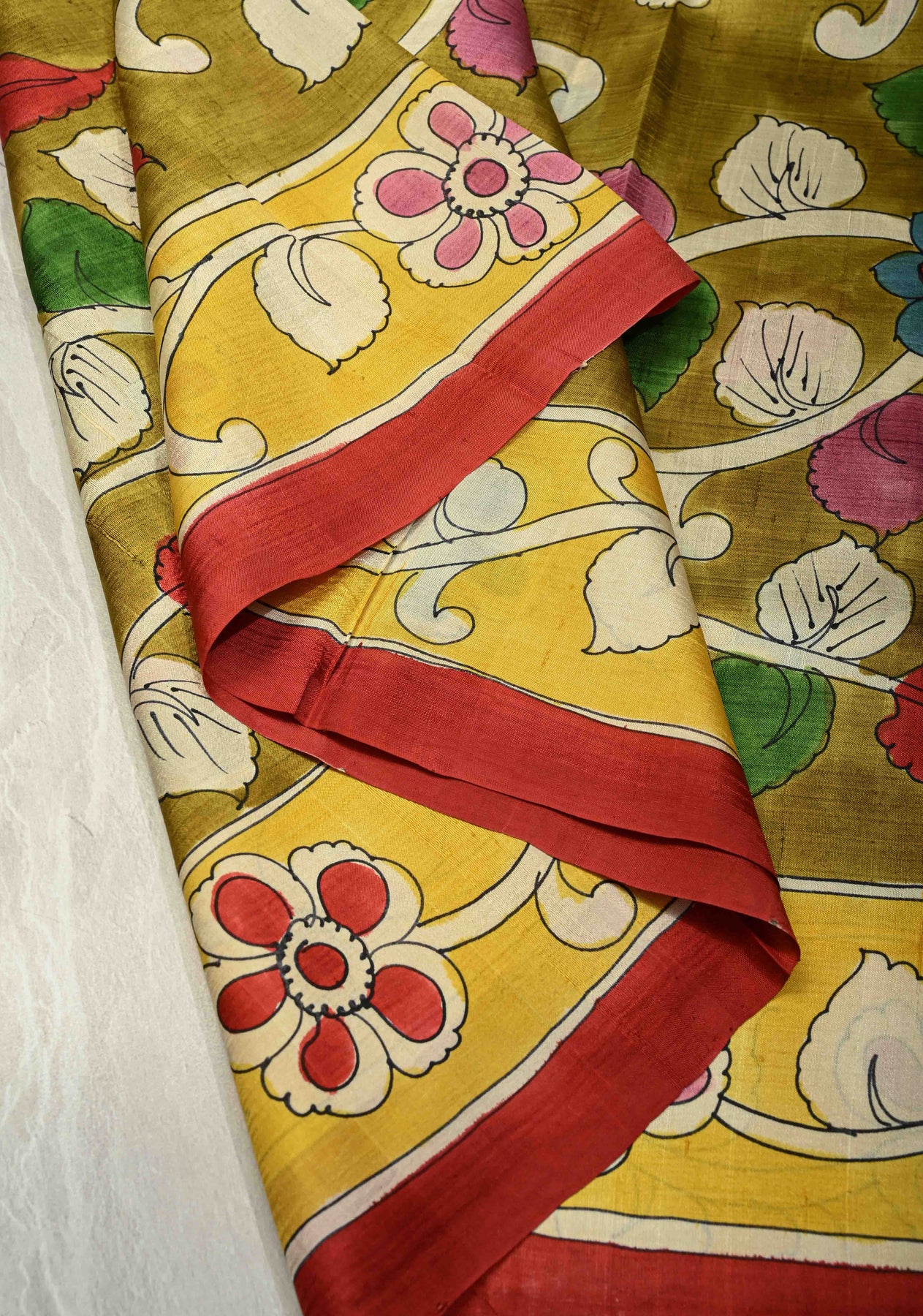 The serene olive green base provides the perfect backdrop for intricate Kalamkari hand paintings, showcasing heritage motifs inspired by nature and mythology. Each saree is a unique piece of wearable art, making it ideal for festive occasions, cultural events, and elegant gatherings. Style it with handcrafted or antique jewelry to complete the classic look.