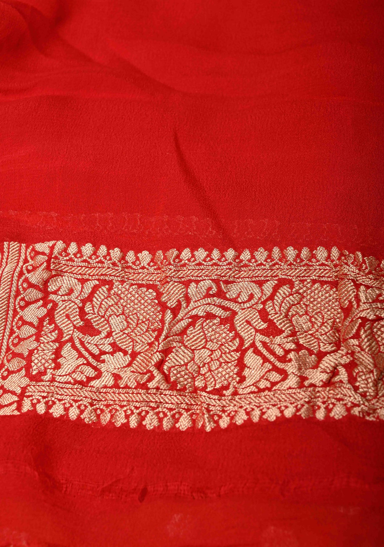 Orange Banarasi Georgette Silk Saree with Floral Butta and Contrast Zari Border | SILK MARK CERTIFIED
