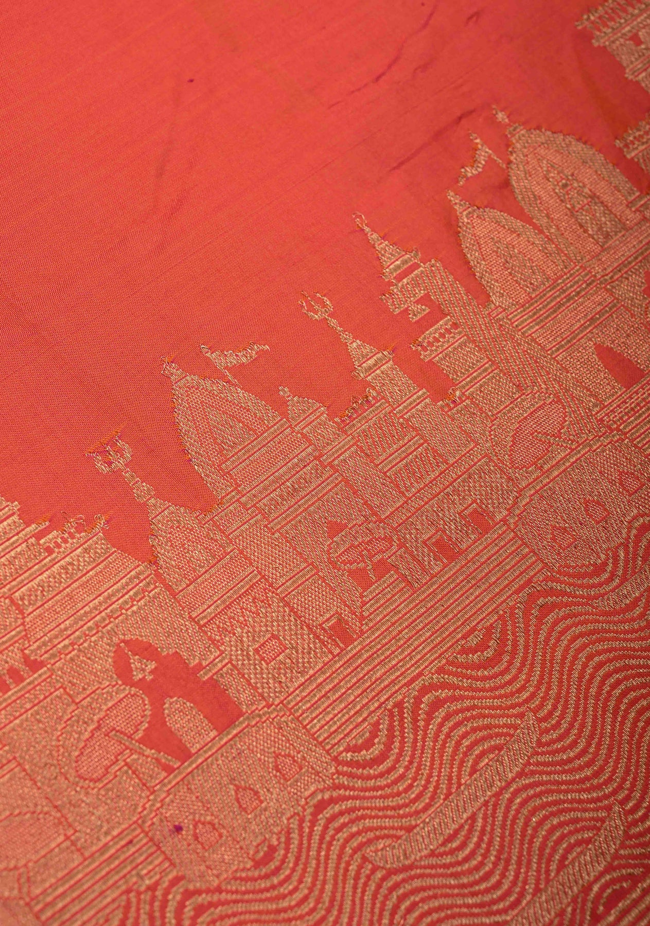 The true showstopper is the intricately woven Ganga Ghat temple zari border, inspired by the sacred ghats and architectural beauty of Varanasi. Woven in radiant gold zari, the border adds a touch of spiritual symbolism and regal grandeur, making this saree perfect for significant occasions.