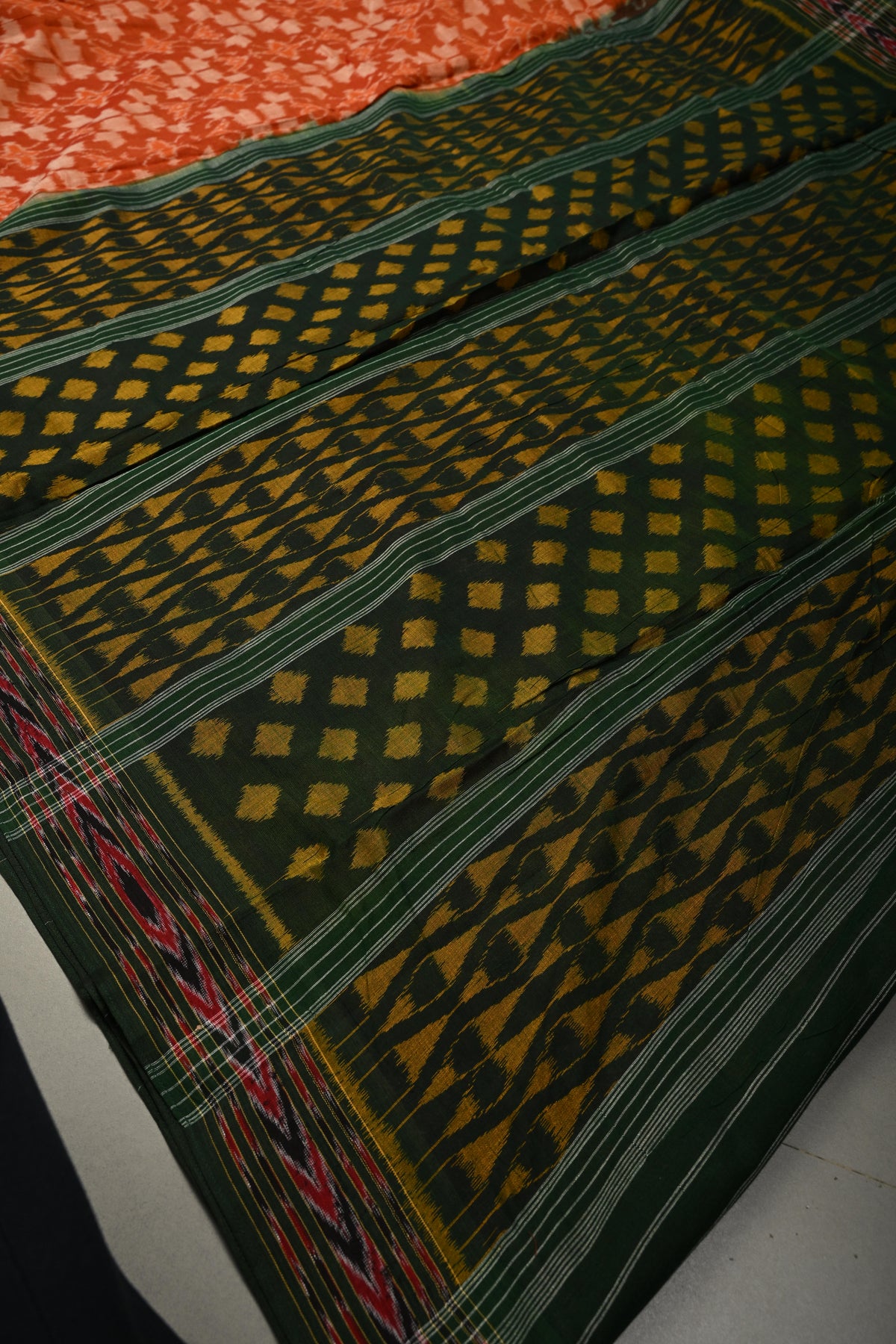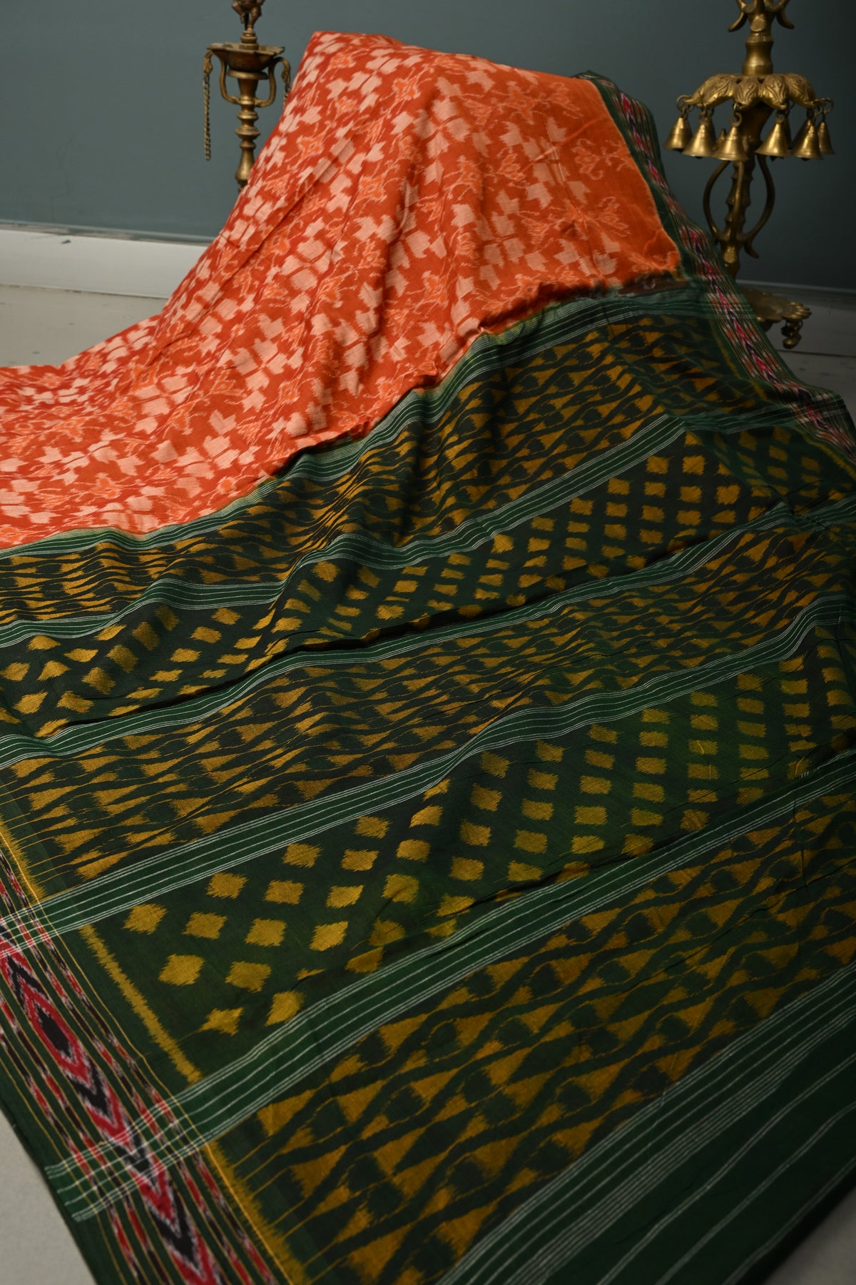 Embrace the vibrant heritage of Odisha with this Orange Sambhalpuri Ikkat Cotton Handloom Saree. Hand-woven from premium breathable cotton, it features traditional ikkat motifs on a brilliant orange body, perfectly framed by a bold contrast border. Subtle zari detailing on the border and pallu adds a touch of sophisticated shimmer. Ideal for daytime festivities or professional office wear, this saree seamlessly blends ethnic charm with all-day comfor