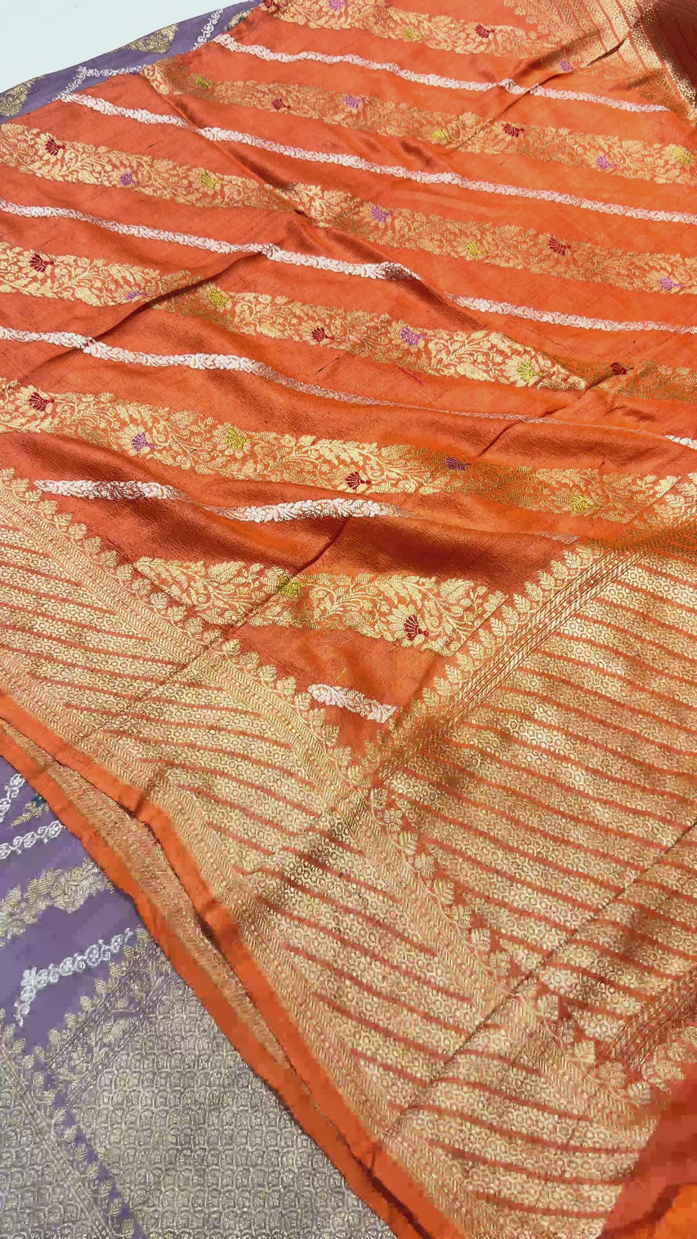 Orange Kaduwa Weave on Banarasi Tussar Georgette Saree with Ornate Stripes and Zari Border| SILK MARK CERTIFIED
