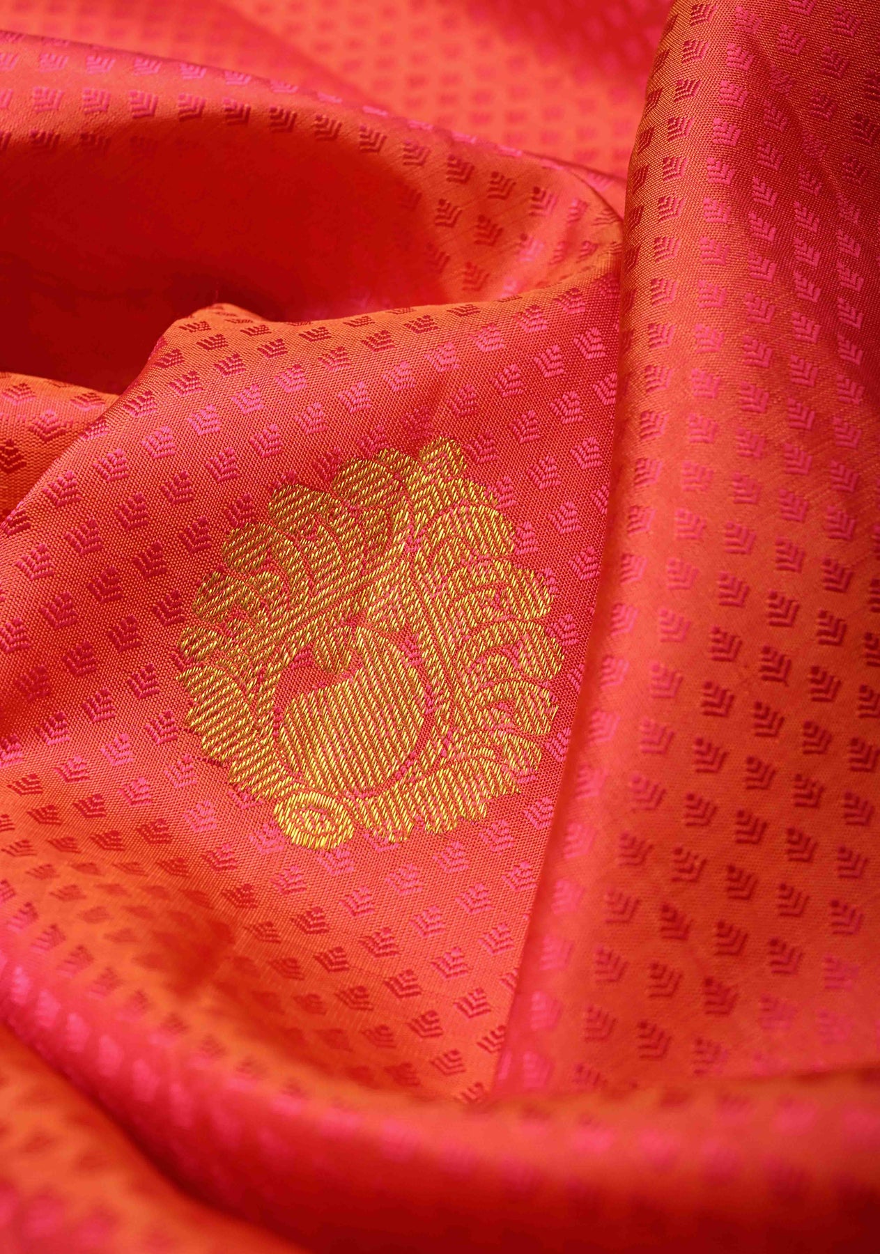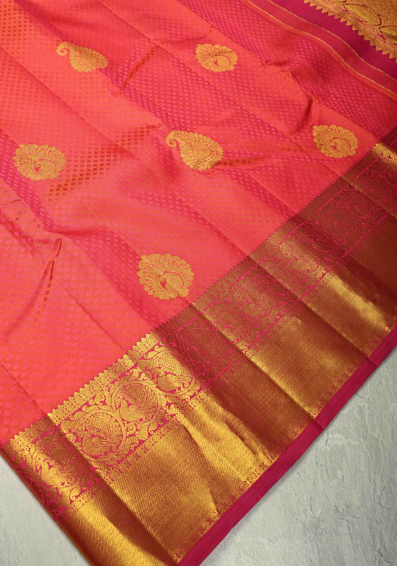 This Orange-Pink Dual Tone Pure Kanjivaram Silk Saree is a stunning representation of traditional craftsmanship and modern elegance. The saree features a dual-tone of orange and pink, blending harmoniously to create a radiant, warm glow. The fabric is adorned with a self-brocade pattern, adding a layer of intricate texture that enhances its luxurious appeal.