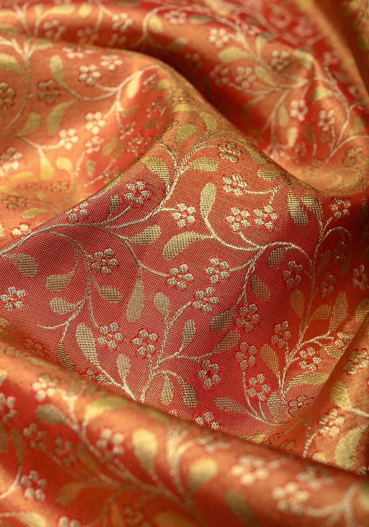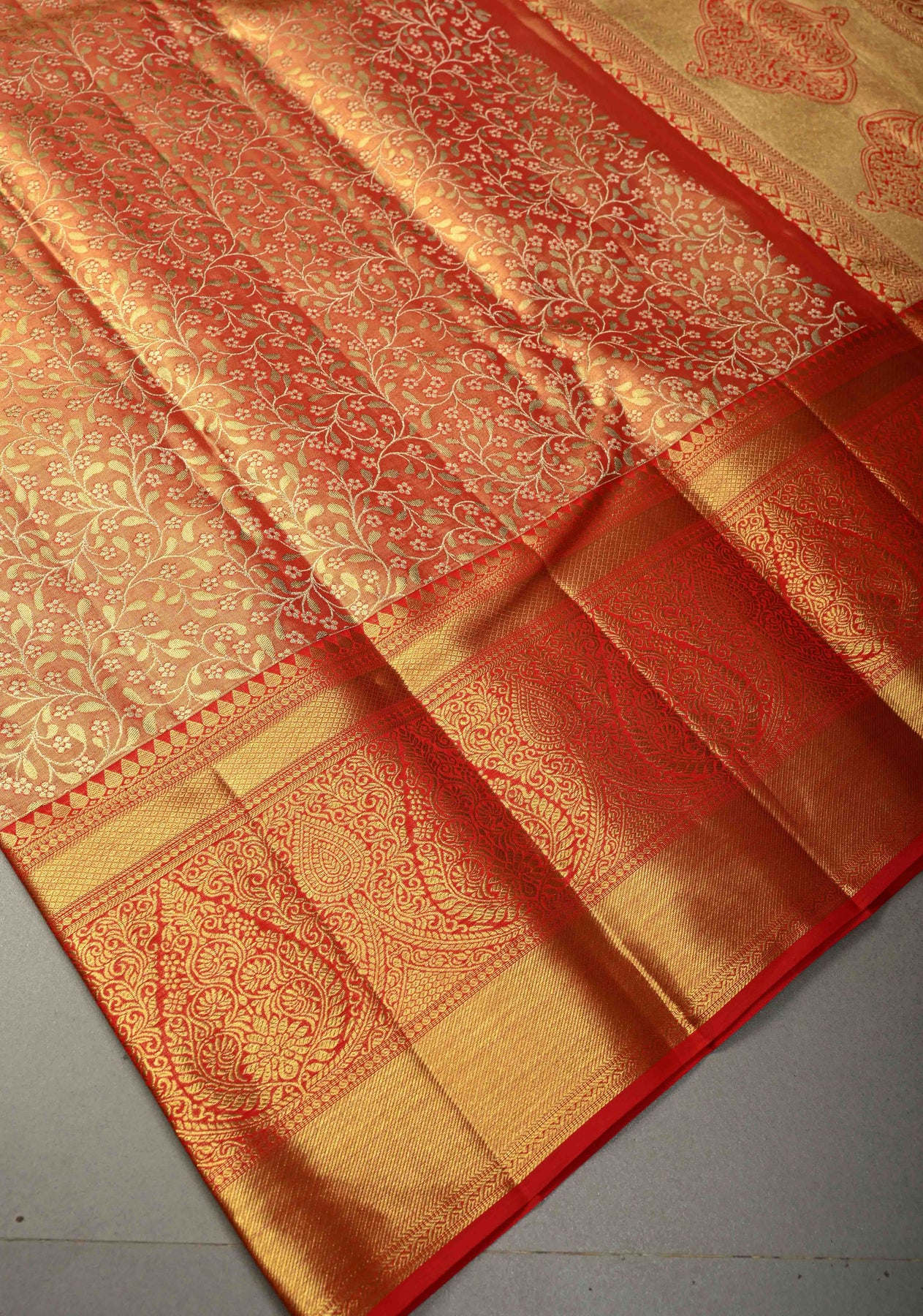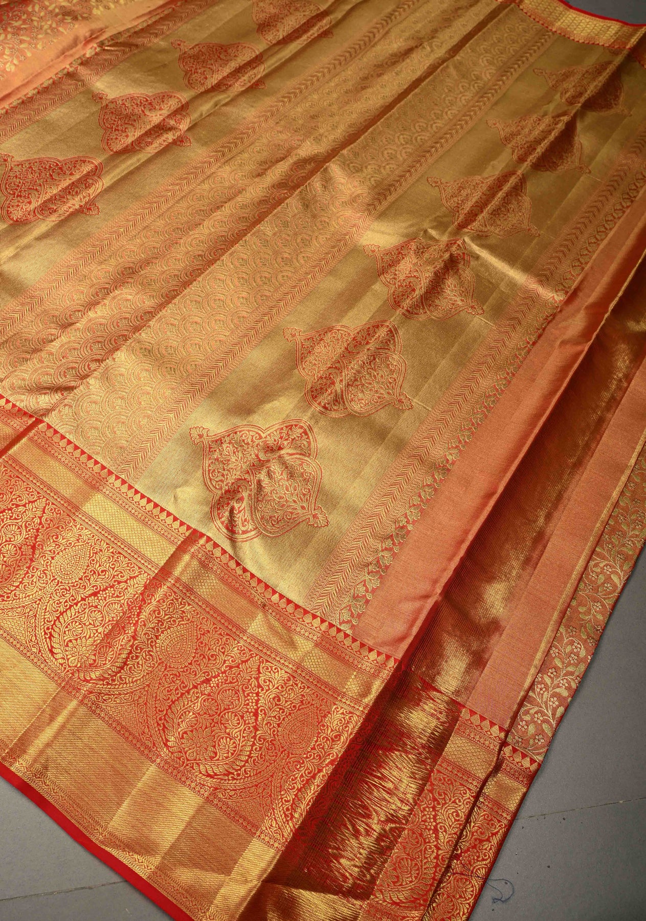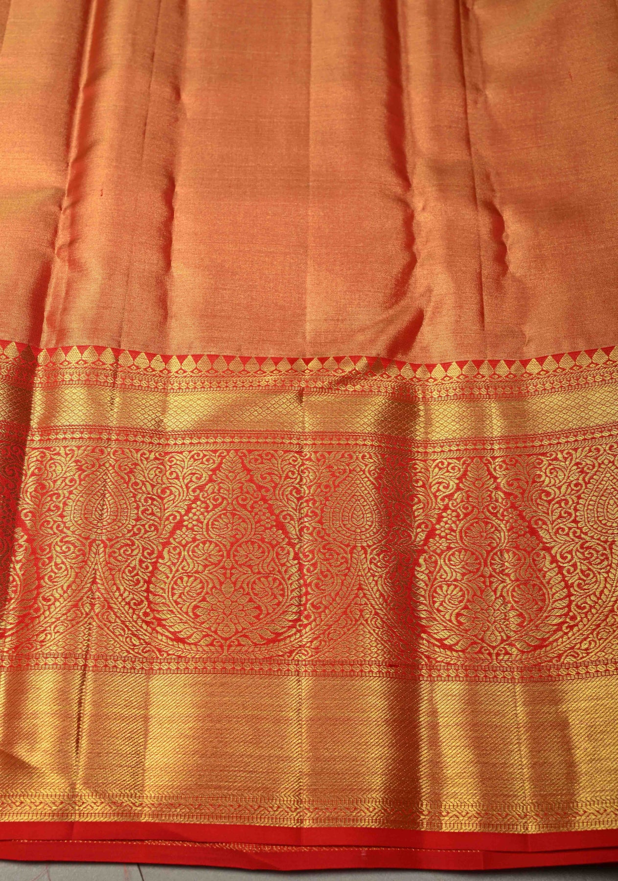 Radiant and regal, this Orange Tissue Kanjivaram Pure Silk Saree is a stunning expression of South Indian handloom artistry. Woven from pure silk tissue, the saree has a luminous sheen and an elegant, structured drape that enhances its festive appeal.