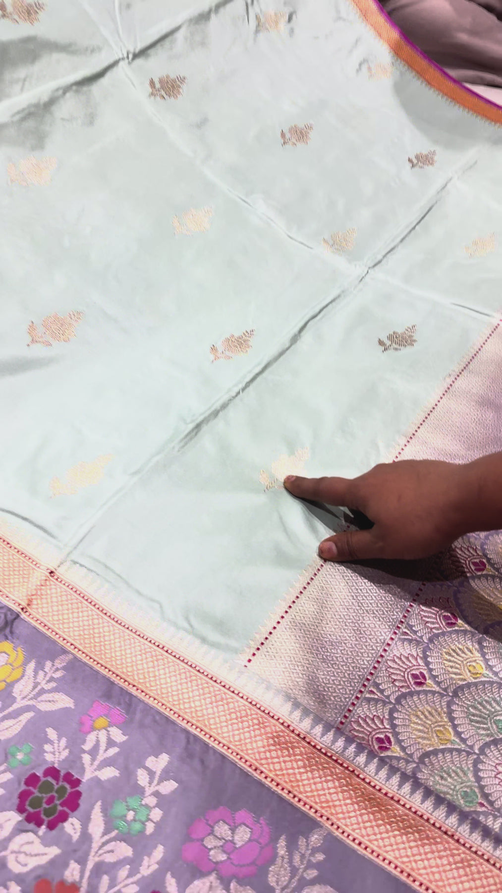 Graceful and serene, this Pastel Aqua Blue Banarasi Pure Katan Silk Saree is a timeless blend of delicate color and intricate craftsmanship. Woven from luxurious pure Katan silk, the saree is adorned with exquisite Sona Rupa Khadua buttas—gold and silver zari motifs painstakingly handwoven for lasting beauty. The highlight is the striking Paithani-style skirt border, featuring vibrant floral patterns that add a regal Maharashtrian touch to the soft Banarasi base. Perfect for weddings, festive occasions, or elegant celebrations, this saree captures the essence of tradition with a fresh, pastel twist—an heirloom piece for the modern connoisseur.
