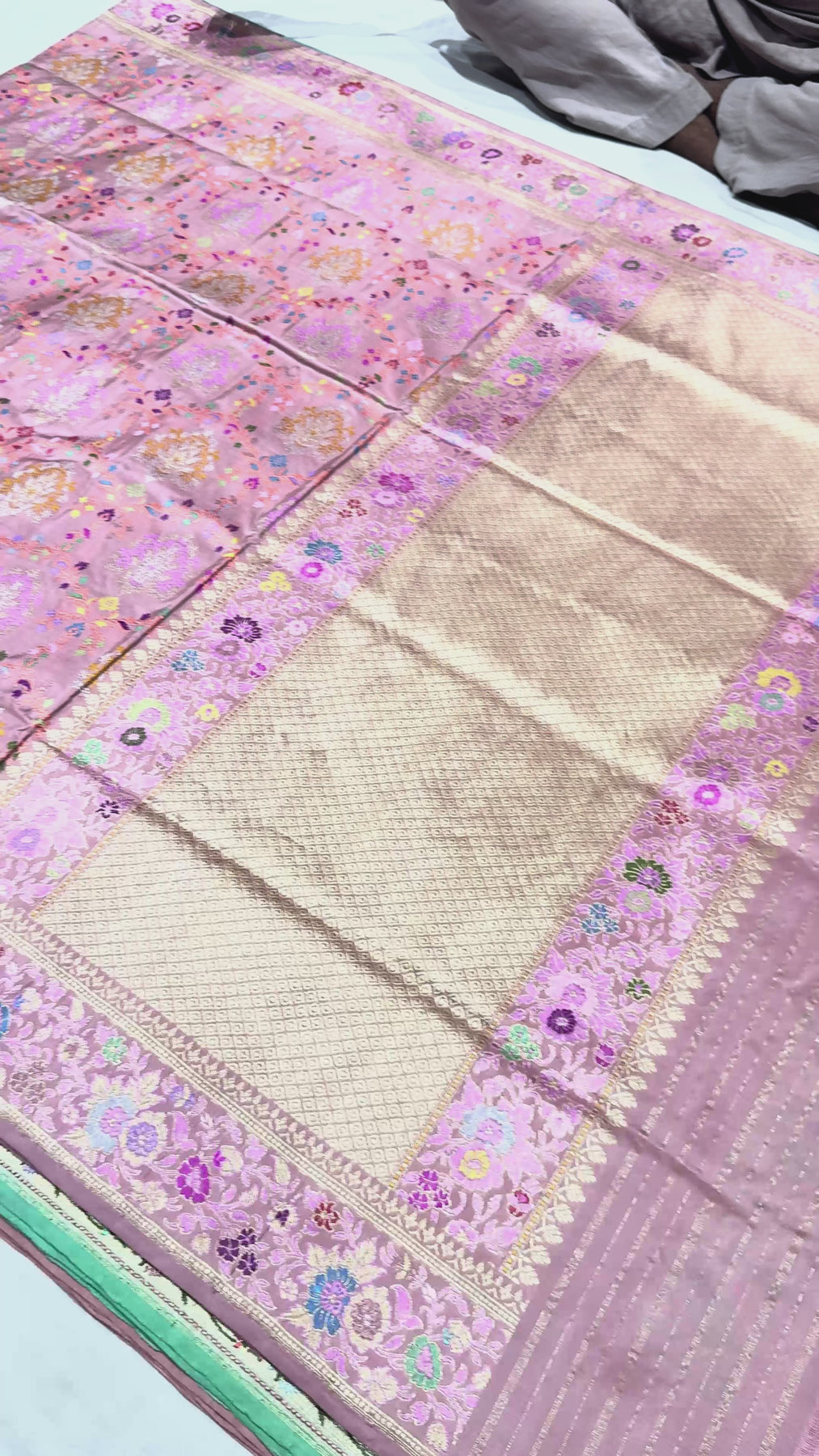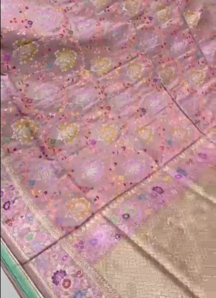 Pastel Hued Banarasi Tissue Silk Saree with Kadhuwa Floral Meenakari Jungla weave with Framed Border | SILK MARK CERTIFIED