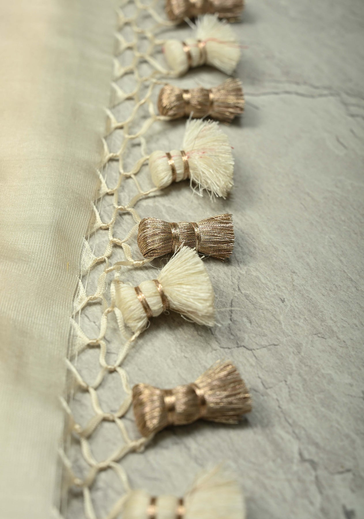 This saree is ready to wear with fall and pico done. Handmade silk tassels adorn the pallu and add more grace to it. An unstitched blouse fabric is included.