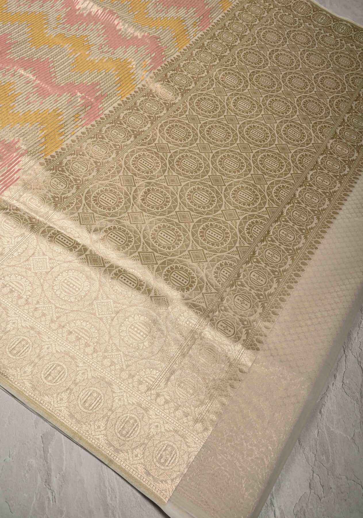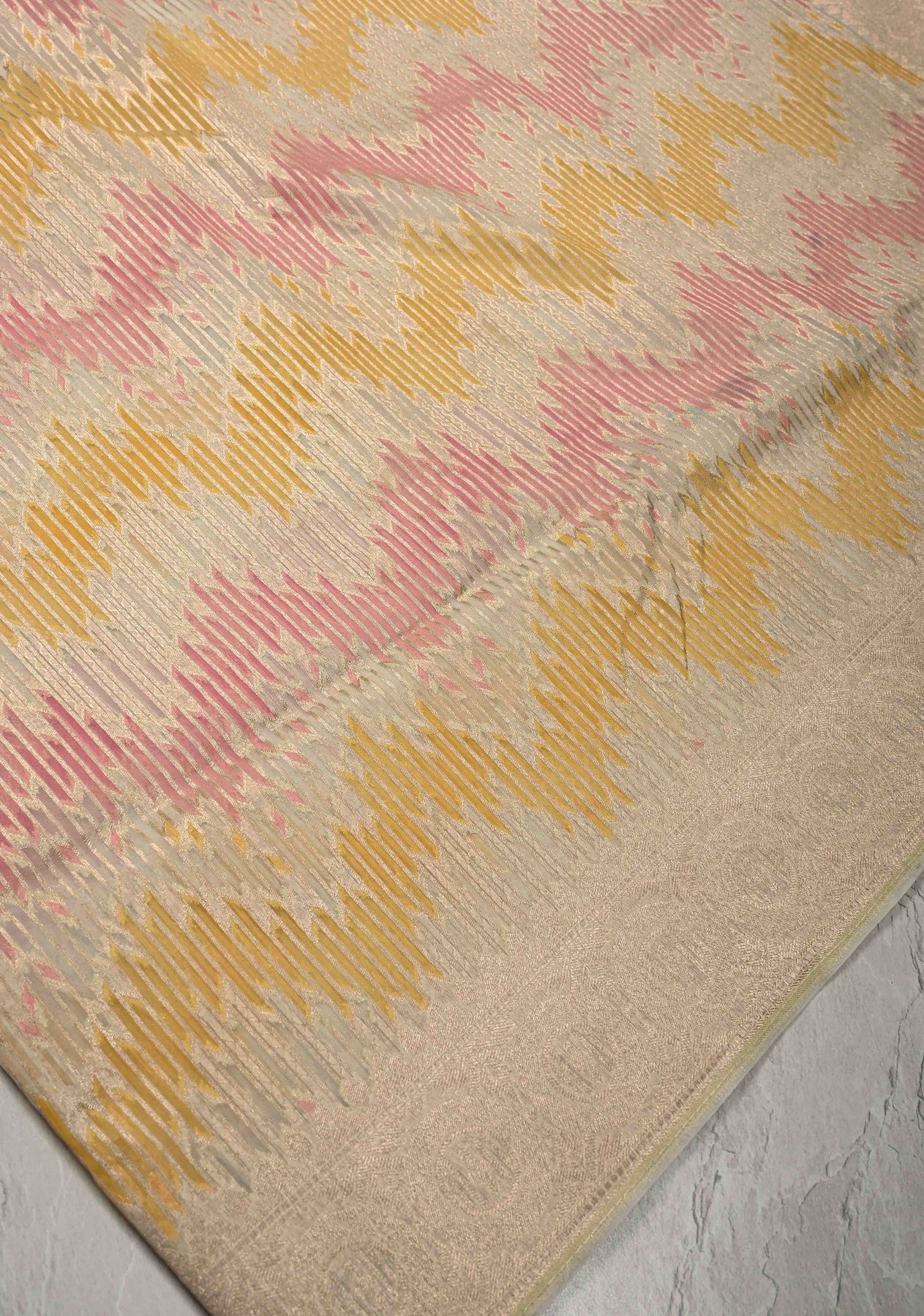 Soft, elegant, and effortlessly graceful, this Banarasi semi-kora saree features a pastel-hued Rangkaat style that brings a refreshing twist to a traditional weave. The body is adorned with a striking chevron pattern, lending a modern and dynamic texture to the saree’s airy, sheer fabric. Crafted with fine Banarasi craftsmanship, the semi-kora base offers a lightweight yet structured drape, ideal for long celebrations. The shimmering zari border adds a regal touch, making it perfect for festive events, daytime weddings, or elegant gatherings. This saree is a harmonious blend of subtle color, modern design, and timeless tradition.