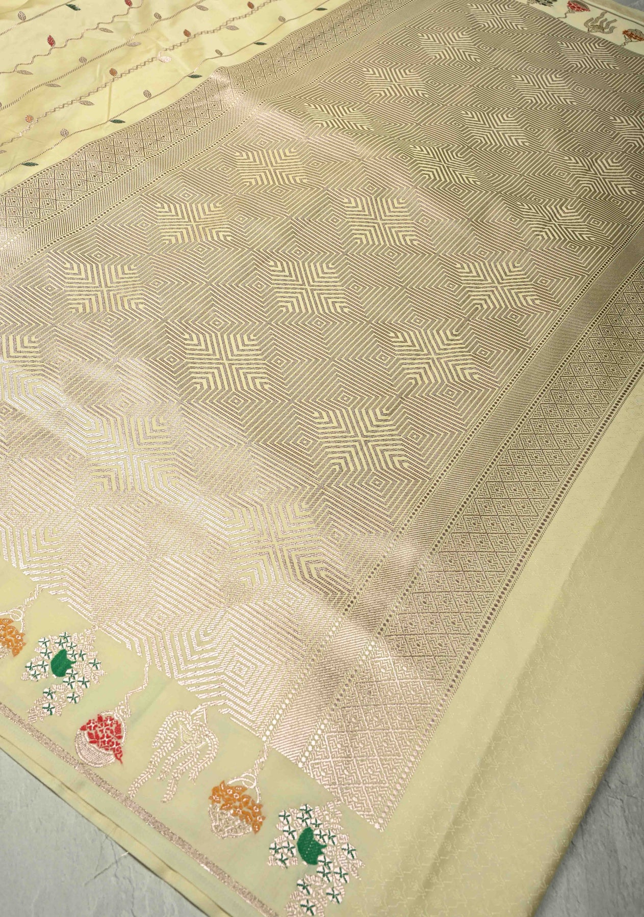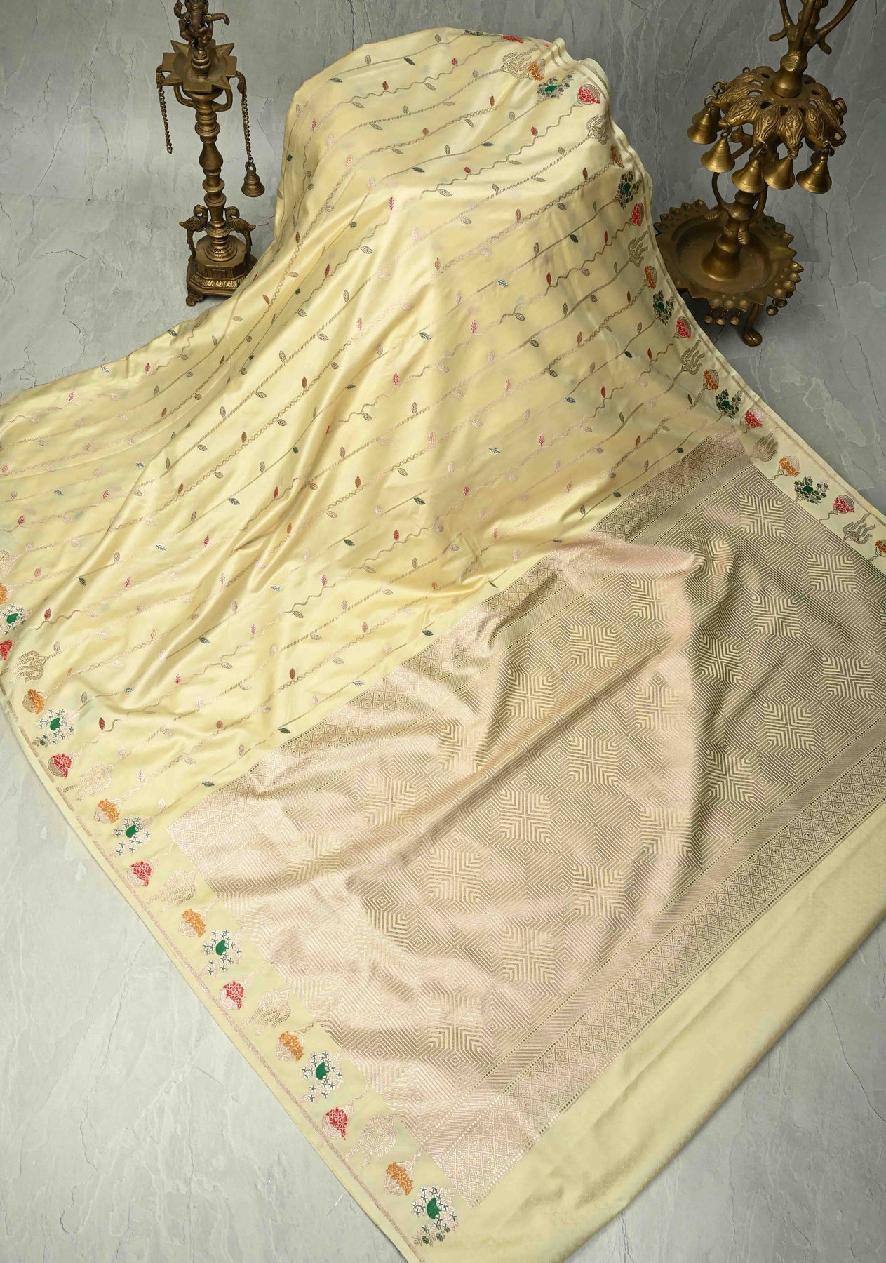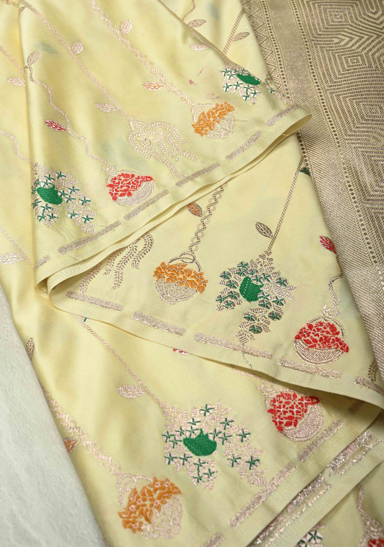 Step into timeless grace with this Pastel Yellow Banarasi Semi Mashru Silk Saree, beautifully woven with exquisite Meenakari-inspired vertical ornate zari stripes. The soft pastel hue adds a touch of sophistication, while the rich Banarasi craftsmanship brings depth, tradition, and luxury to every drape. Perfect for weddings, festive celebrations, and special occasions, this saree blends heritage artistry with modern understated charm.