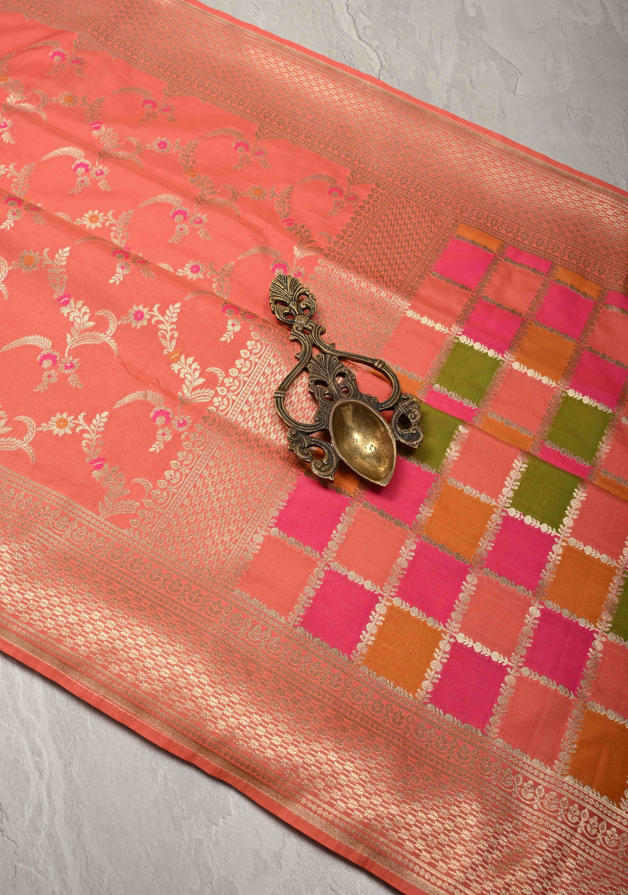 Radiating warmth and elegance, this peach orange semi-silk saree is a captivating blend of traditional artistry and refined design. The saree features an intricate Meenakari jaal woven across the body, showcasing vibrant, multi-hued motifs that reflect skilled craftsmanship. The rich zari border adds a luxurious shimmer, enhancing the saree’s festive appeal. With its soft texture and graceful drape, this saree is perfect for weddings, festive occasions, and cultural celebrations, offering a timeless yet vibrant look that exudes grace and tradition.