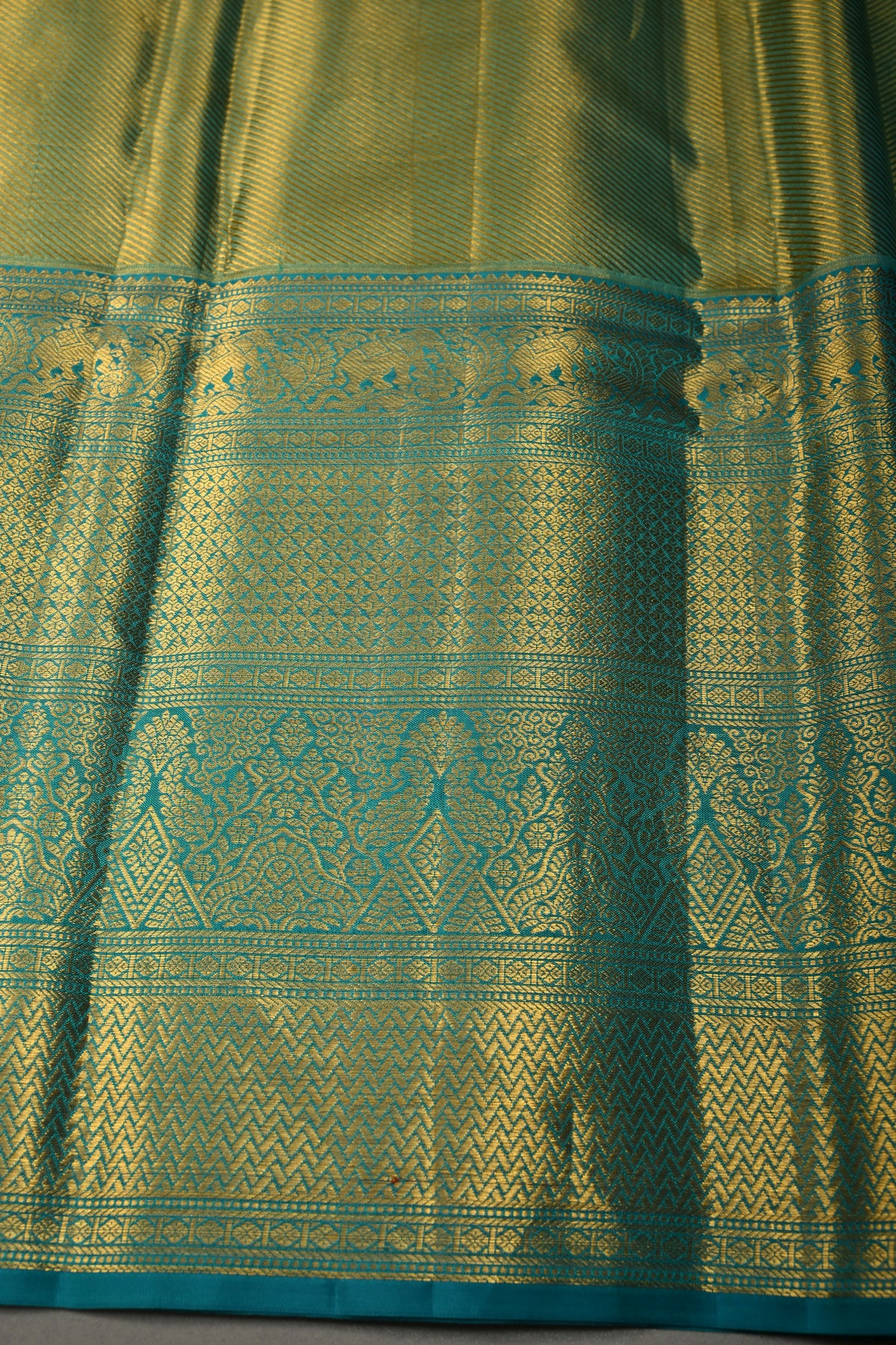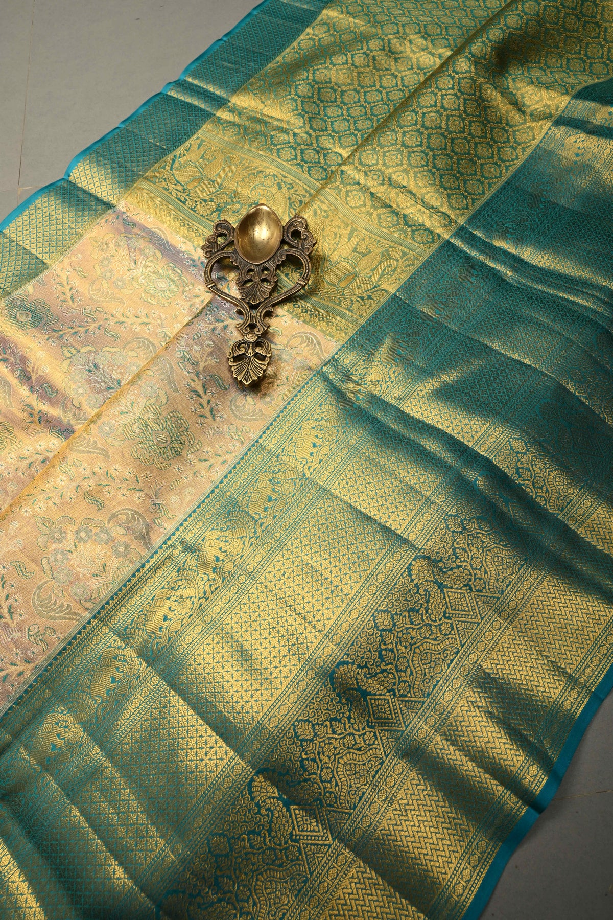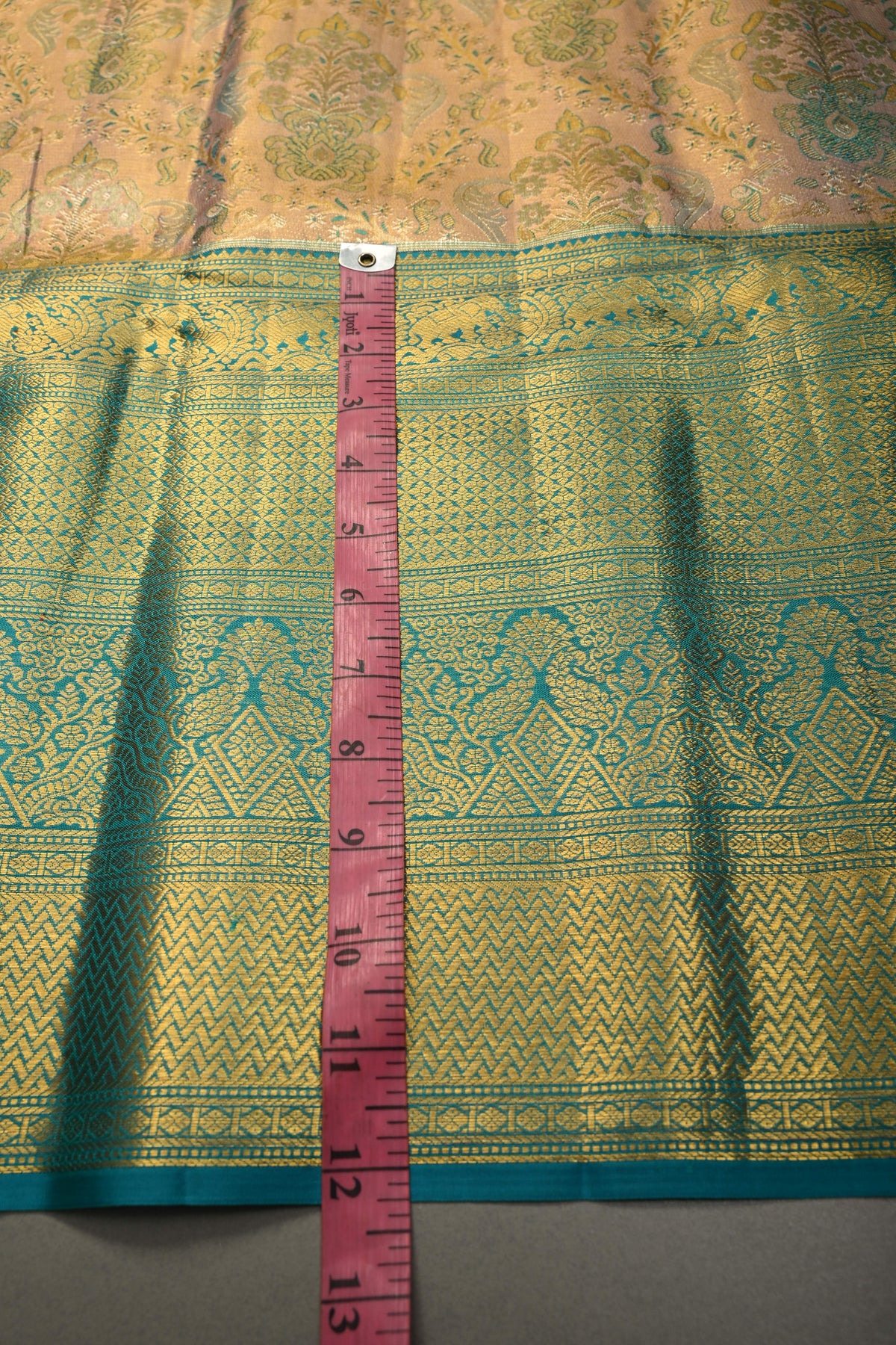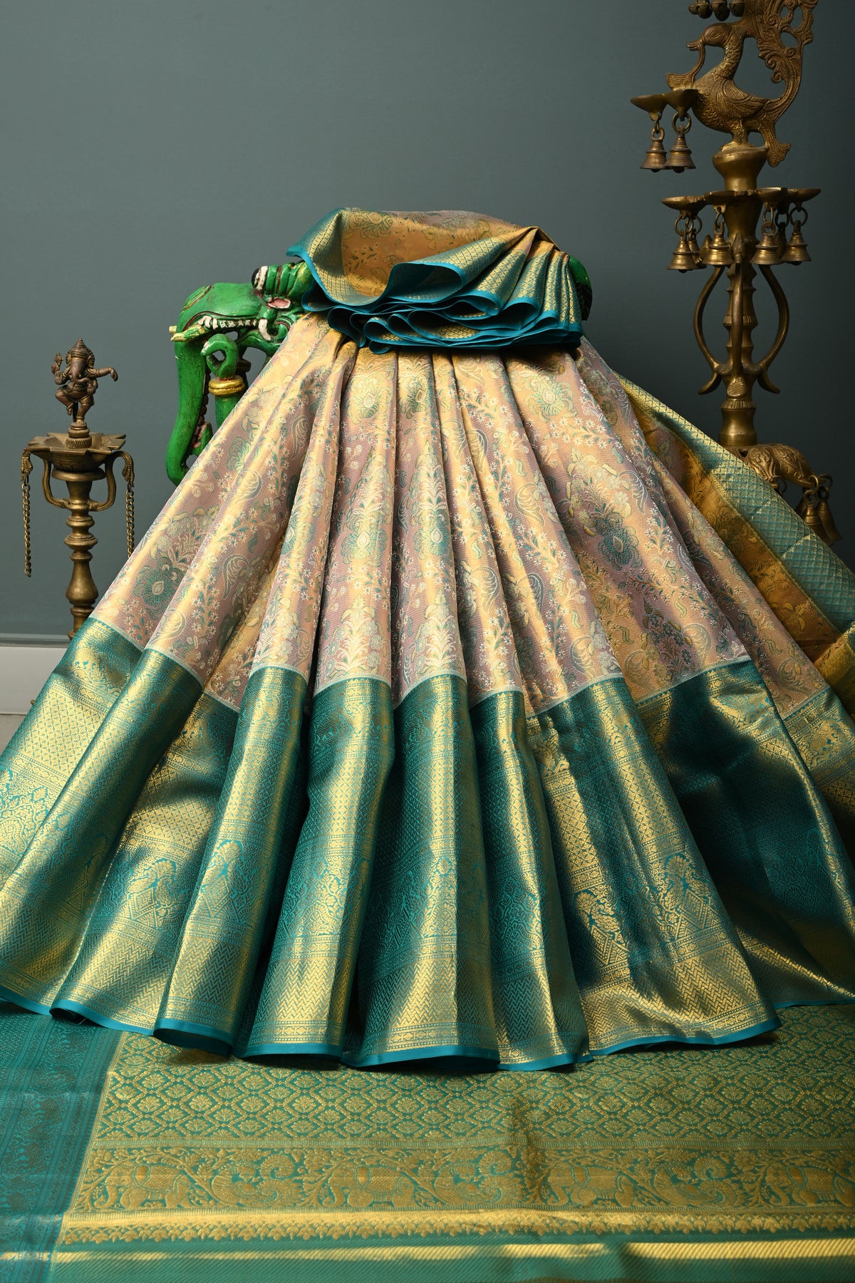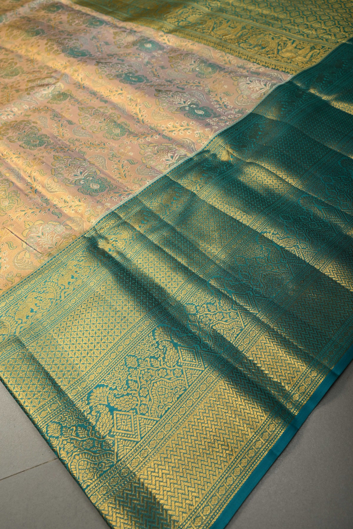 Exude grace and elegance with this Peach Pure Kanjivaram Tissue Silk Saree with Meenakari Floral Brocade and Contrast Zari Border. Woven from pure Kanjivaram tissue silk, this saree offers a lightweight, drape with a soft sheen and smooth texture.