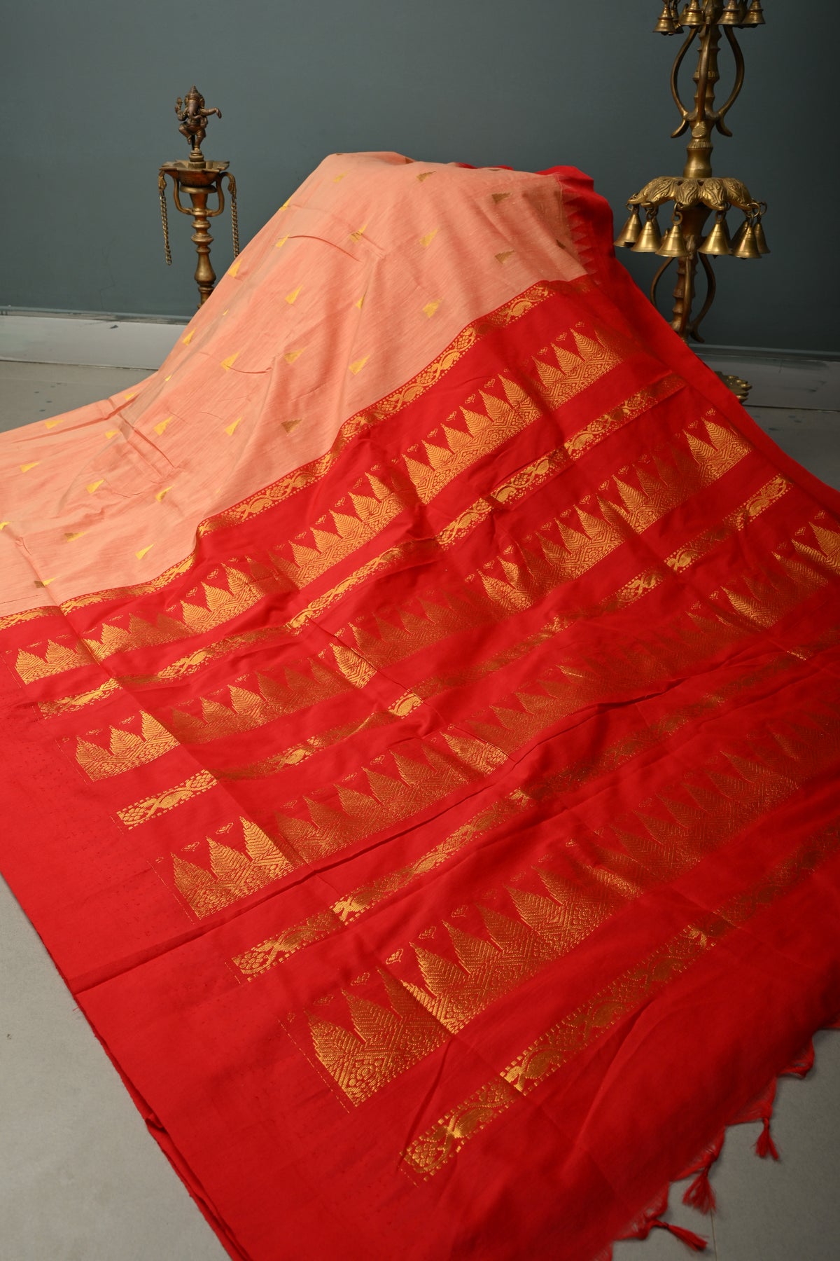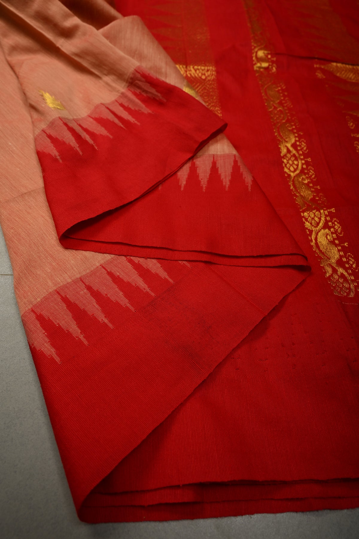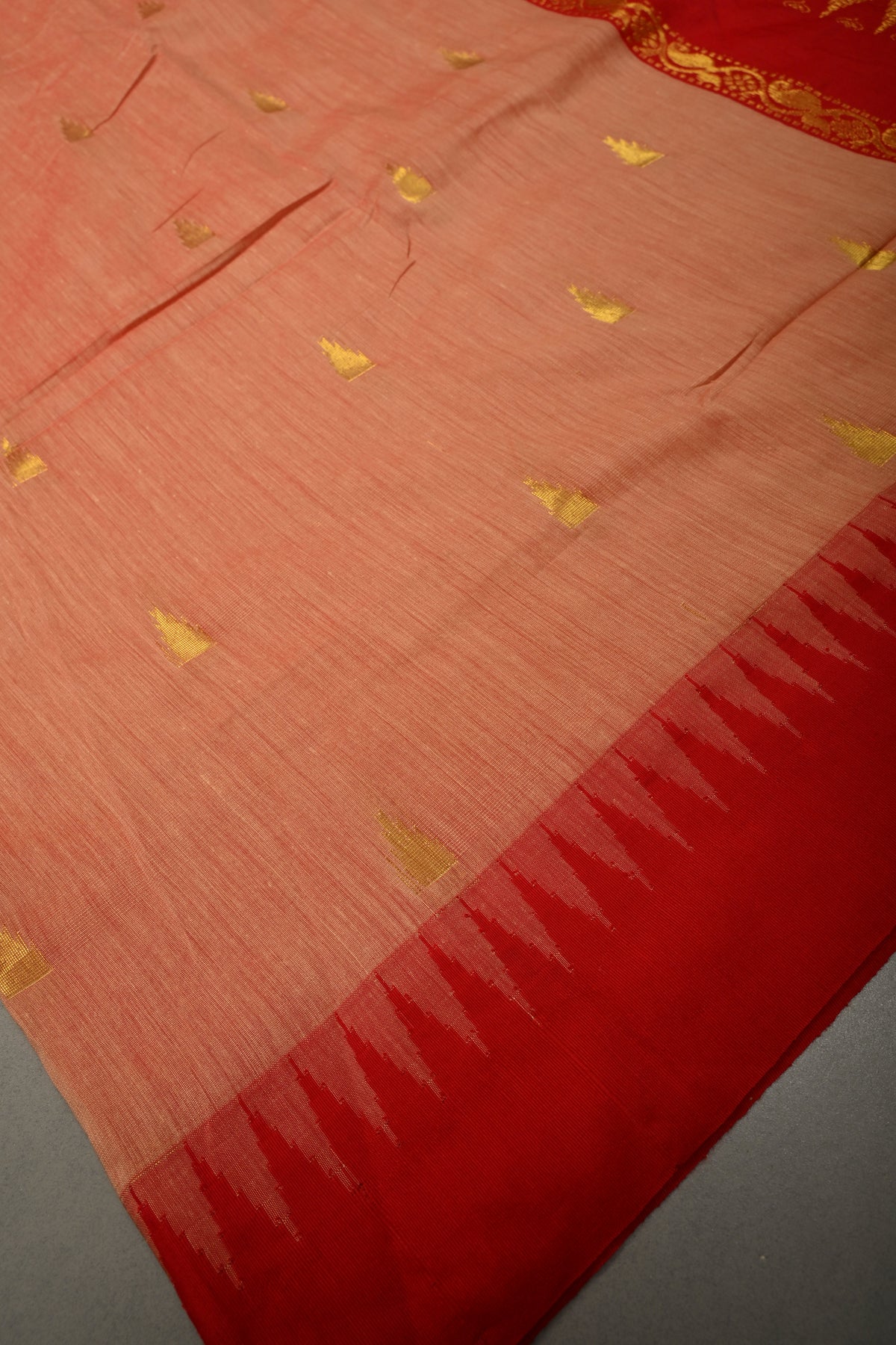 Graceful and timeless, this Peach-Red Cotton Silk Saree beautifully combines soft elegance with traditional artistry. The soothing peach body is perfectly complemented by a red contrast, creating a striking yet harmonious look. Adorned with intricate temple zari buttas woven across the saree, it reflects classic South Indian design elements inspired by sacred temple architecture. The contrast border enhances its grandeur with fine detailing, adding depth and definition to the overall drape. Crafted from a comfortable cotton silk blend, this saree offers a lightweight feel with a refined sheen, making it ideal for festive occasions, cultural celebrations, and traditional gatherings.