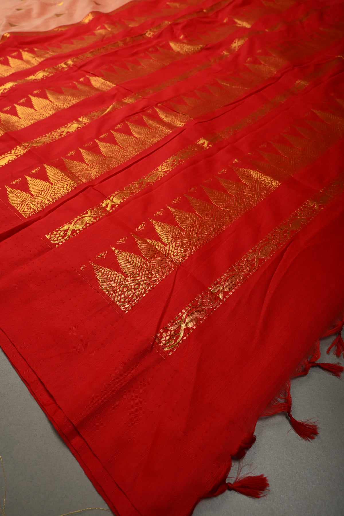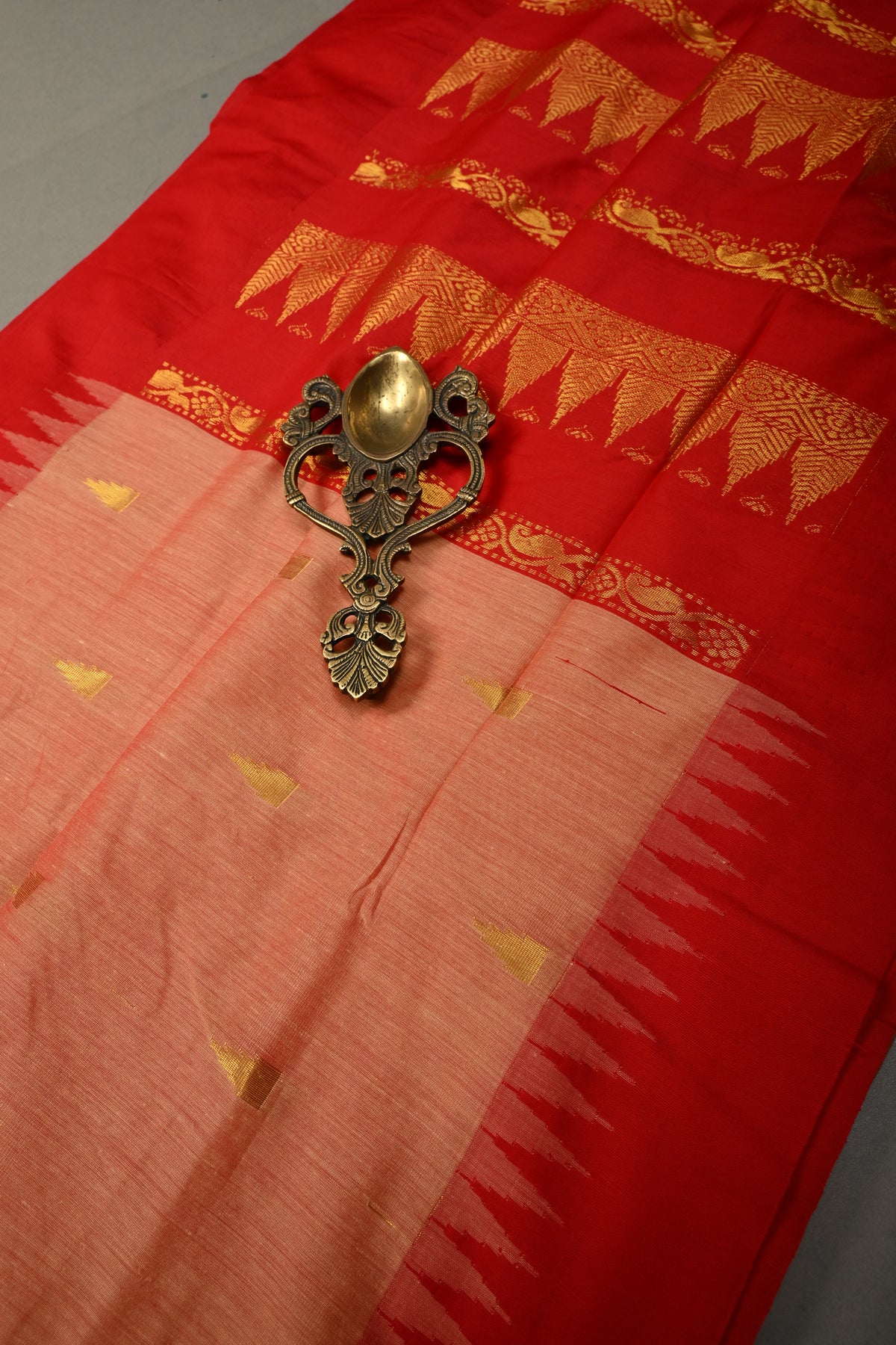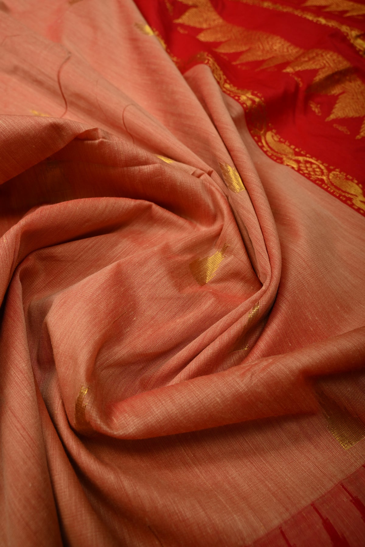 Graceful and timeless, this Peach-Red Cotton Silk Saree beautifully combines soft elegance with traditional artistry. The soothing peach body is perfectly complemented by a red contrast, creating a striking yet harmonious look. Adorned with intricate temple zari buttas woven across the saree, it reflects classic South Indian design elements inspired by sacred temple architecture. The contrast border enhances its grandeur with fine detailing, adding depth and definition to the overall drape. Crafted from a comfortable cotton silk blend, this saree offers a lightweight feel with a refined sheen, making it ideal for festive occasions, cultural celebrations, and traditional gatherings.
