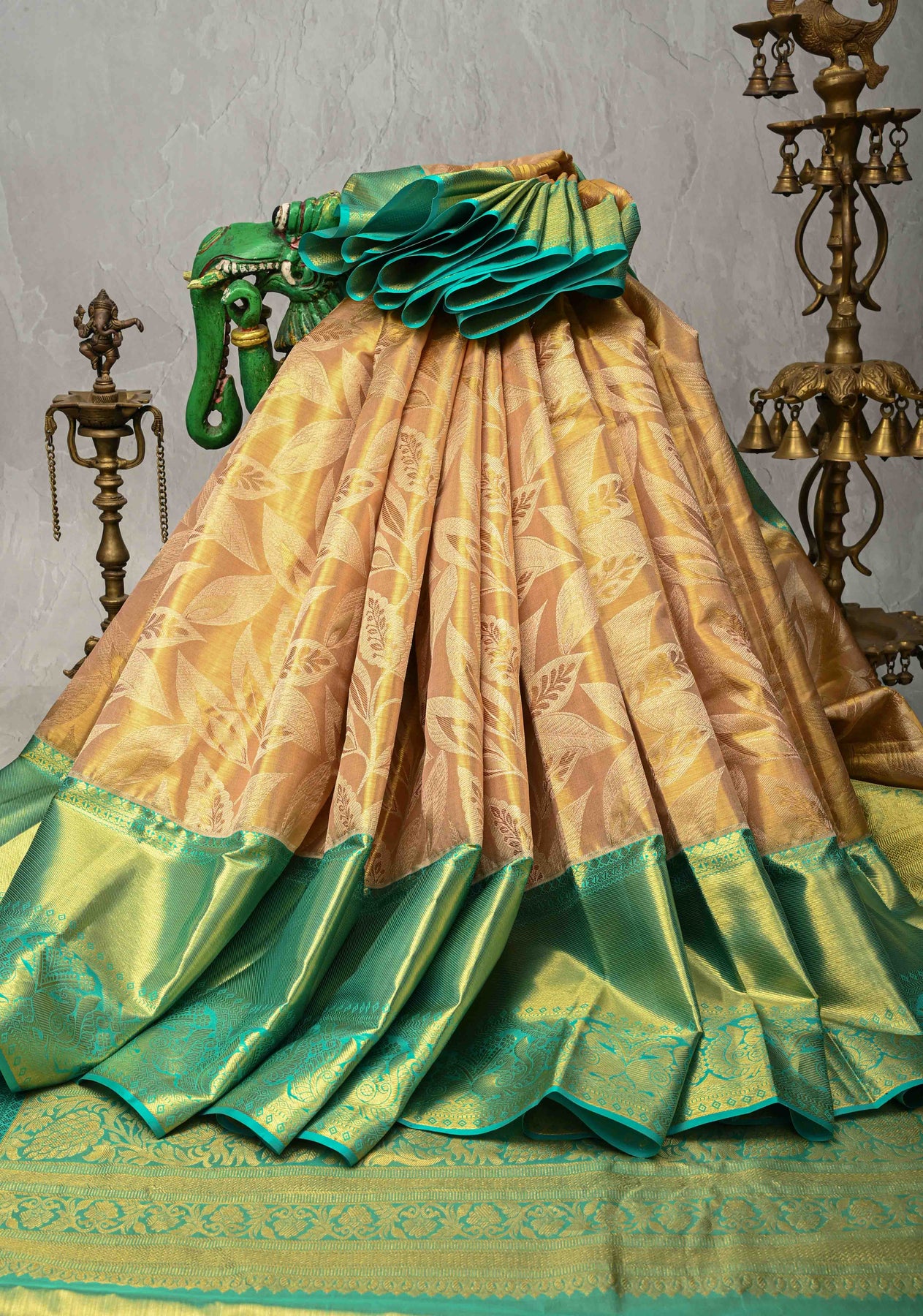 Embrace the perfect harmony of tradition and elegance with this exquisite Peach Tissue Kanjivaram Pure Silk Saree. Crafted from pure silk with a delicate tissue finish, the saree radiates a soft, ethereal glow that complements its graceful peach hue.