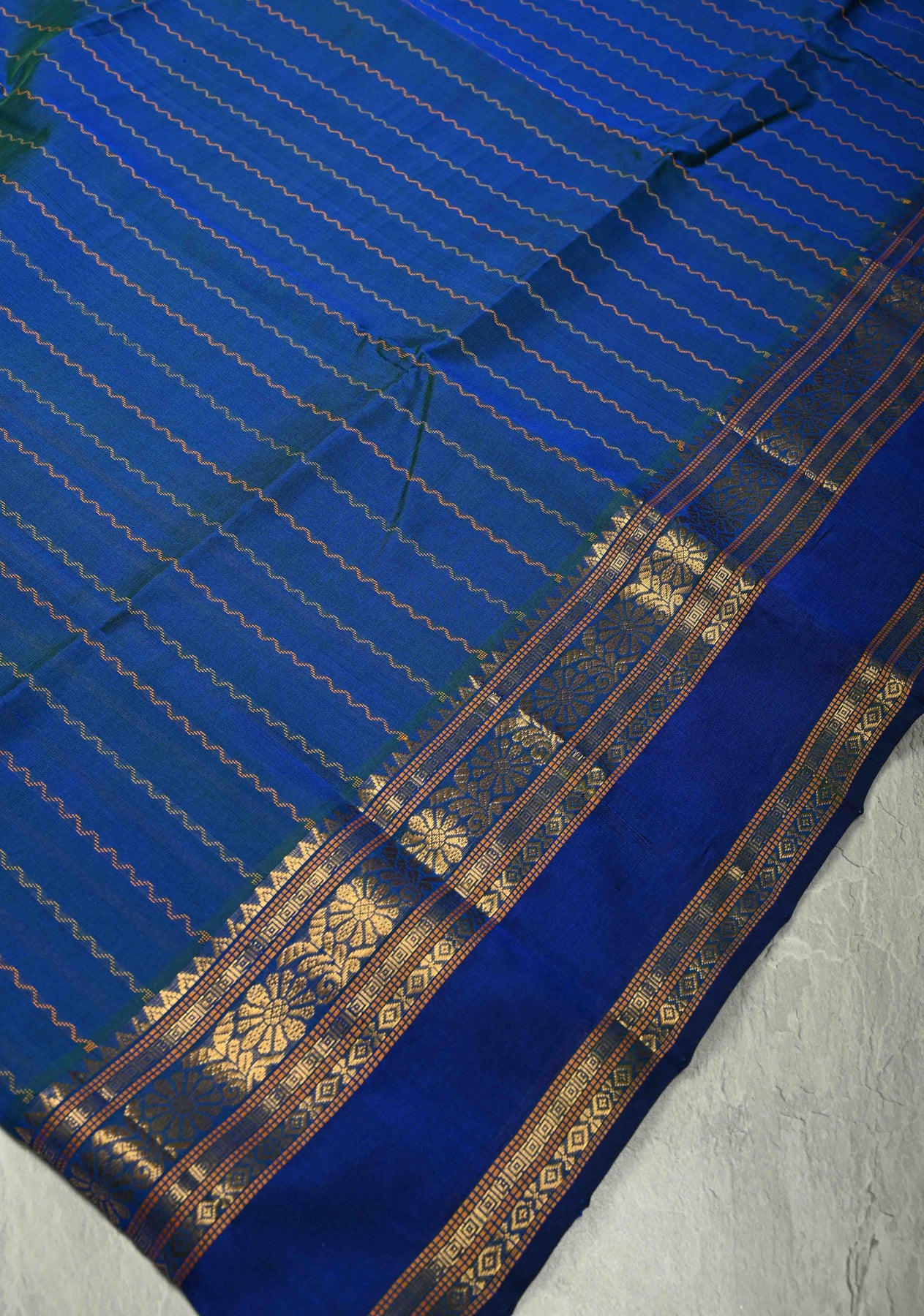 Drape yourself in timeless elegance with this Peacock Blue Dual Tone Kanchi Silk Cotton Saree, meticulously handwoven on 100% handloom looms. The saree features striking Vail Dhari stripes and a shimmering zari border, adding a regal touch to its graceful dual-tone body.
