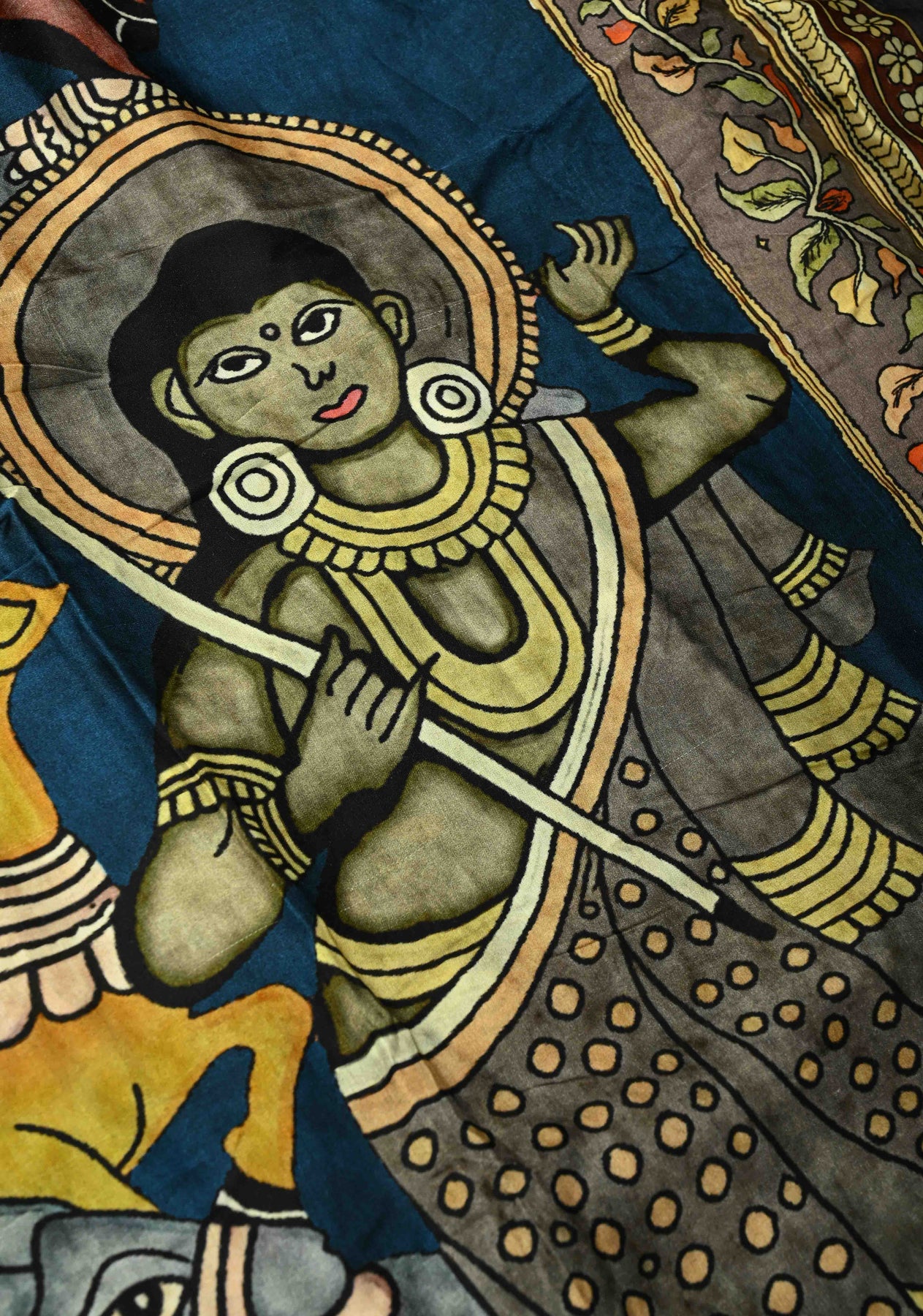 Step into a world of divine grace and artistic splendor with this Peacock Blue Gajji Silk Saree, adorned with a captivating Krishna Pichwai-themed Kalamkari digital print. Crafted from rich and lustrous Gajji silk, the saree drapes beautifully with a soft, fluid texture and a natural sheen that enhances its royal appeal. The body features intricate Kalamkari-style digital prints inspired by the traditional Pichwai art, depicting serene visuals of Lord Krishna, lotus blooms, and sacred motifs that narrate timeless tales of devotion. Framing this stunning artwork is a delicately hand-embellished Gotta Patti border, adding a touch of festive sparkle and traditional charm. Ideal for religious celebrations, weddings, and cultural events, this saree is a seamless fusion of heritage, elegance, and storytelling through fabric.